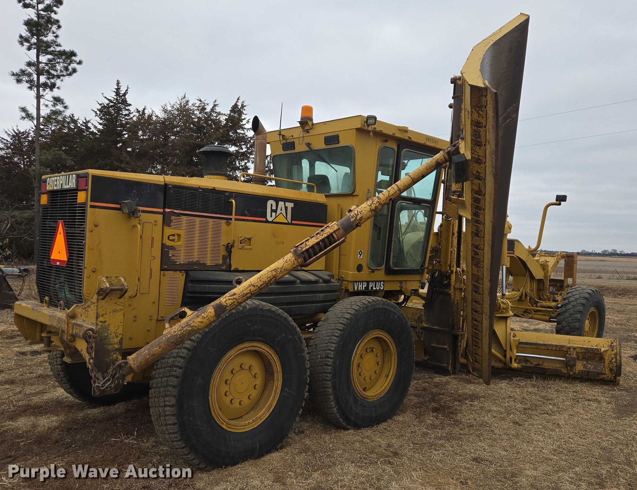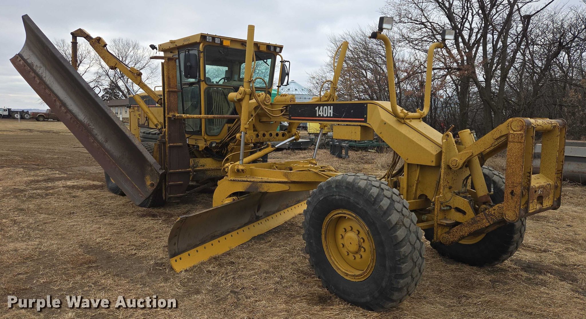 2005 Caterpillar 140H VHP Plus motor grader. Hours: 11,807 on meter, Serial: CAT0140HACCA01722. Engine Caterpillar 3176, Serial: 3PD14231, Cylinders: 6, Fuel type: Diesel. Transmission Powershift, 8F - 6R. Chassis Differential lock. Operators station Enclosed cab, AC, Heat, Hydraulic control valves: 11. Features Moldboard: Tip control, Side shift, Moldboard total width: 14', Front-mounted lift group Make: Caterpillar, Snow wing Caterpillar BWH12, Width: 12'. Tires Size: 14.00R24. Notes Glass cracked. Goose Lake Township. Lake Andes, SD 57356