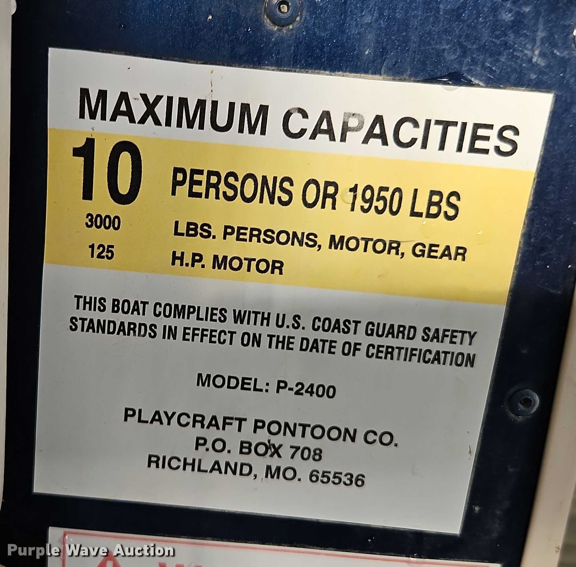 Purple Wave is selling a used Boat in Missouri. This item is a 2020 Playcraft Sport 2400 pontoon boat with the following: Length: 24', Hull ID: PLF97696F020, Unit #: 15