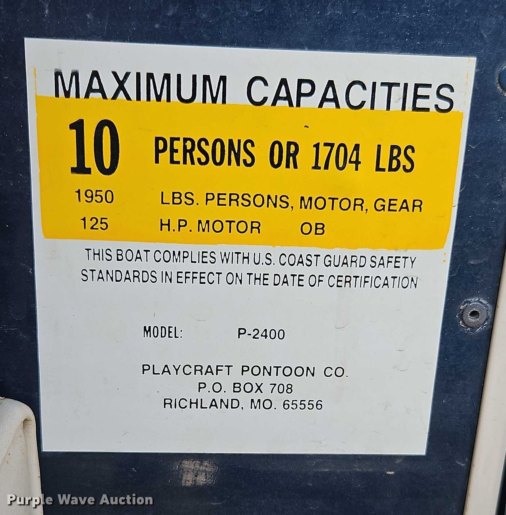 Purple Wave is selling a used Boat in Missouri. This item is a 2018 Playcraft Clipper 2400 pontoon boat with the following: Length: 24', Hull ID: PLF97452L718, Unit #: 2
