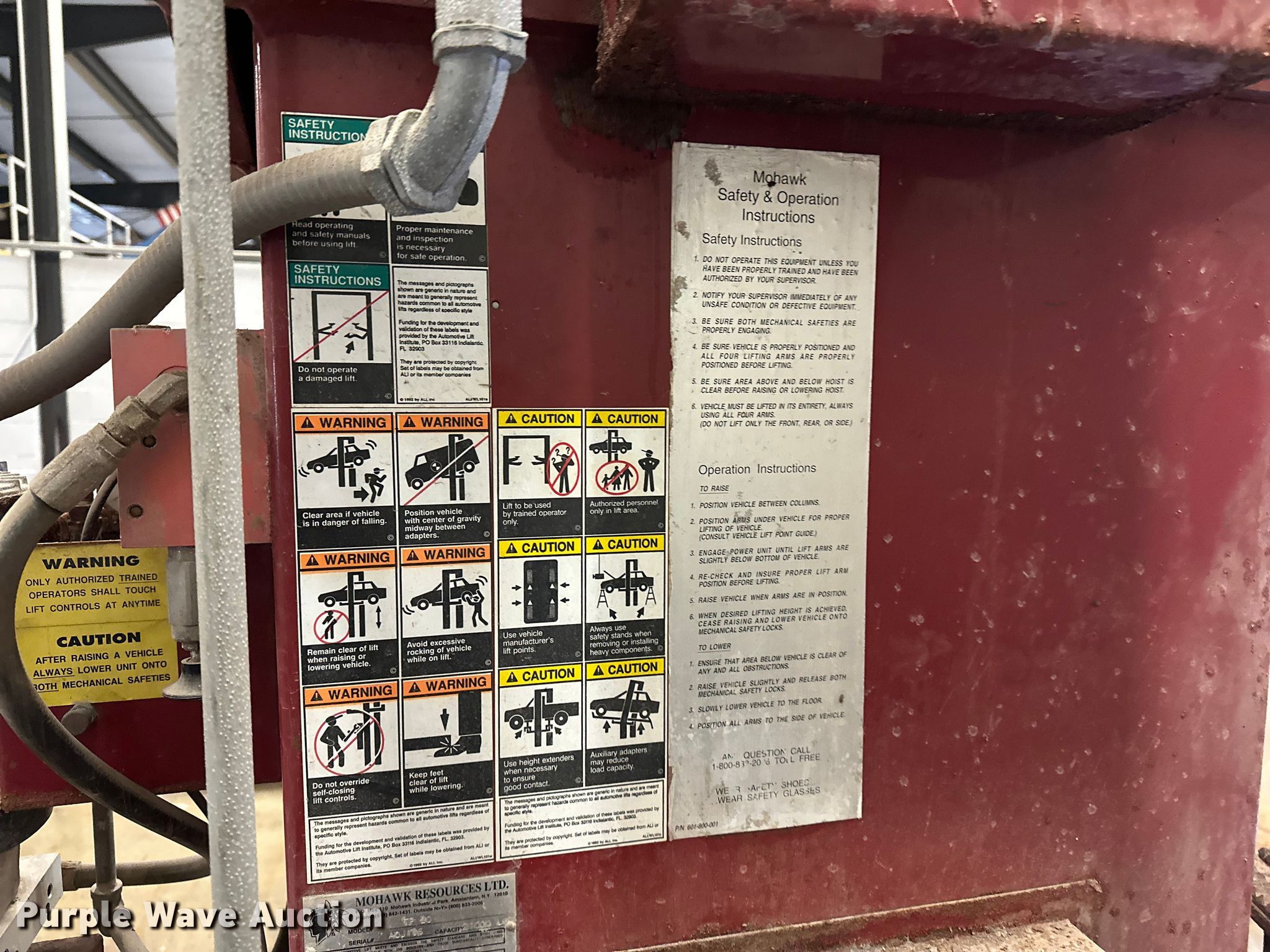 Purple Wave is selling a used Automotive Parts or Acces. in Missouri. This item is a Mohawk TP20 two post lift with the following: Serial: AOJ166, Capacity: 20000lb, Unknown operating condition