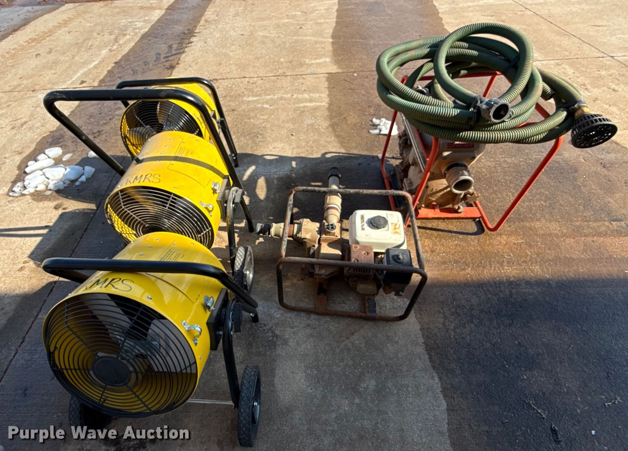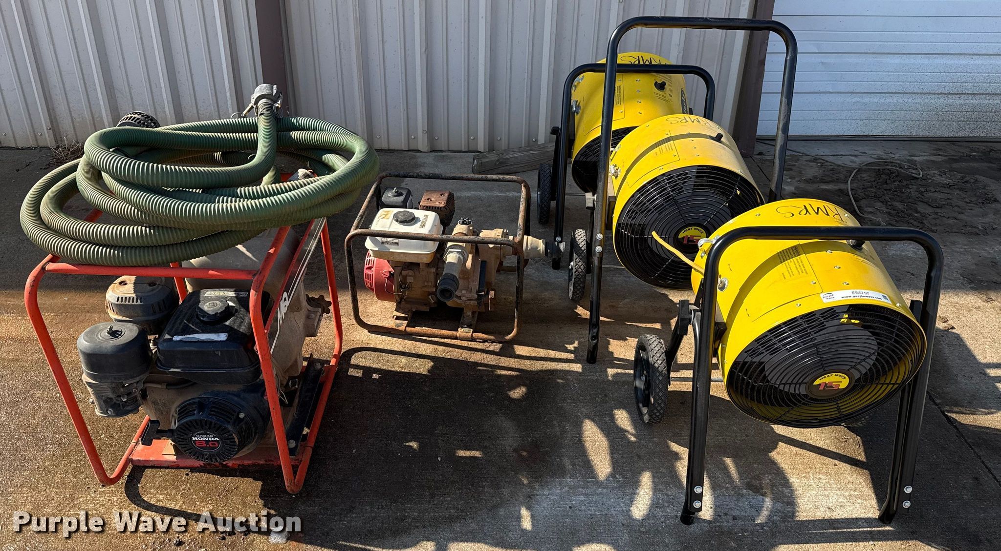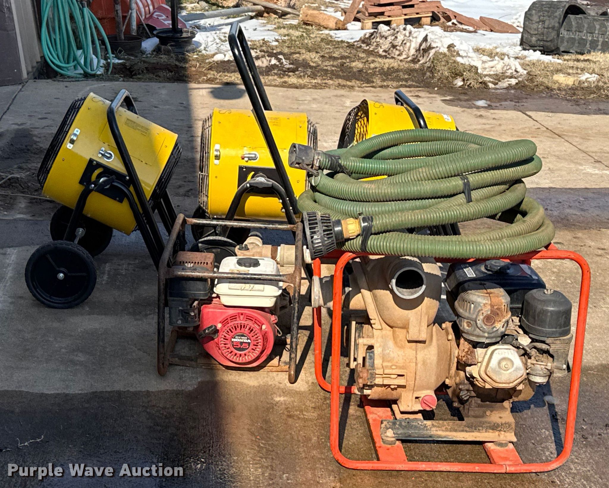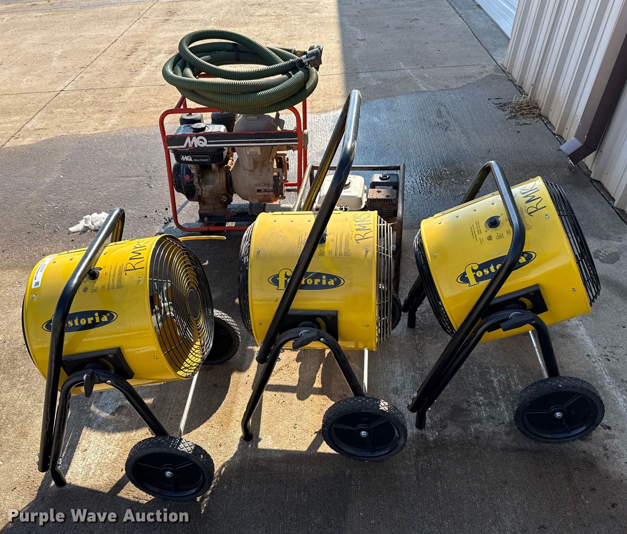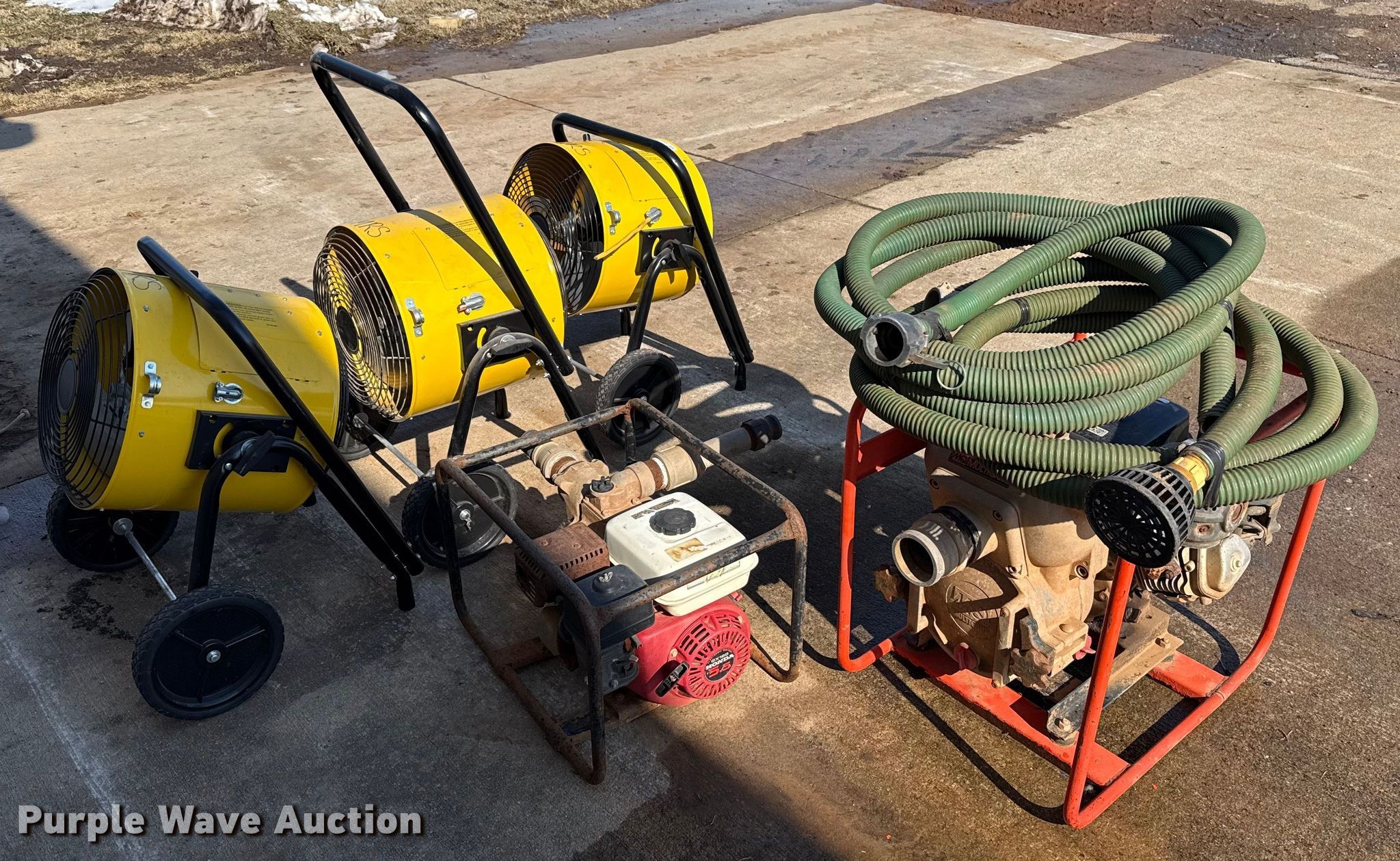 Purple Wave is selling a used Tools in Oklahoma. This item is a Tools with the following: (3) Fostoria 1548–3E portable heaters, Phase: Three, Volts: 480, MultiQuip water pump, Honda GX240 engine, Input: 3", Output: 3", Water pump, Honda GX160 engine