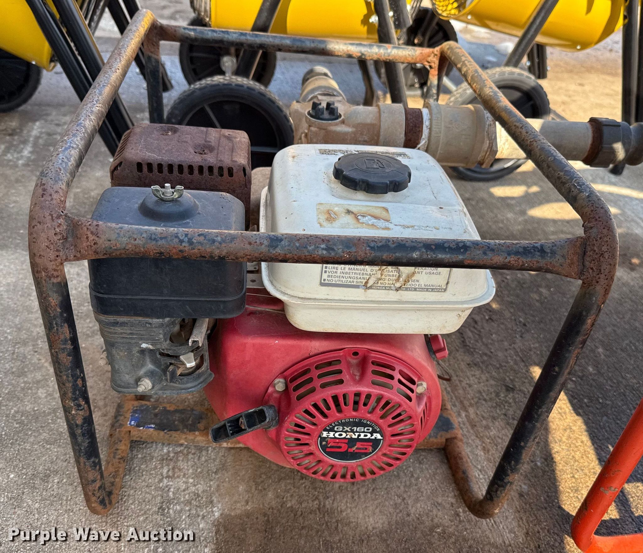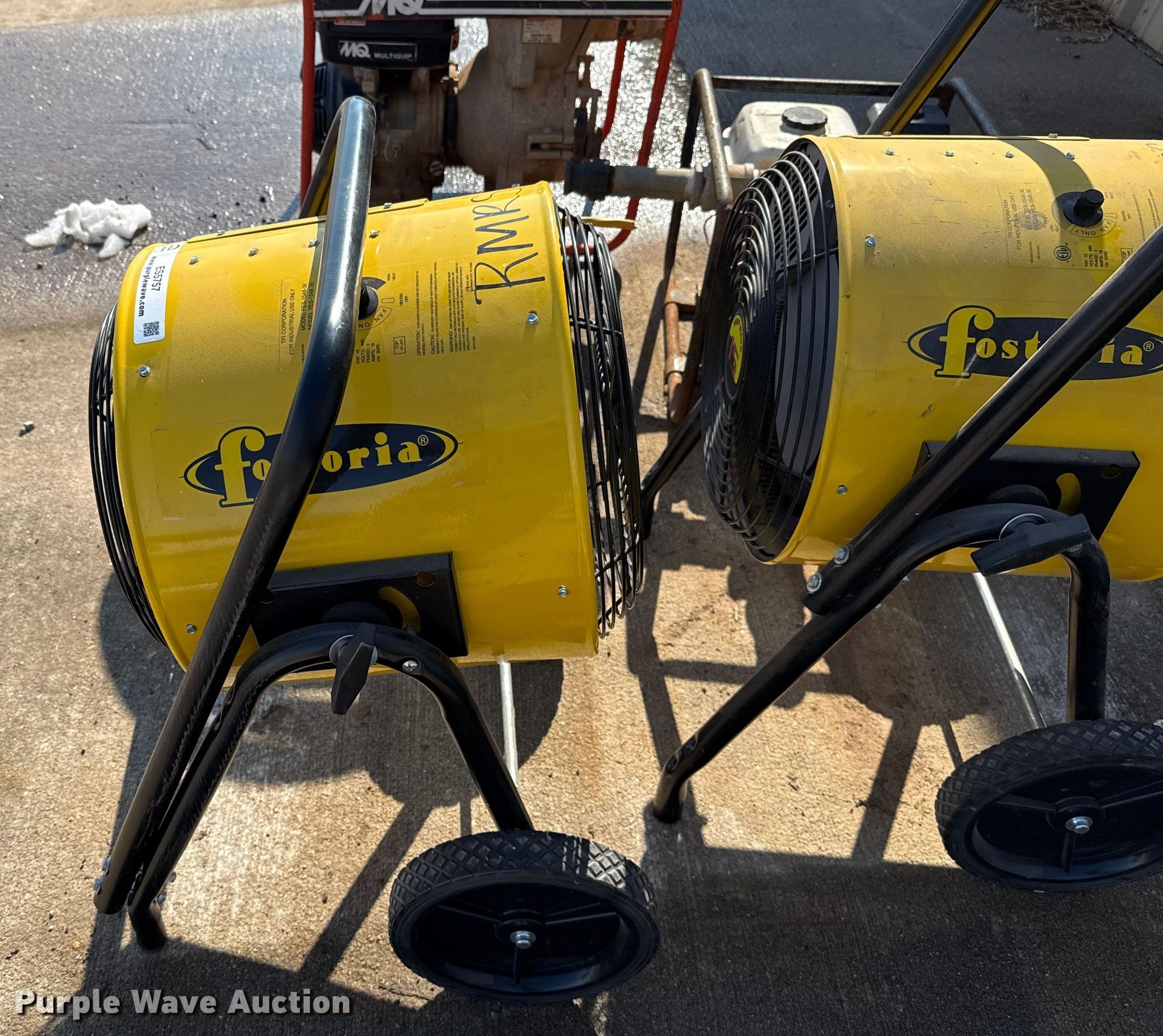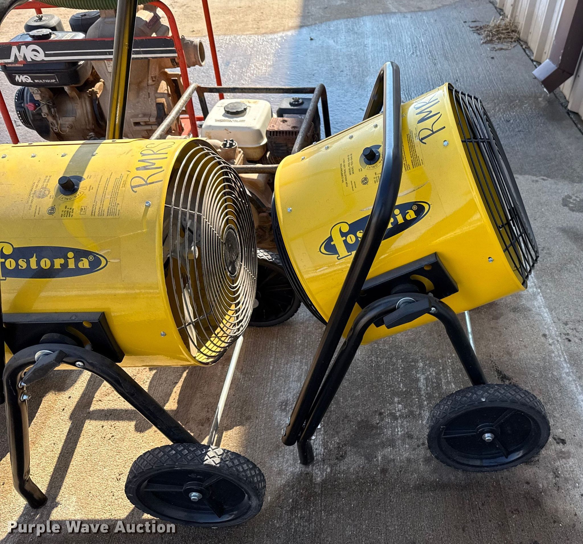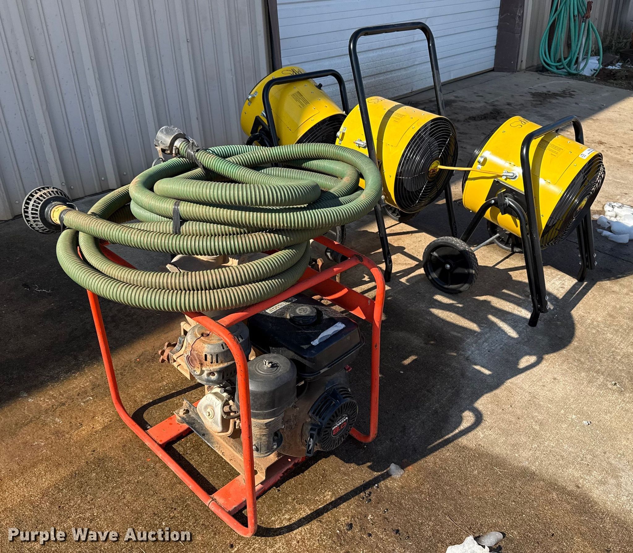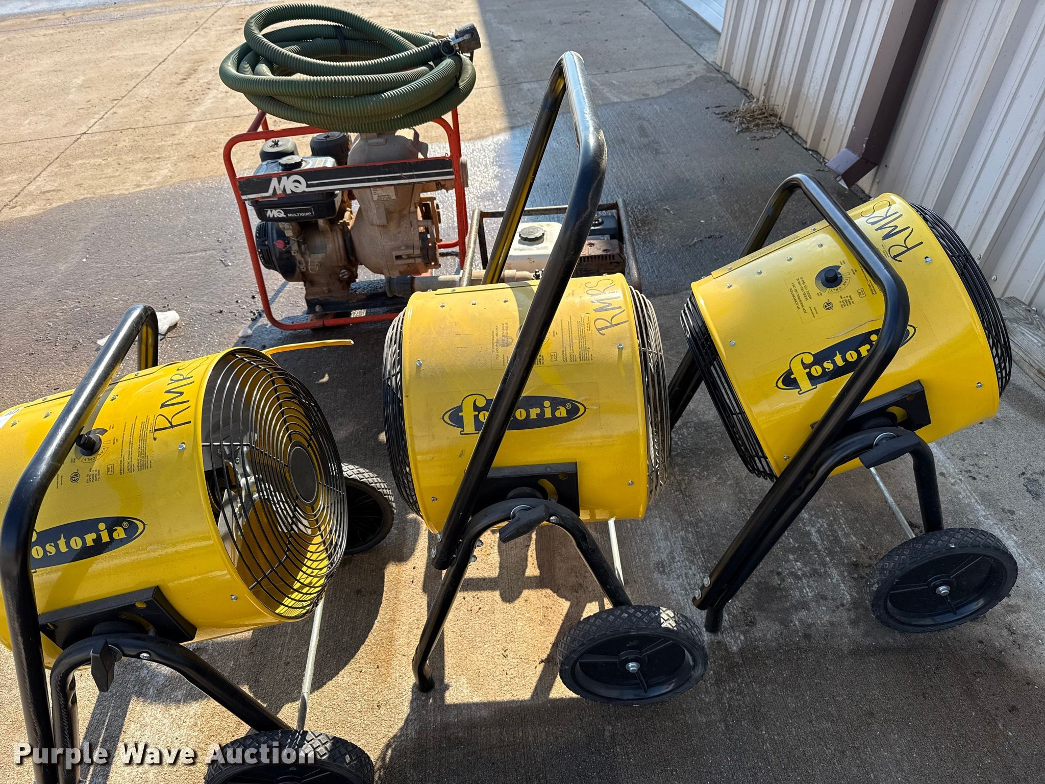 Purple Wave is selling a used Tools in Oklahoma. This item is a Tools with the following: (3) Fostoria 1548–3E portable heaters, Phase: Three, Volts: 480, MultiQuip water pump, Honda GX240 engine, Input: 3", Output: 3", Water pump, Honda GX160 engine