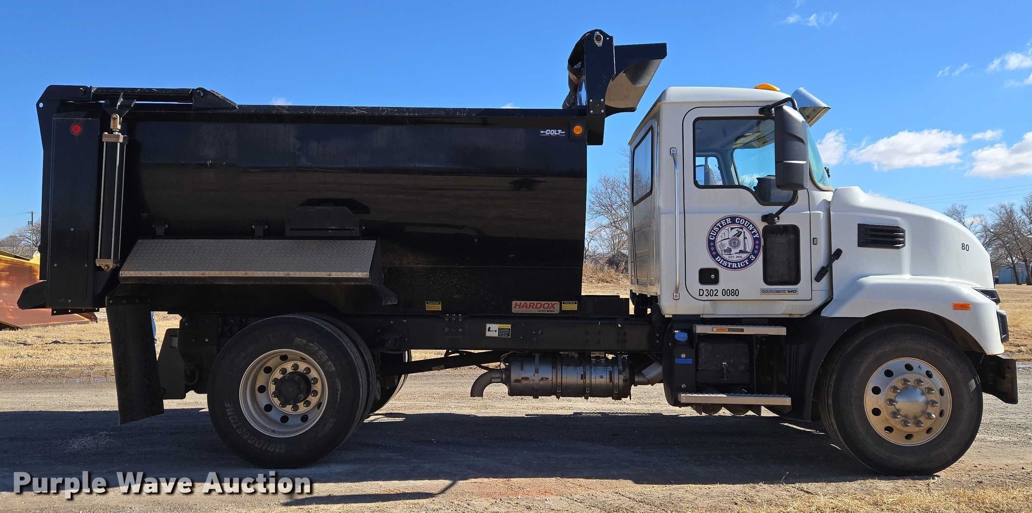 2022 Mack MD dump truck. Miles: 22,875 on odometer, Hours: 1,446 on meter, VIN: 1M2MDBAB8NS070497. Engine Cummins ISB, Displacement: 6.7L, Cylinders: 6, Fuel type: Diesel. Transmission Automatic. Chassis Axles: Single, Differential lock: Inter-axle, Suspension: Spring, Brakes: Air, PTO, GVWR: 32,995 lbs FAWR: 12,000 lbs, RAWR: 21,000 lbs. Interior AC, Heat, Heated mirrors, Power windows, Cruise control, Brake controller. Features Bed Dump bed, Colt 12 ERV 188, Serial: 21ERB120949, Length: 12' 5", Width: 8', Side height: 60", Bed type: Steel, Roll tarp, Ram: Single, End gate: Air operated. Tires Size: 11R22.5. Oklahoma title. Title distribution may be delayed up to 30 days from verification of funds. Custer County - District 3. Butler, OK 73625