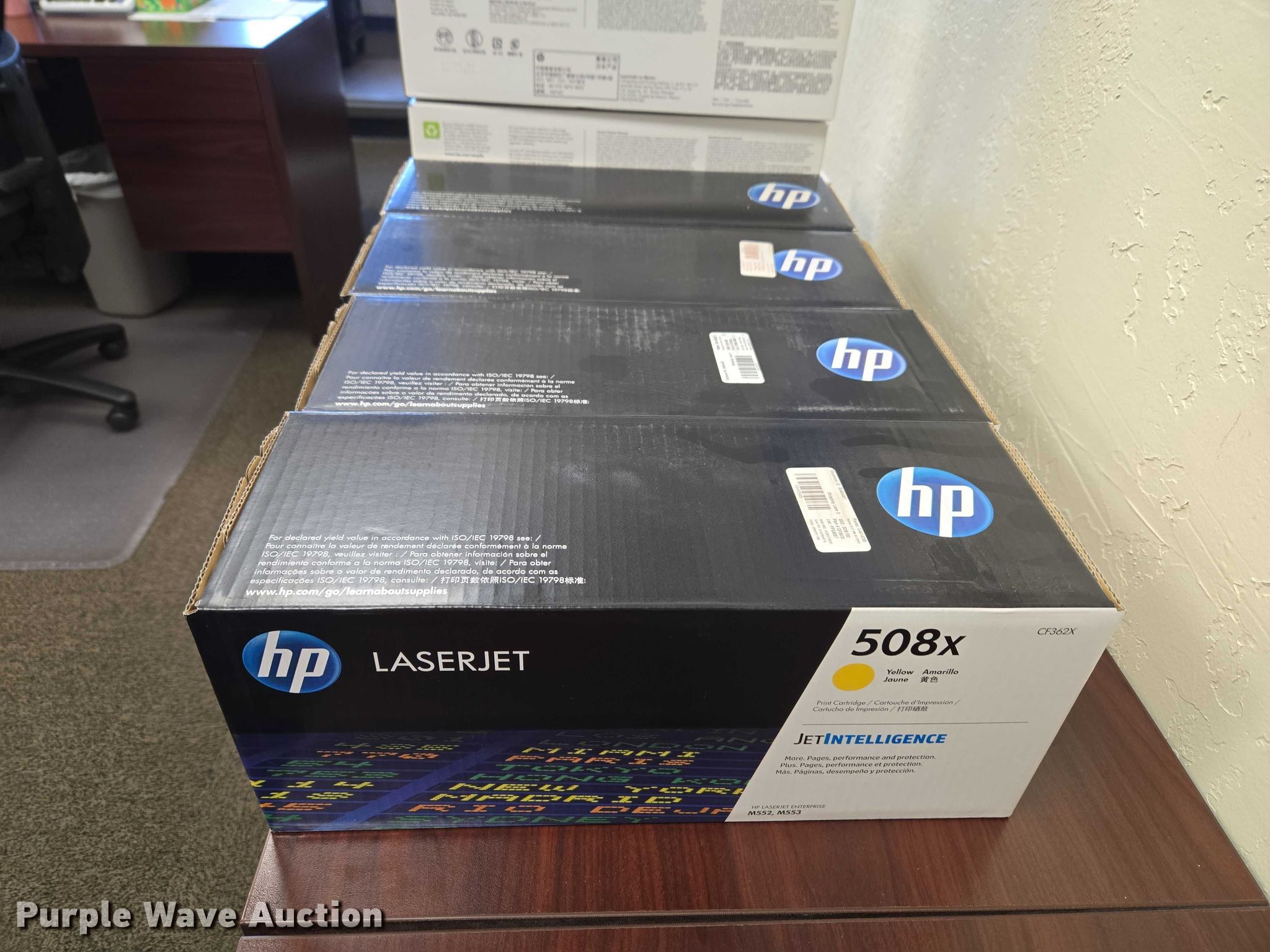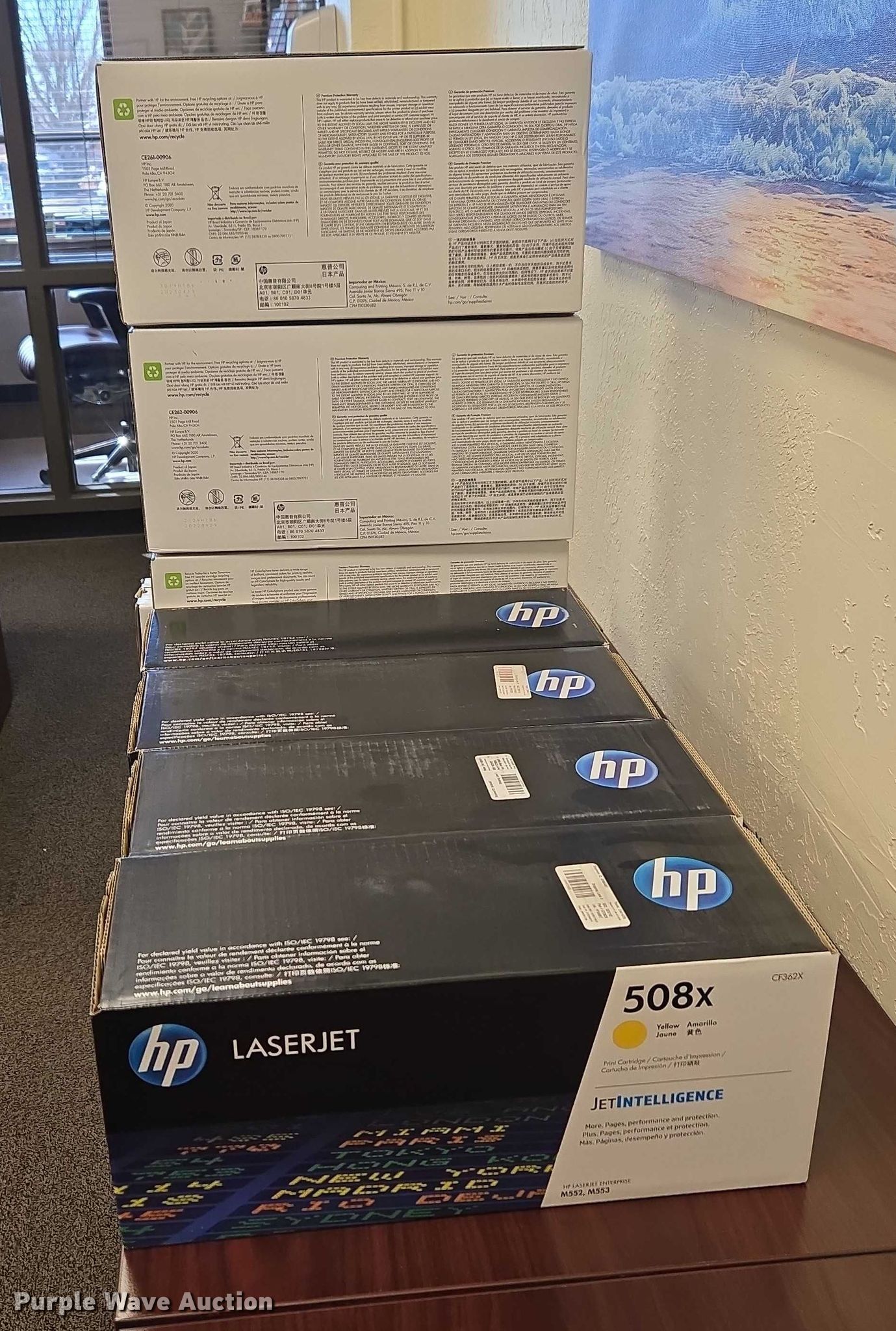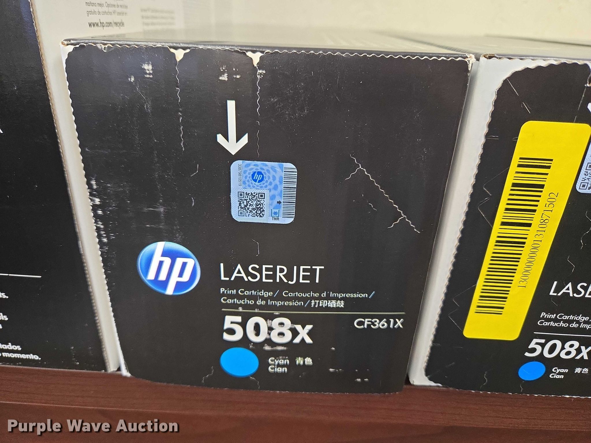 Purple Wave is selling a used Office Supplies and Equip. in Oklahoma. This item is a (8) printer cartridges with the following: Serials:, CE262A, CE263A, CE261A, CF361X, CF362X, CF363X