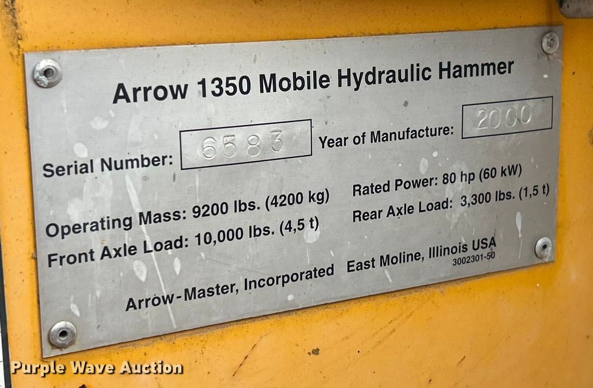 Purple Wave is selling a used Breaker or Hammer in Missouri. This item is a 2000 Arrow 1350 breaker with the following: Hours: 986 on meter, Serial: 6583