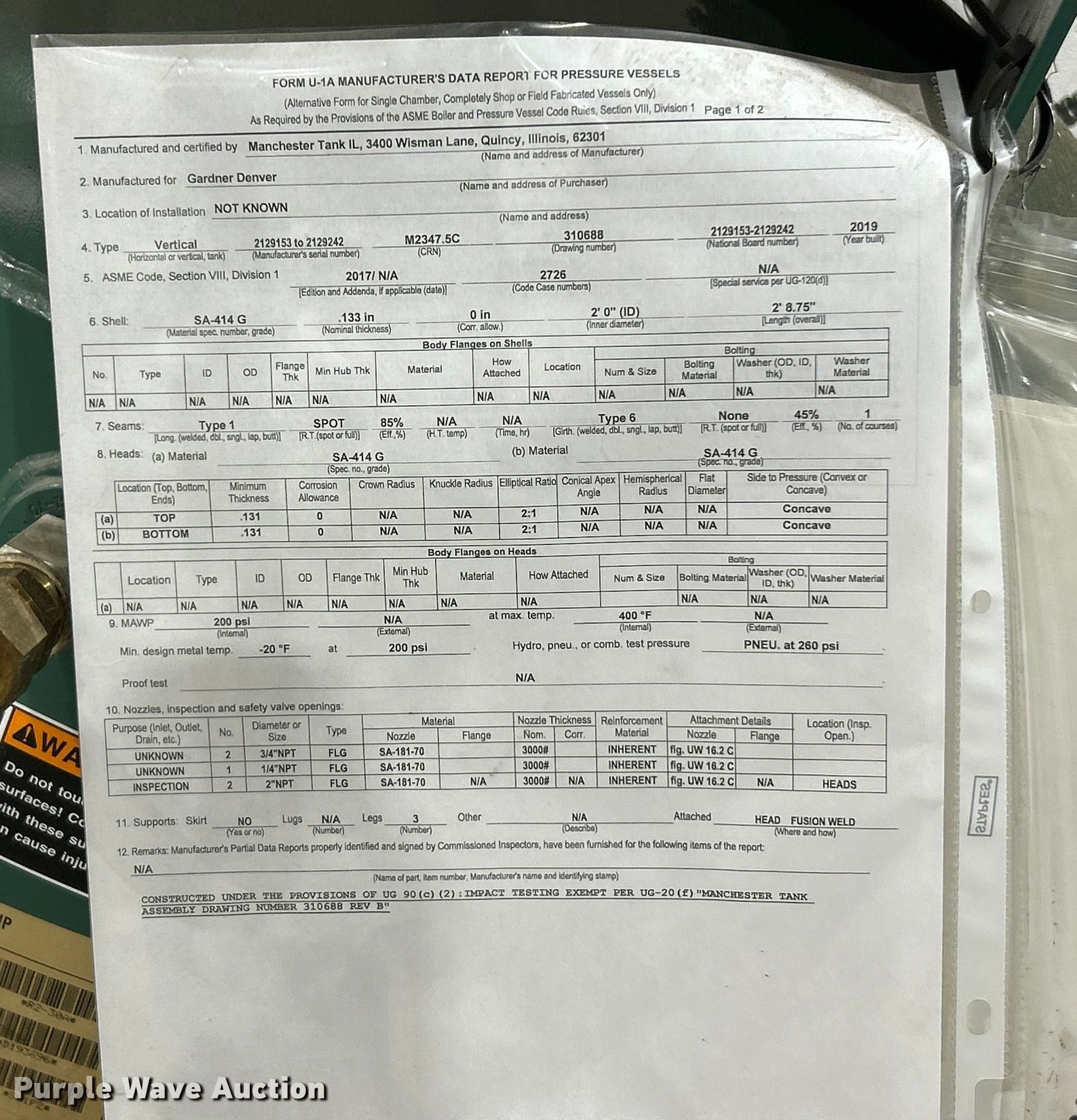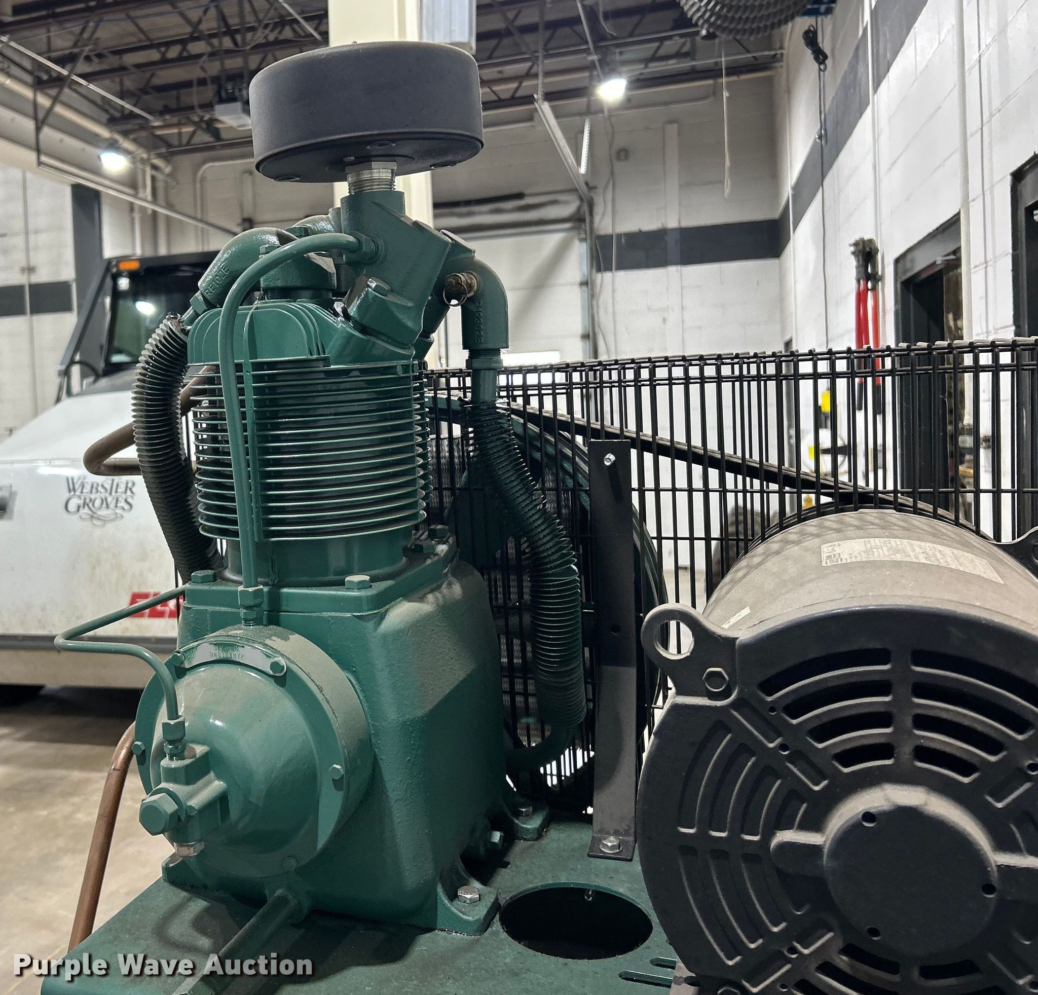 Champion VR7F-8 air compressor. Serial: D193696. Electric Motor Weg 00718OT3E213T-S Serial: 1046982014, HP: 7.5, kW: 5.5, Volts: 230/460, Phase: Three. Features Air compressor PSI: 175, Tank capacity: 80 gallons. Notes Tank issues, pin hole air leak. City of Webster Groves, MO. Webster Groves, MO 63119