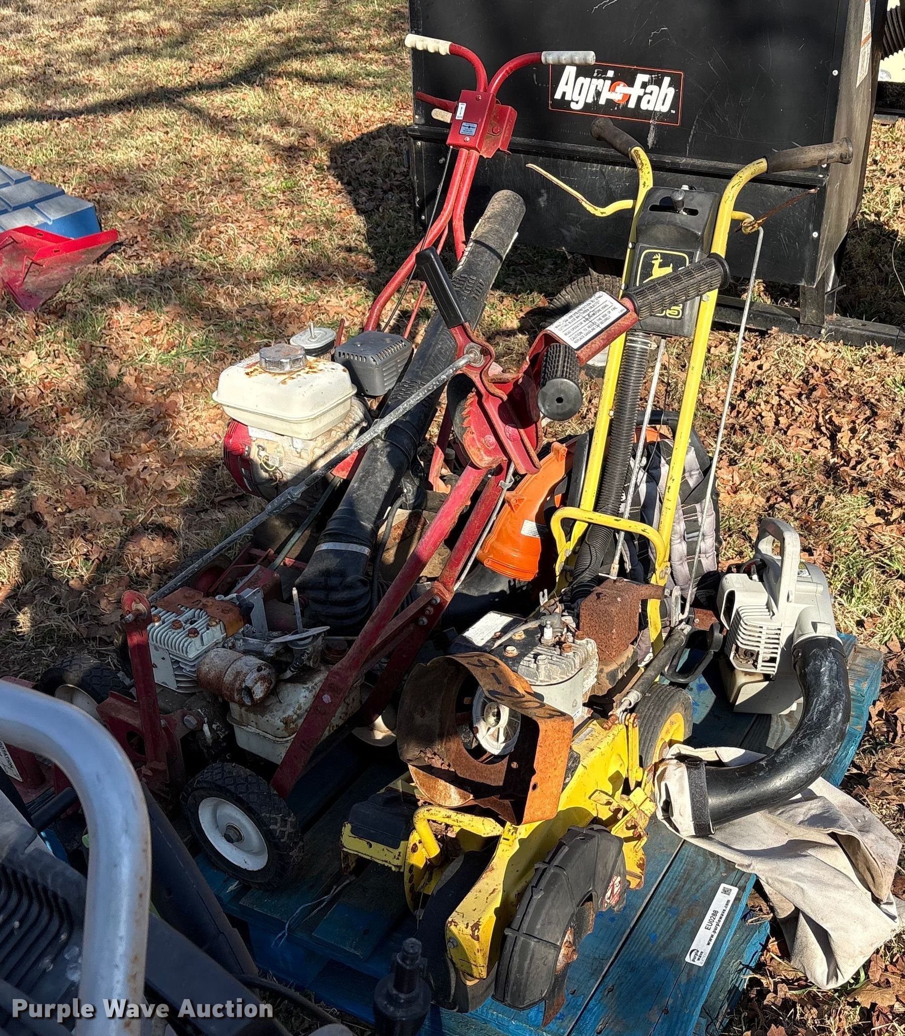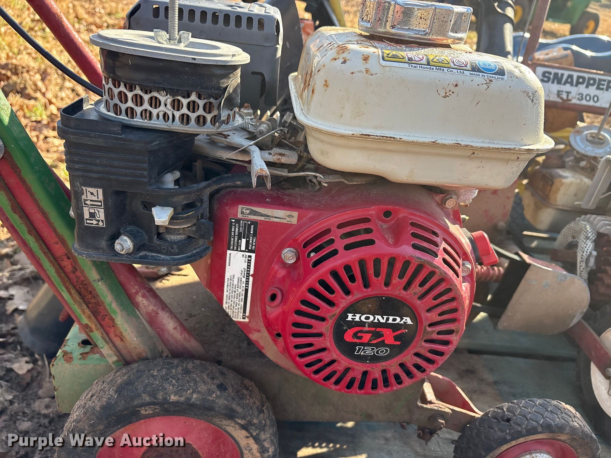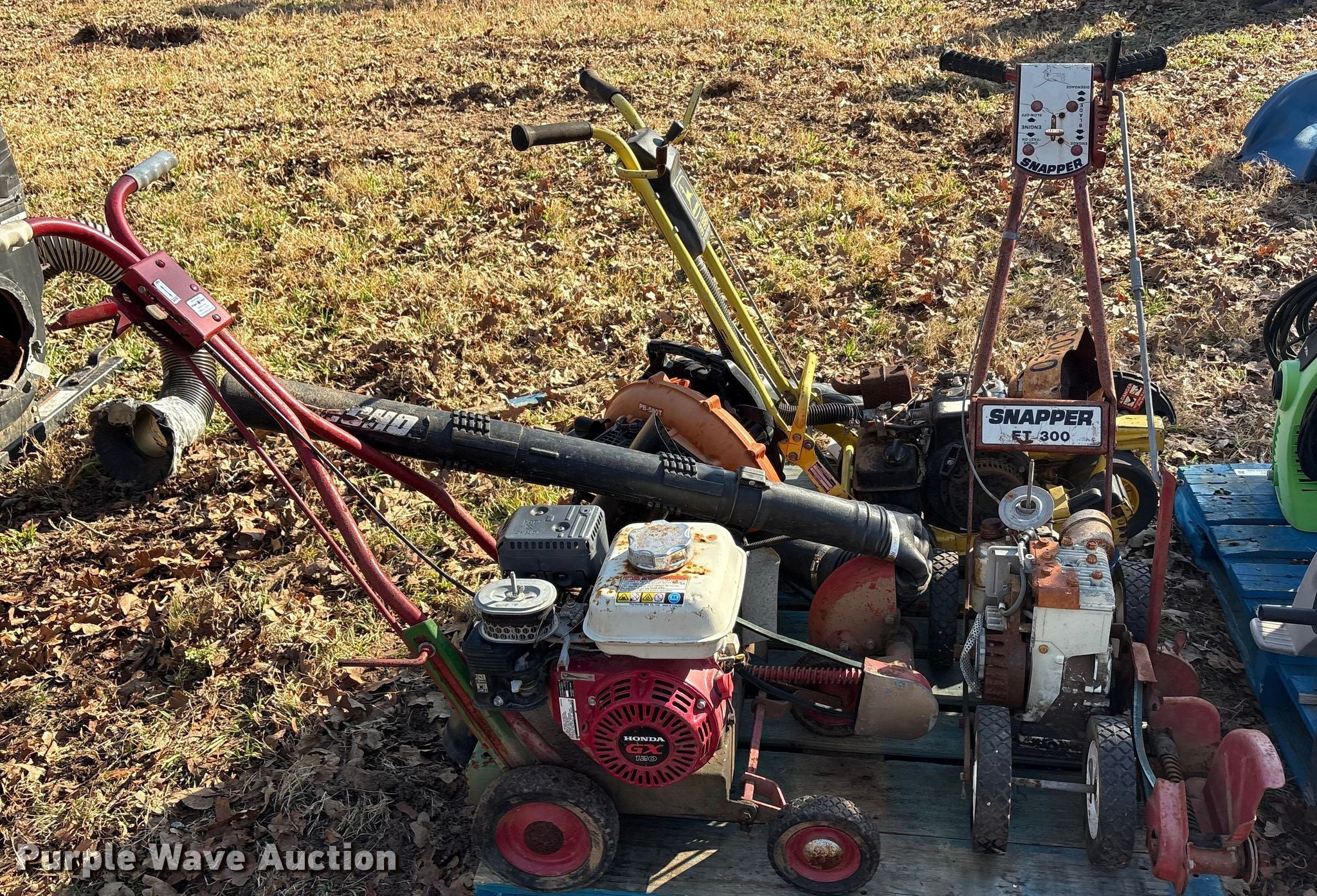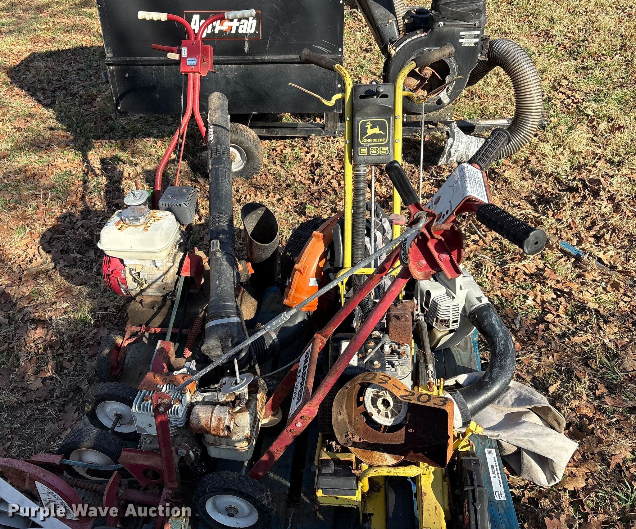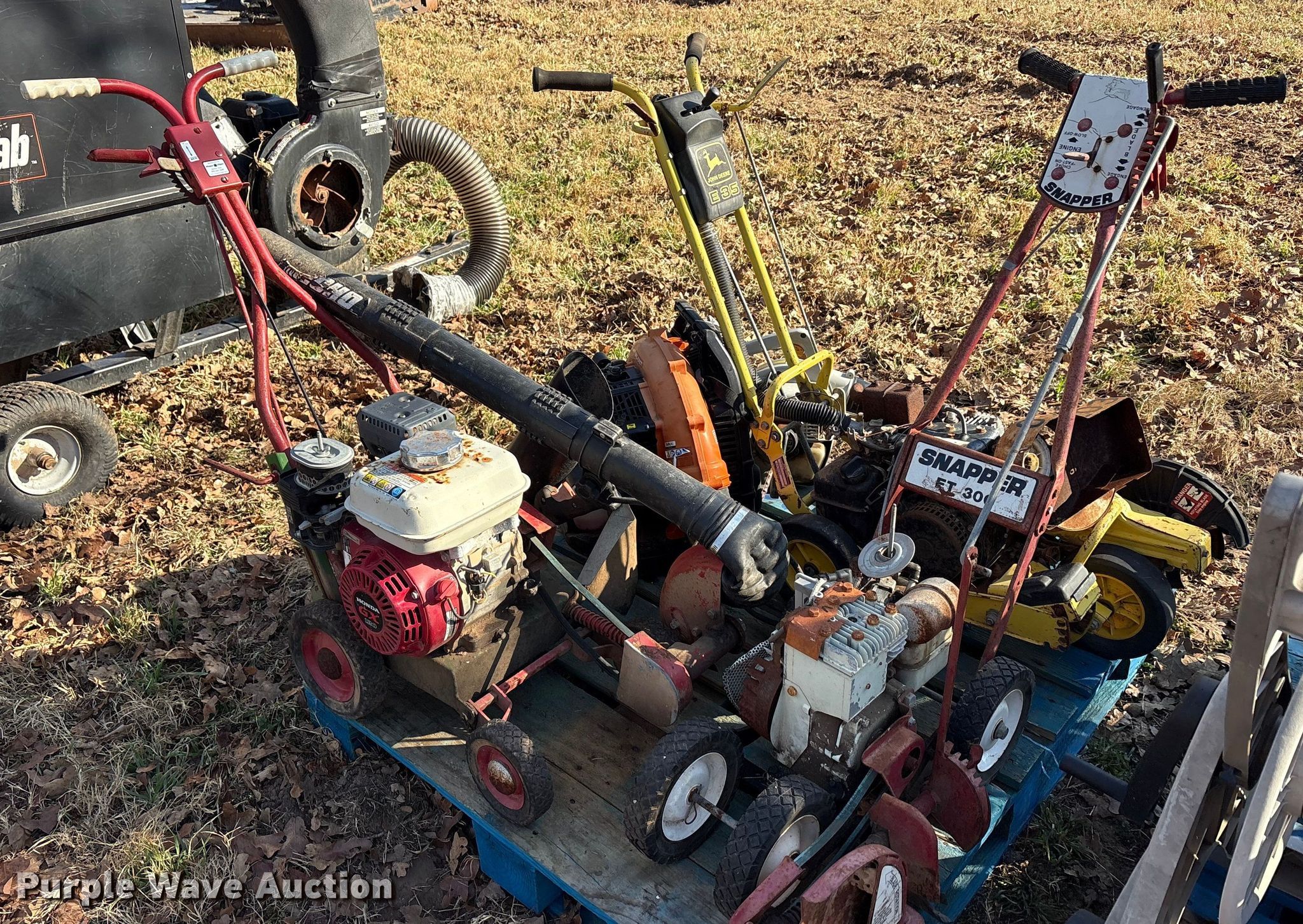Purple Wave is selling a used Lawn and Garden in Oklahoma. This item is a Lawn equipment with the following: John Deere E35 edger, Cylinders: 1, 066290T engine, Engine disassembled, Non-operational unit, Whipper Clipper, Honda GX 120 engine, Displacement: 119 cc, Cylinders: 1, Edger blade missing, Engine disassembled, parts missing, Non-operational unit, Snapper Et300 edger, Cylinder: 1, Engine parts missing, Edger blade missing, Echo ES-10000 handheld leaf vac, Cylinders: 1, Echo PB-580T back pack leaf blower, Cylinders: 2, Non-operational unit