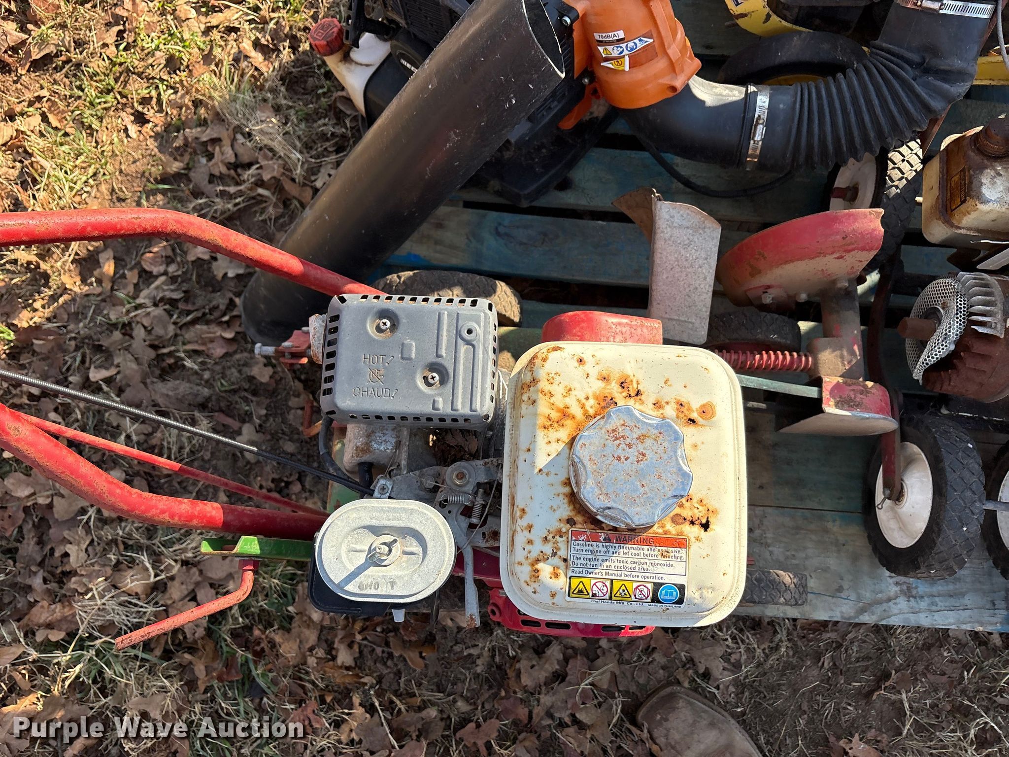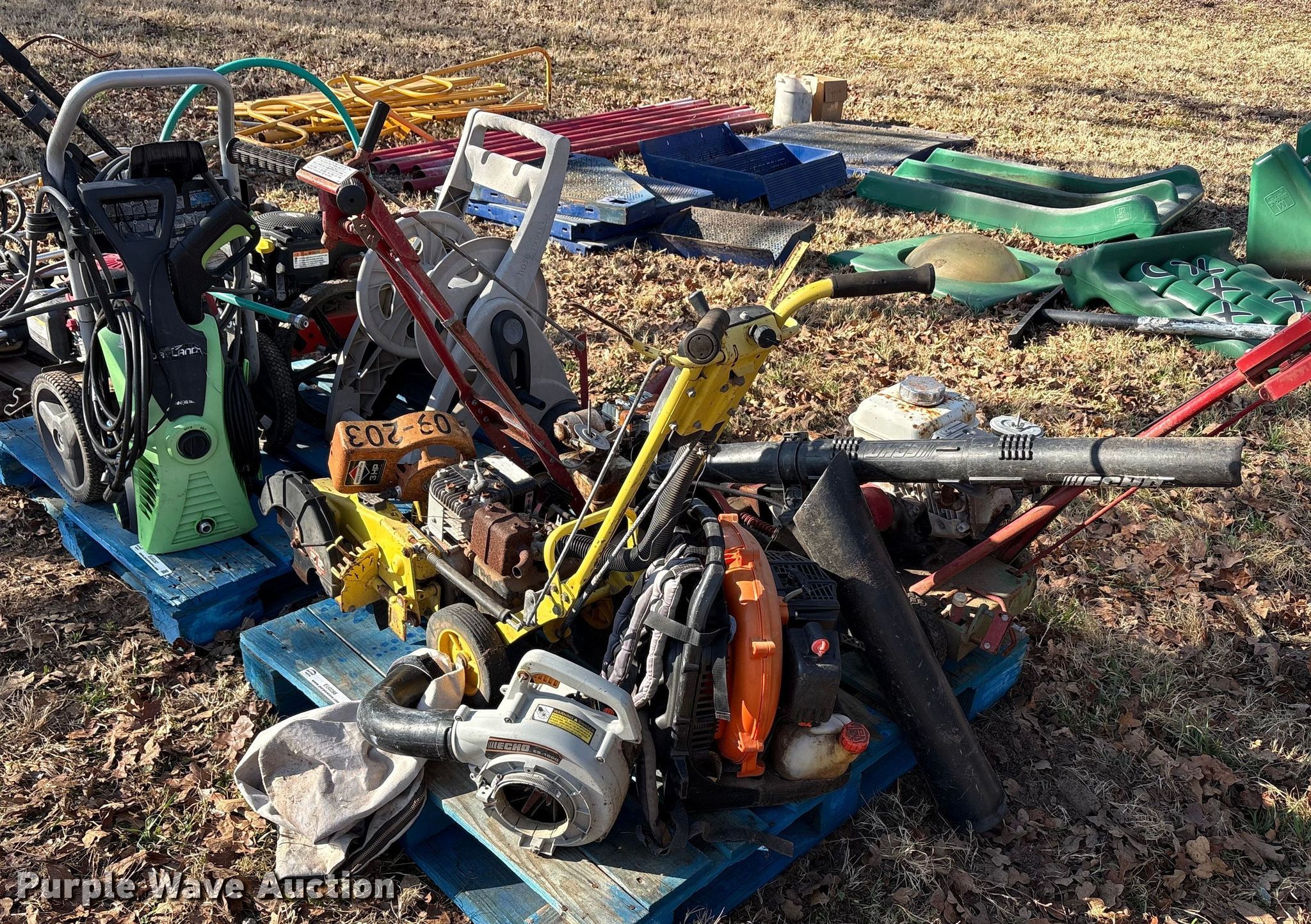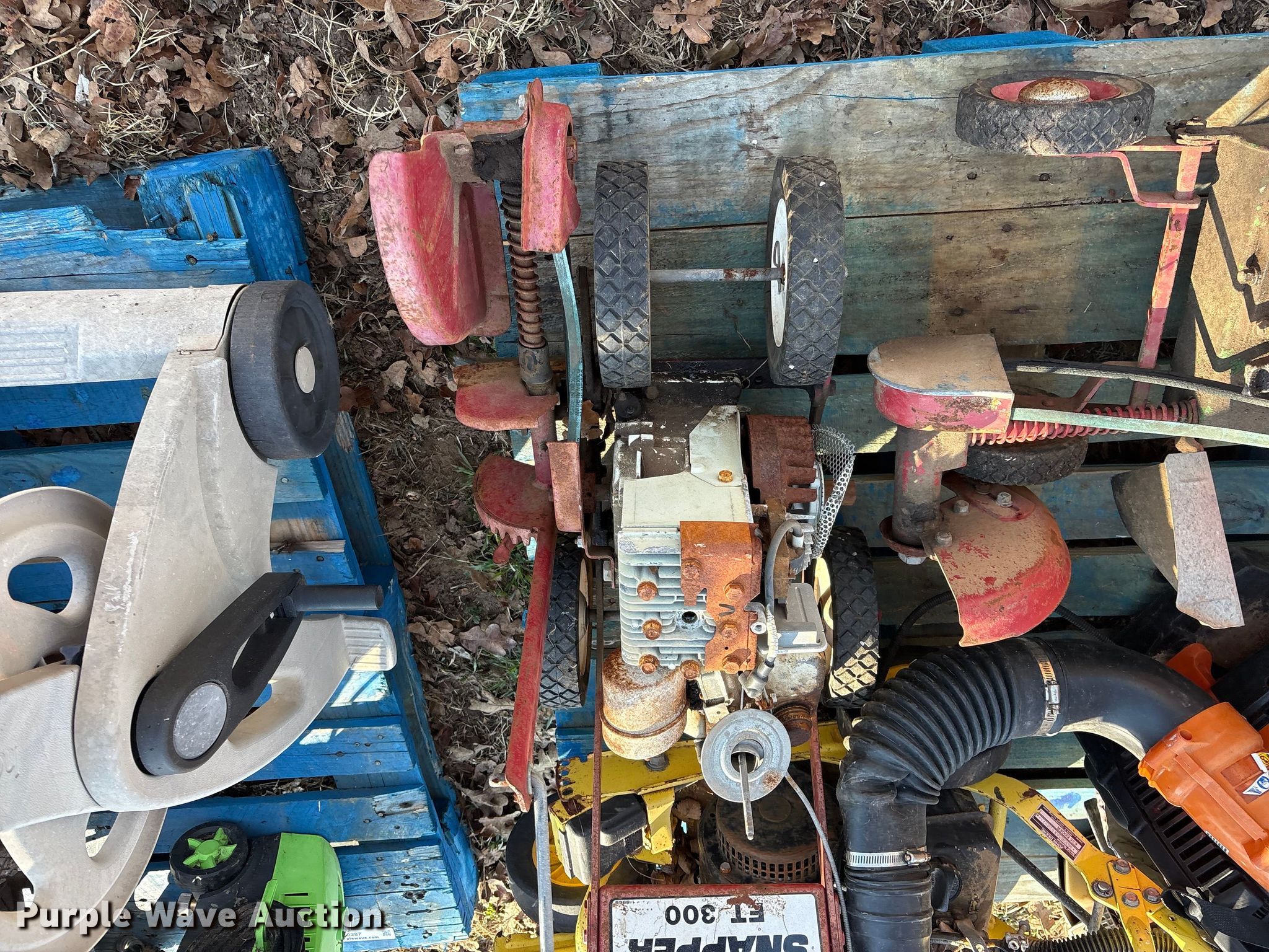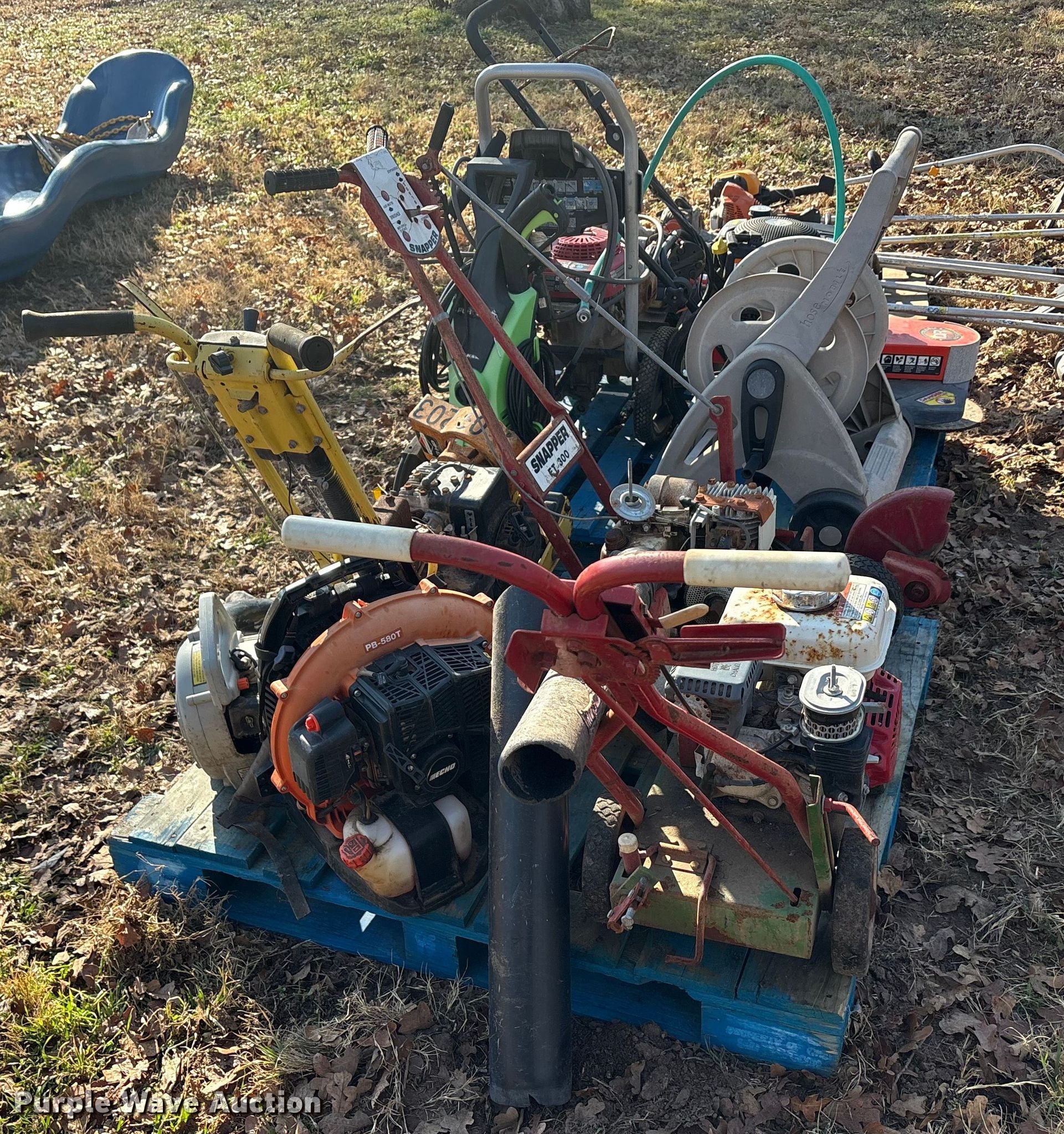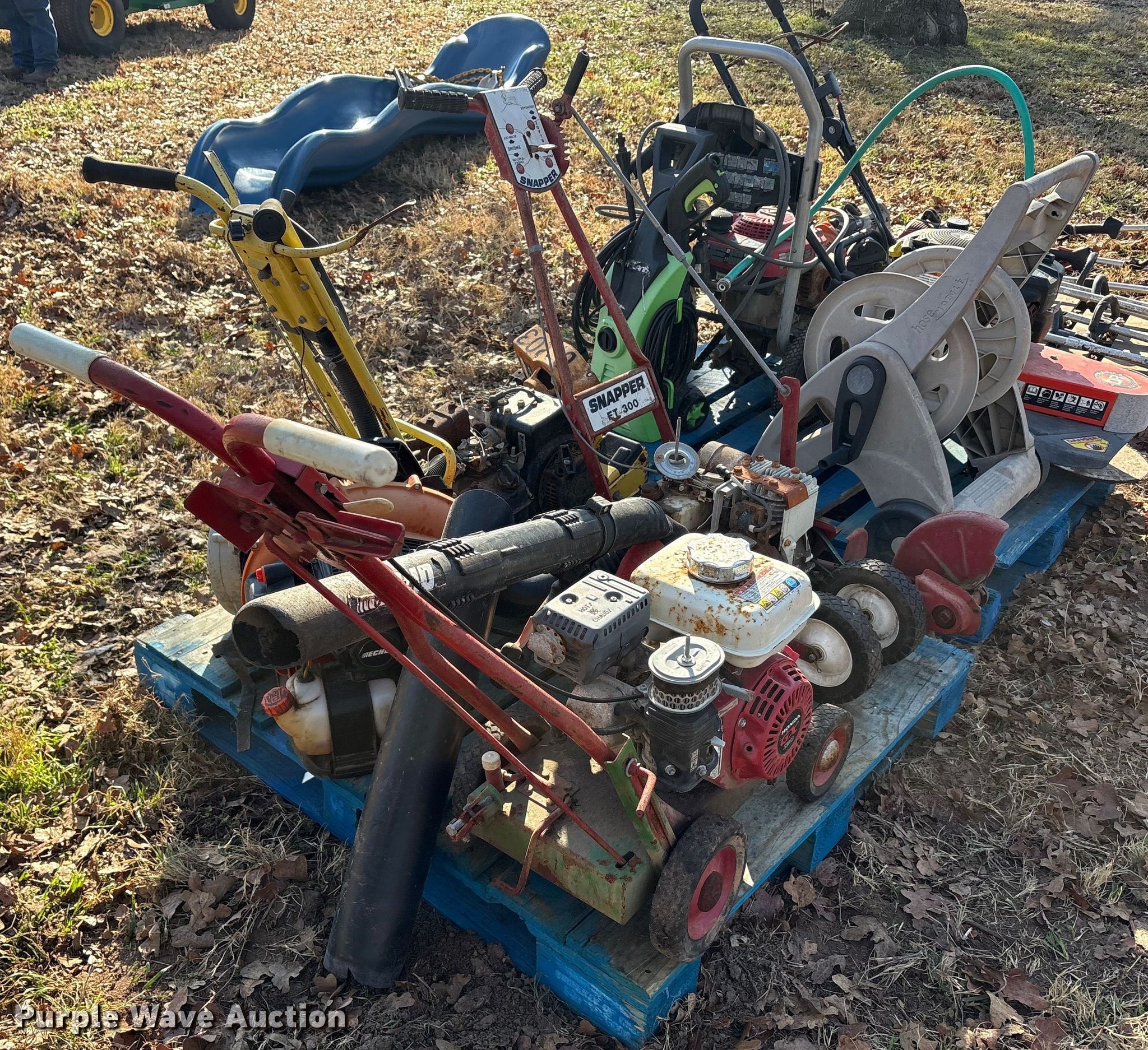 Purple Wave is selling a used Lawn and Garden in Oklahoma. This item is a Lawn equipment with the following: John Deere E35 edger, Cylinders: 1, 066290T engine, Engine disassembled, Non-operational unit, Whipper Clipper, Honda GX 120 engine, Displacement: 119 cc, Cylinders: 1, Edger blade missing, Engine disassembled, parts missing, Non-operational unit, Snapper Et300 edger, Cylinder: 1, Engine parts missing, Edger blade missing, Echo ES-10000 handheld leaf vac, Cylinders: 1, Echo PB-580T back pack leaf blower, Cylinders: 2, Non-operational unit