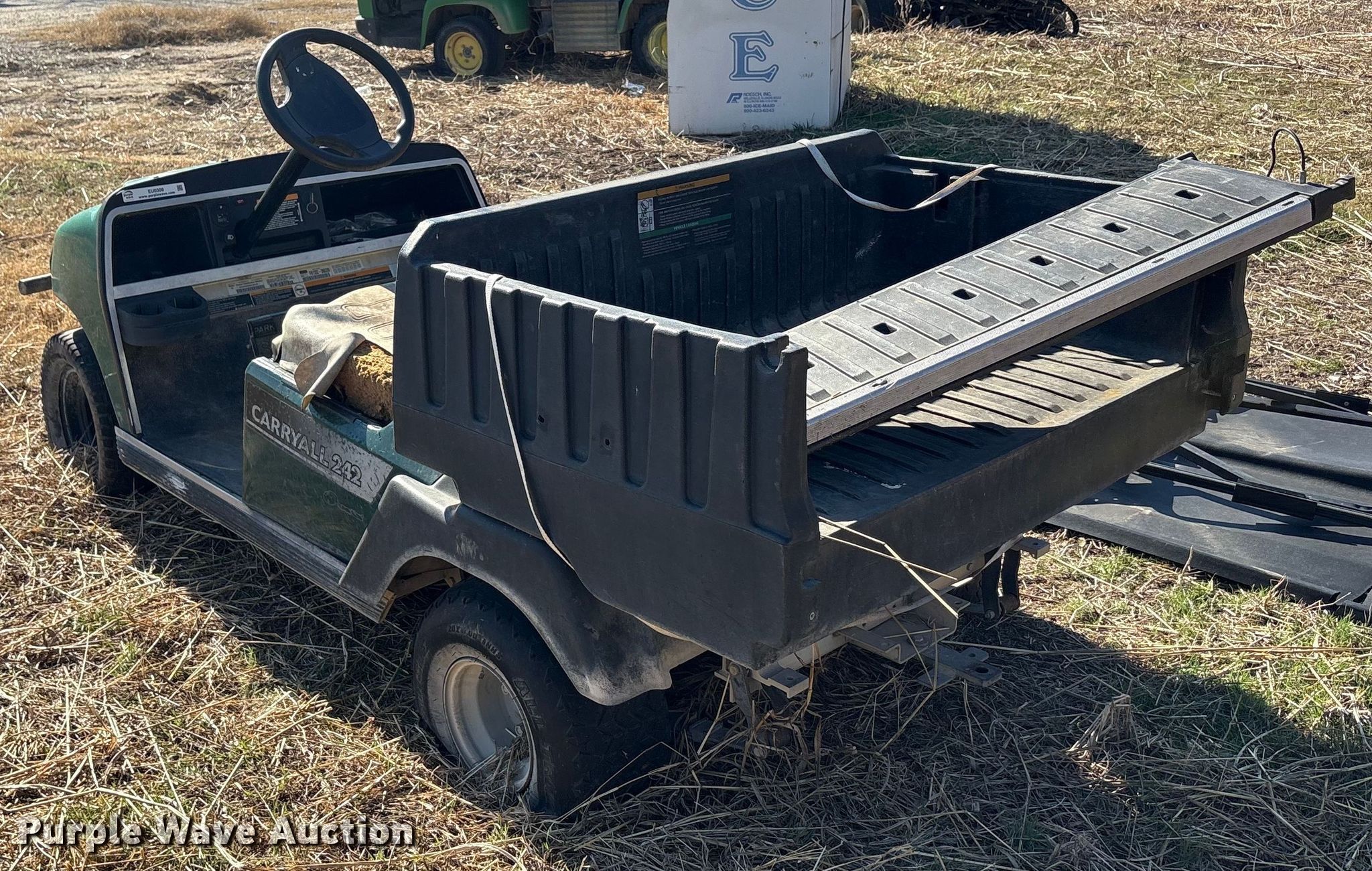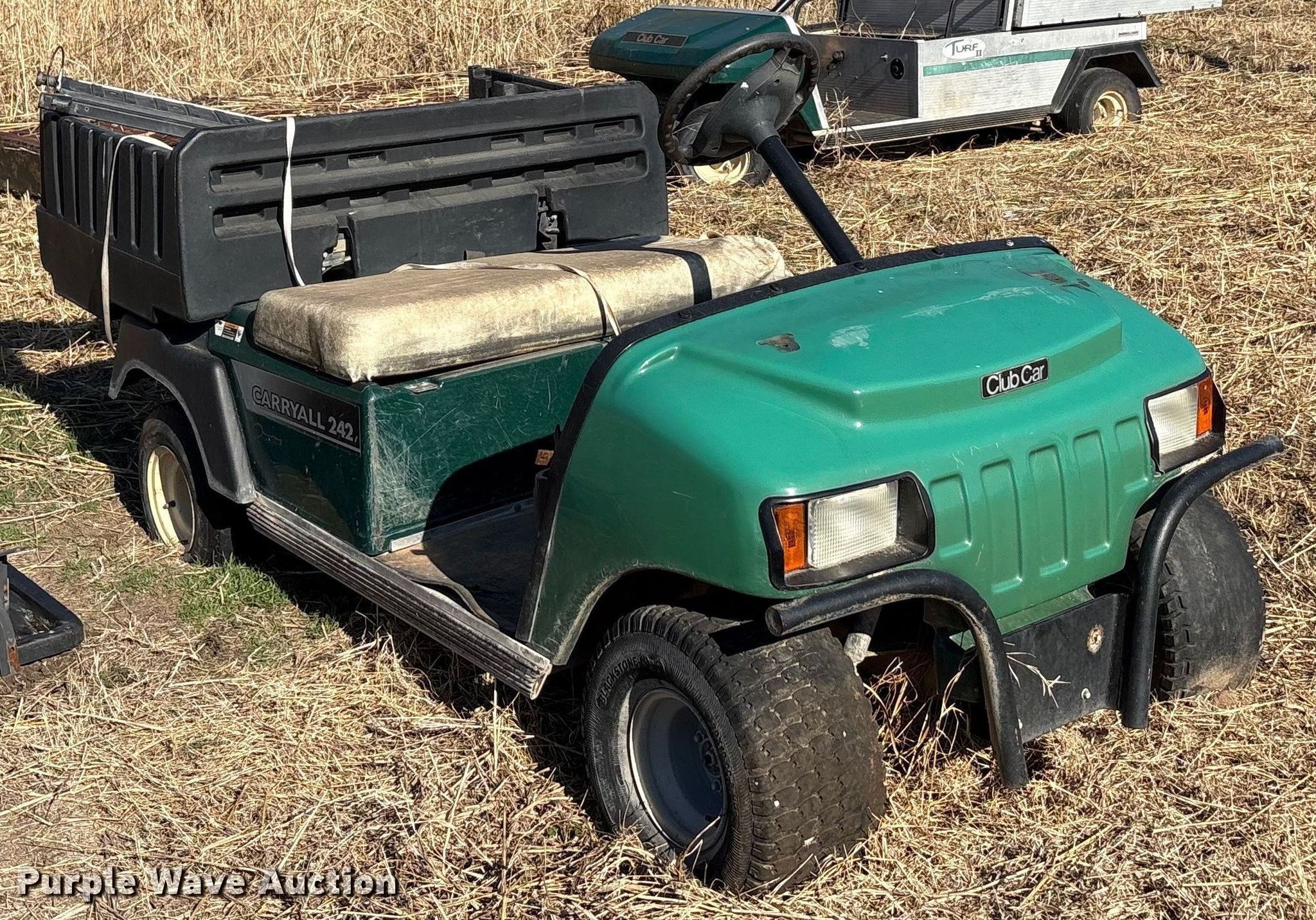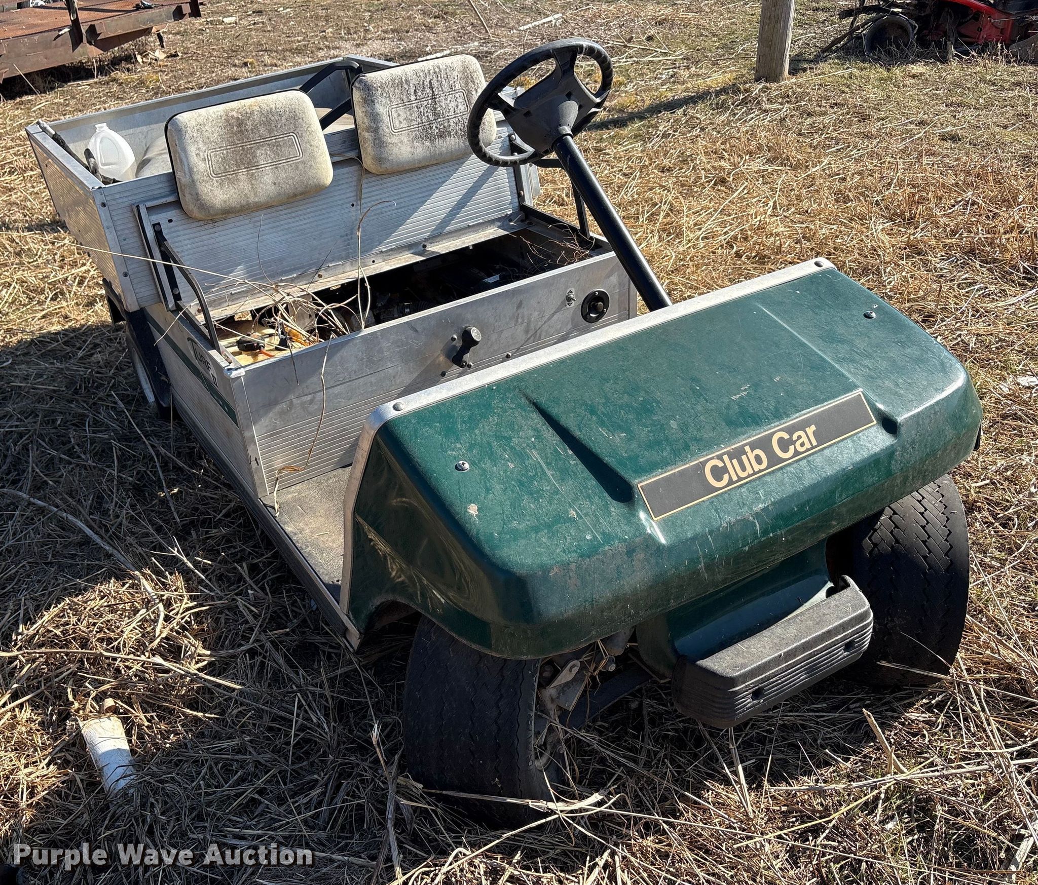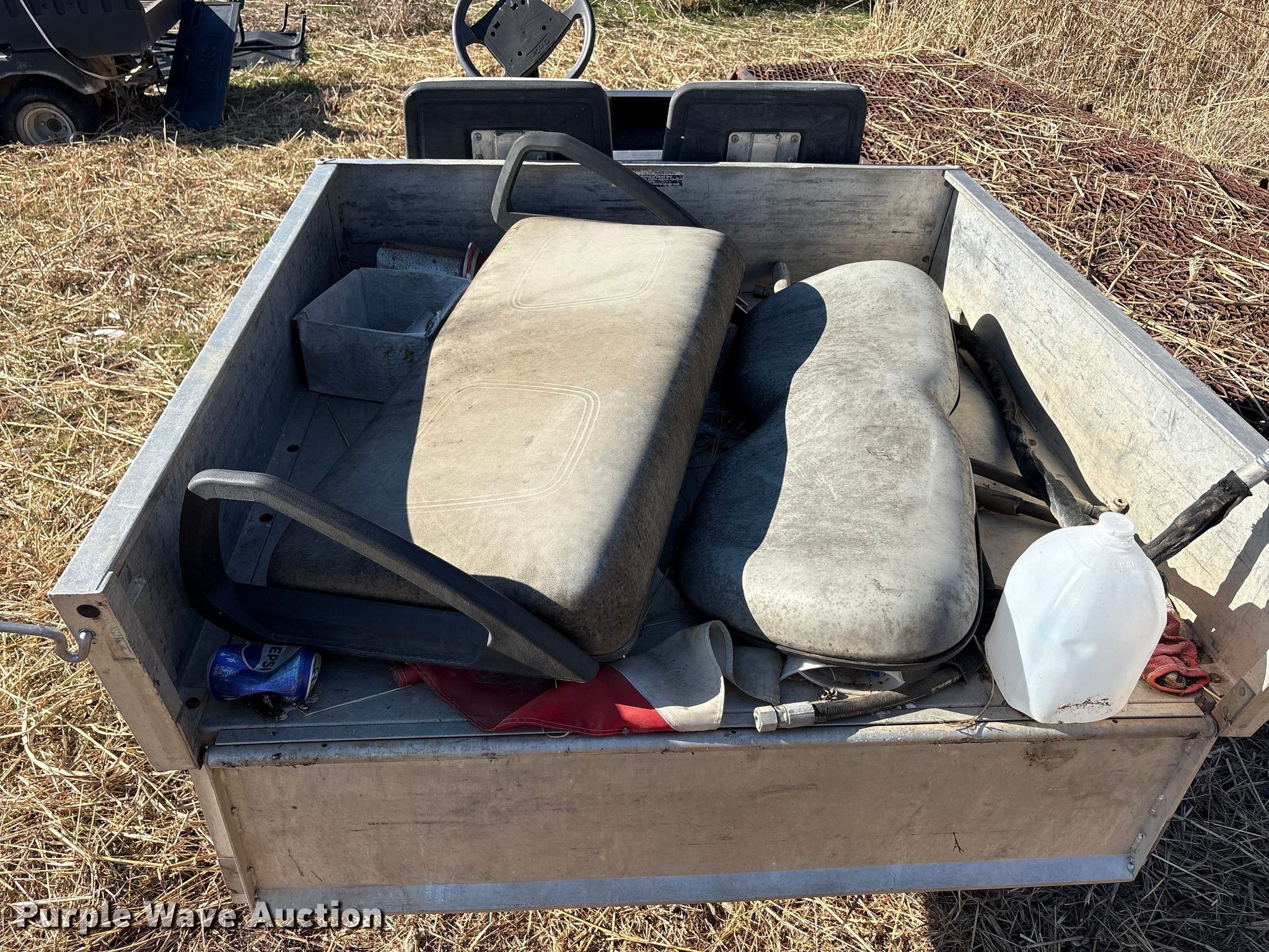 Purple Wave is selling a used Golf Cart in Oklahoma. This item is a (2) golf carts with the following: Hours: 2,131 on meter, Serial: FB1332-386339, Cylinders: 1, Fuel type: Gas, Transmission: Automatic, Manual dump bed, Width: 47", Length: 30", Tires: 20x10.00-8, Tailgate removed, Canopy removed, Non-operational unit