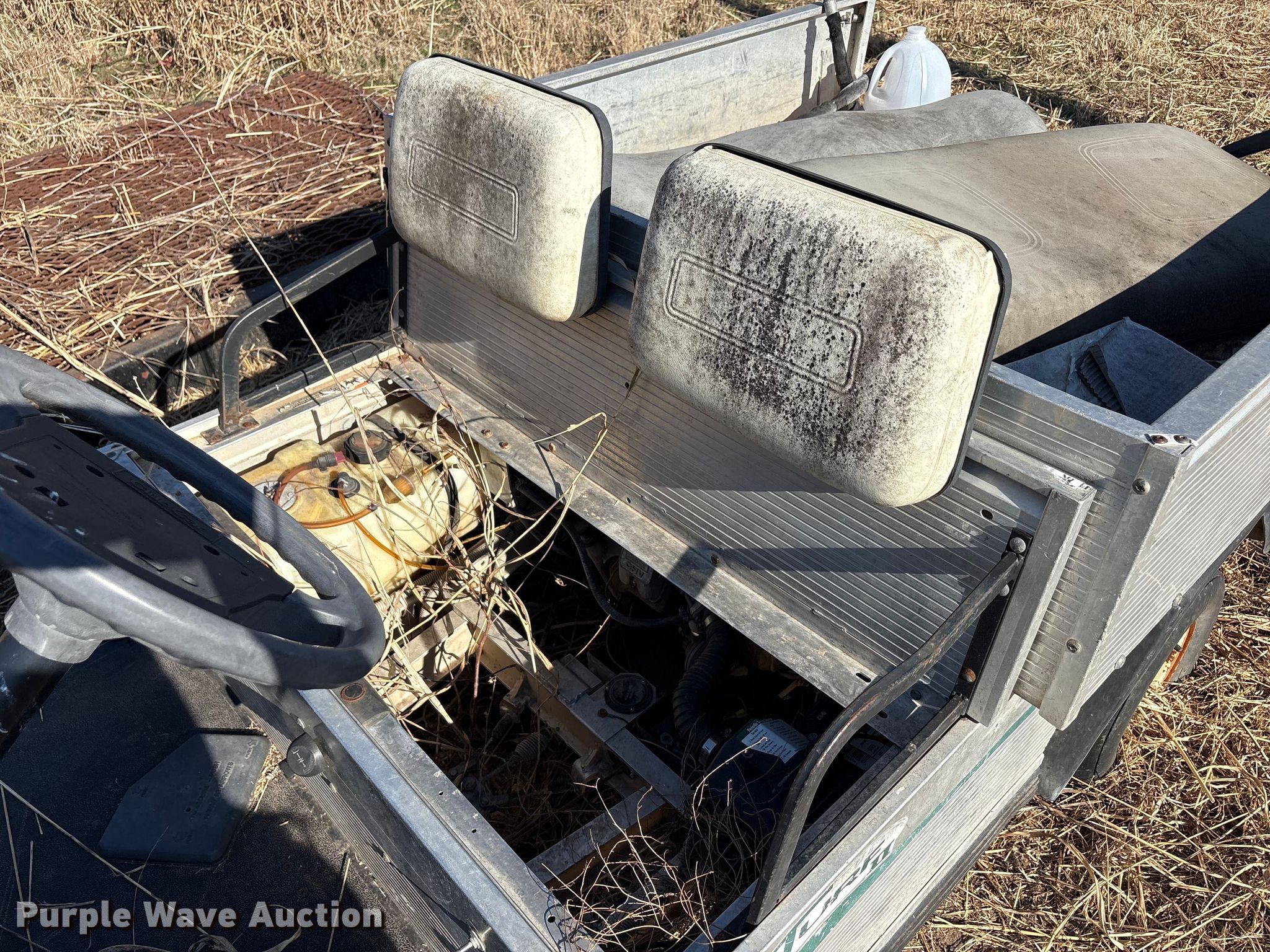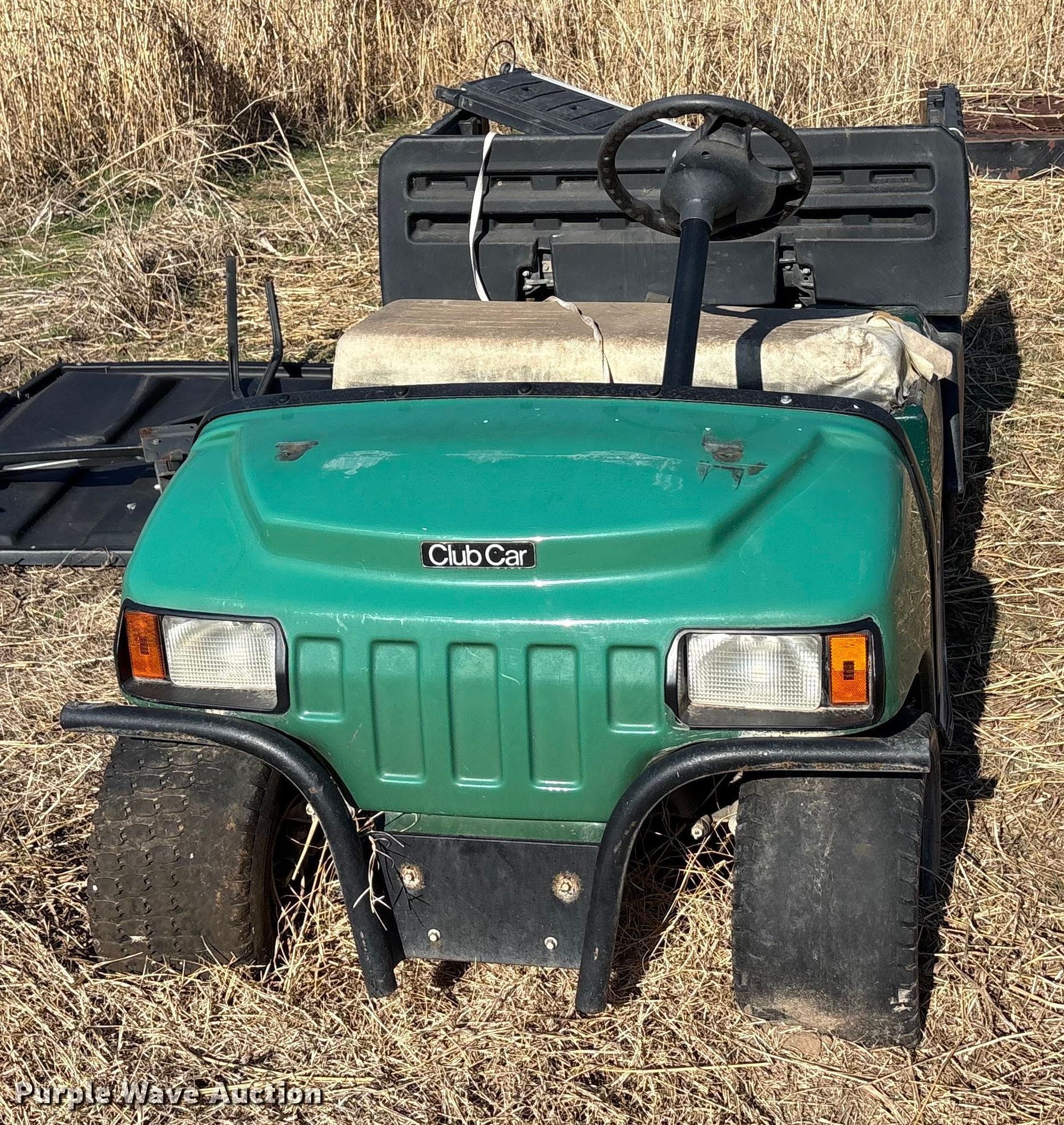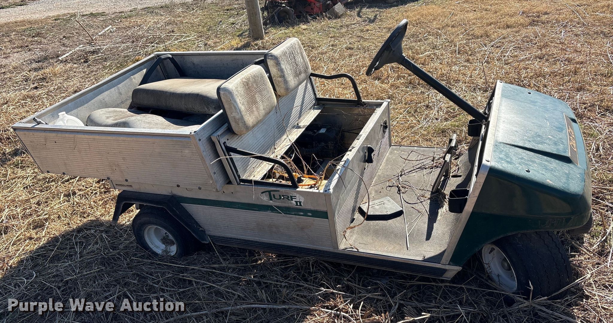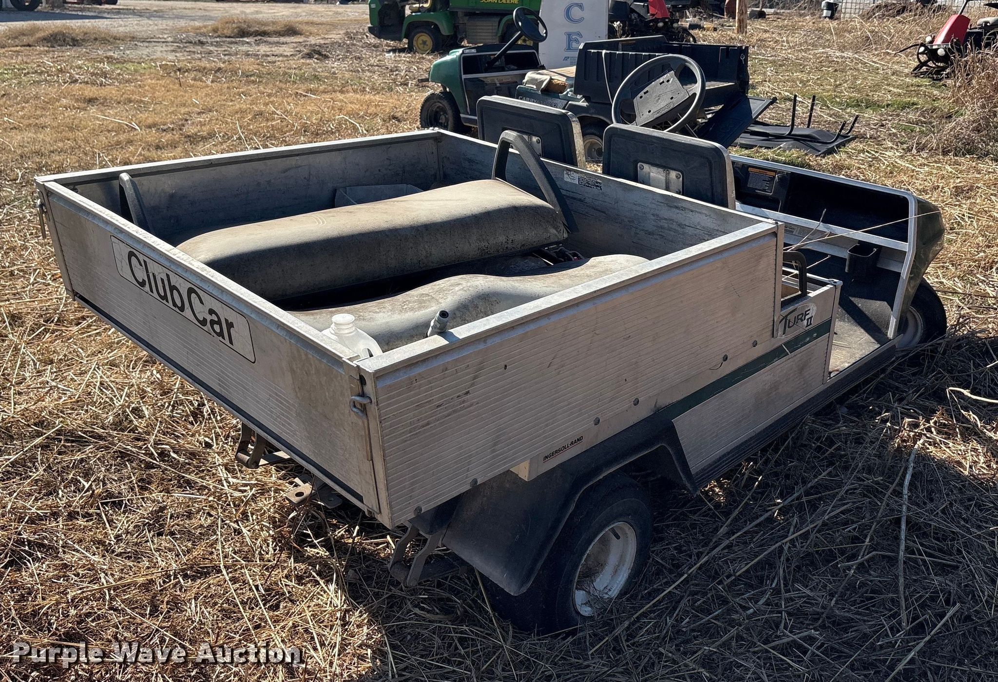 Purple Wave is selling a used Golf Cart in Oklahoma. This item is a (2) golf carts with the following: Hours: 2,131 on meter, Serial: FB1332-386339, Cylinders: 1, Fuel type: Gas, Transmission: Automatic, Manual dump bed, Width: 47", Length: 30", Tires: 20x10.00-8, Tailgate removed, Canopy removed, Non-operational unit