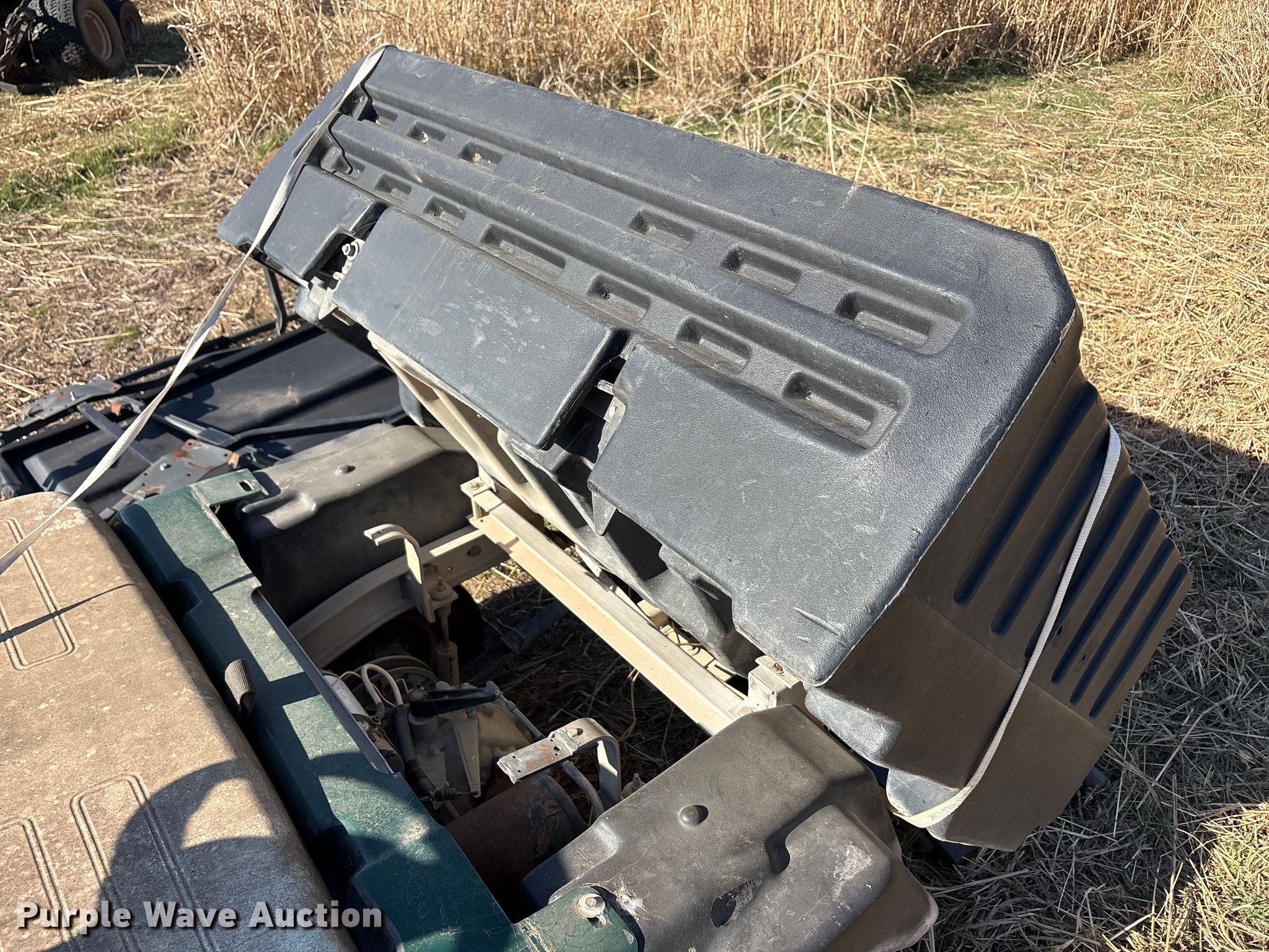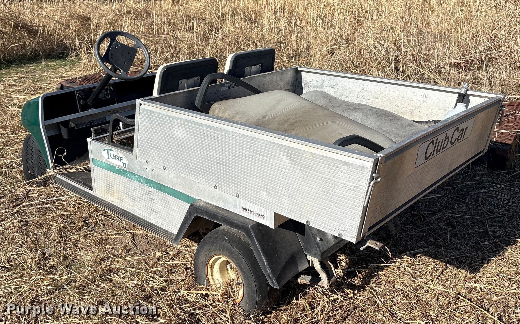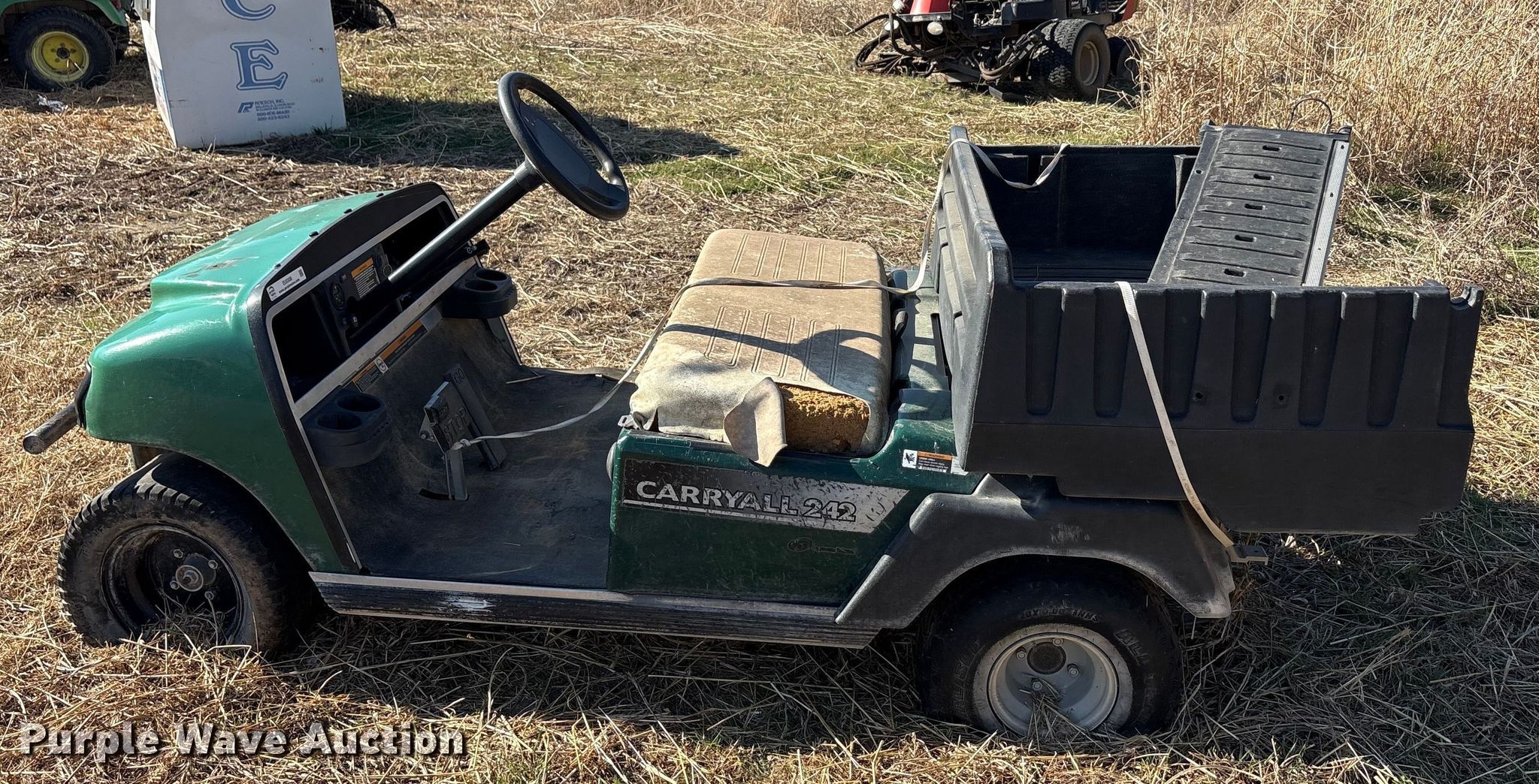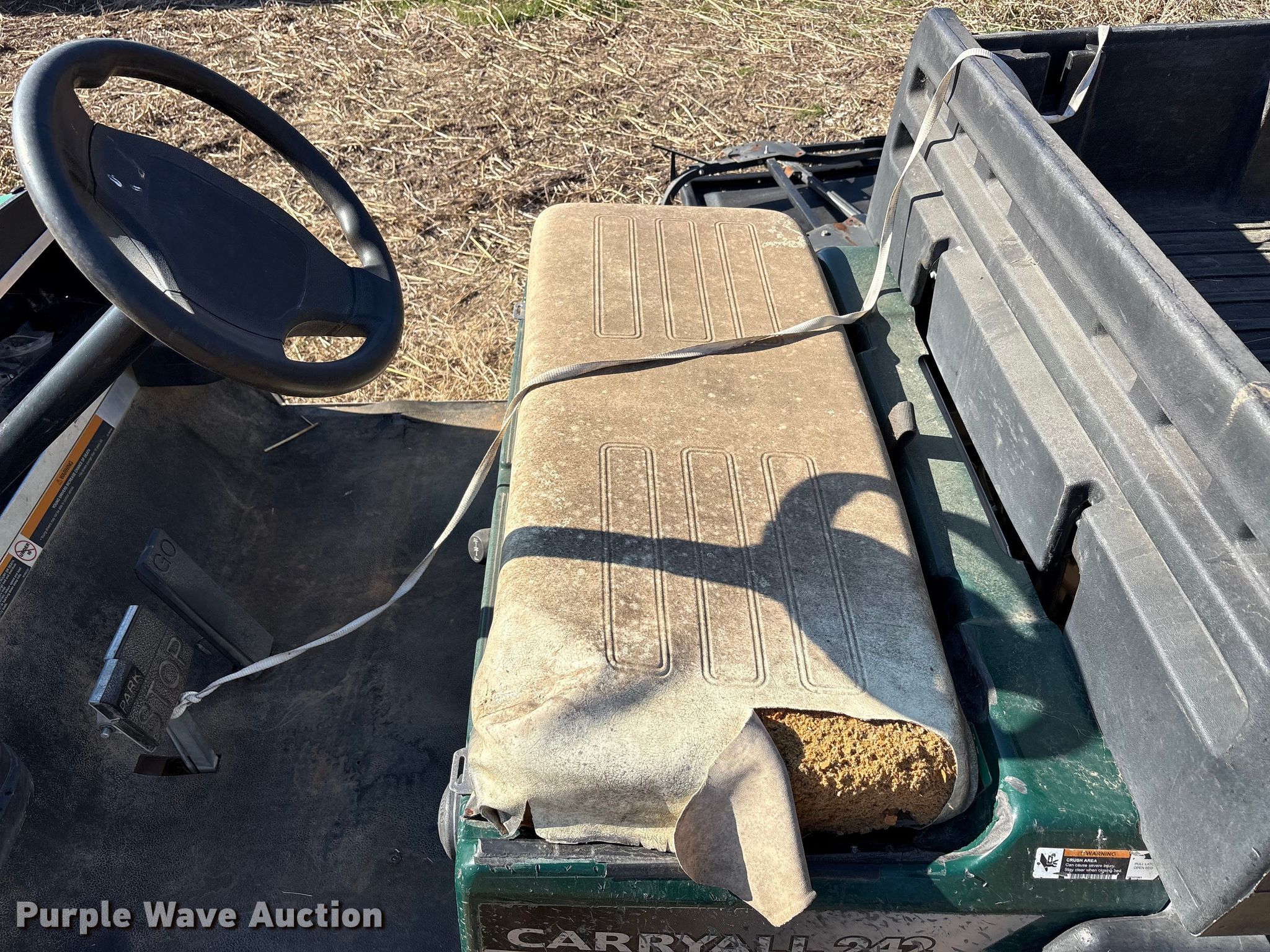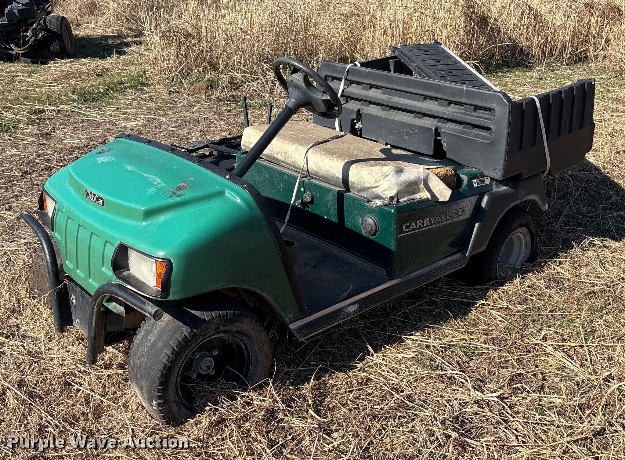 Purple Wave is selling a used Golf Cart in Oklahoma. This item is a (2) golf carts with the following: Hours: 2,131 on meter, Serial: FB1332-386339, Cylinders: 1, Fuel type: Gas, Transmission: Automatic, Manual dump bed, Width: 47", Length: 30", Tires: 20x10.00-8, Tailgate removed, Canopy removed, Non-operational unit