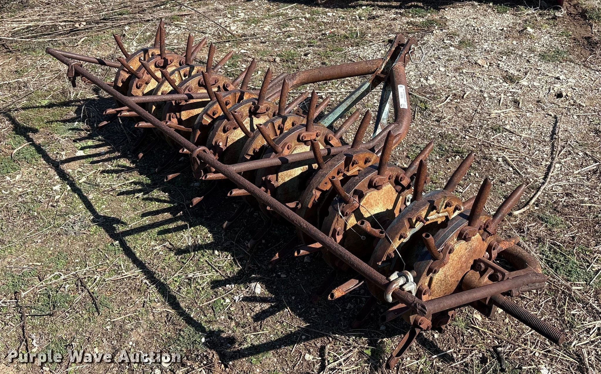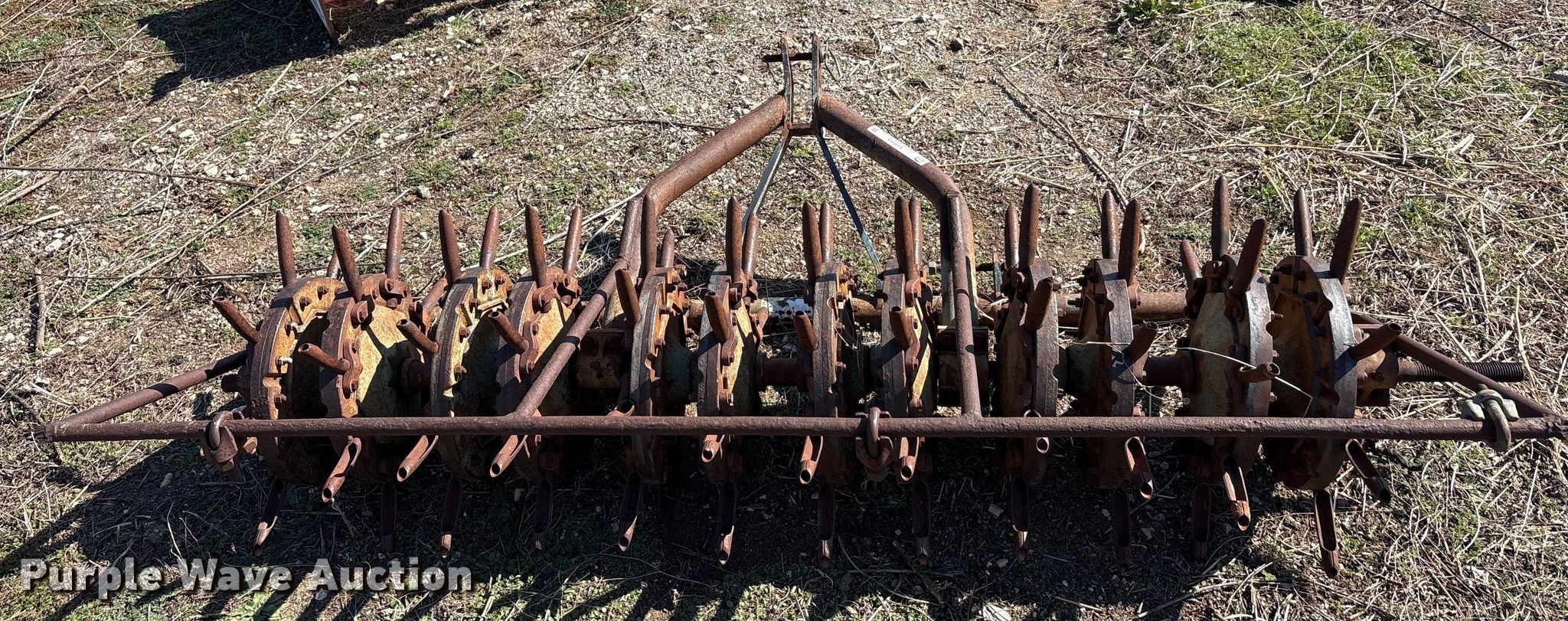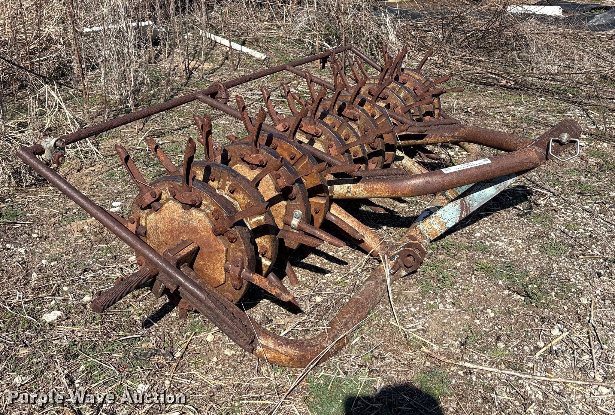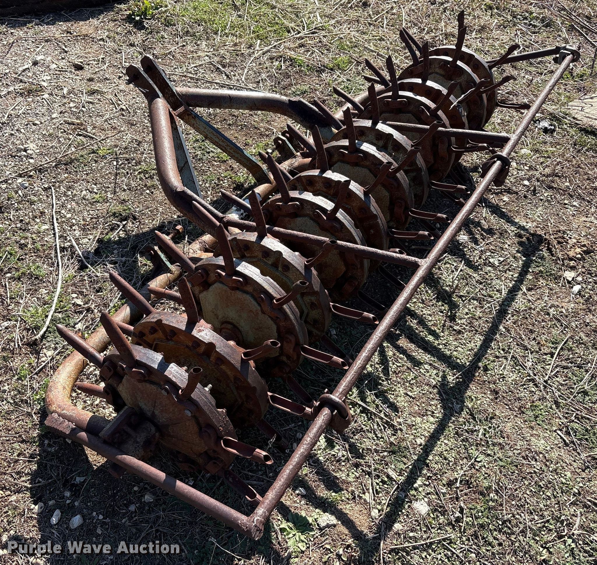 Purple Wave is selling a used Ag Tractor Loader or Attach. in Oklahoma. This item is a Aerator with the following: Hitch: Three point, Spacing: 6", Diameter: 6", Width: 93", Length: 46"