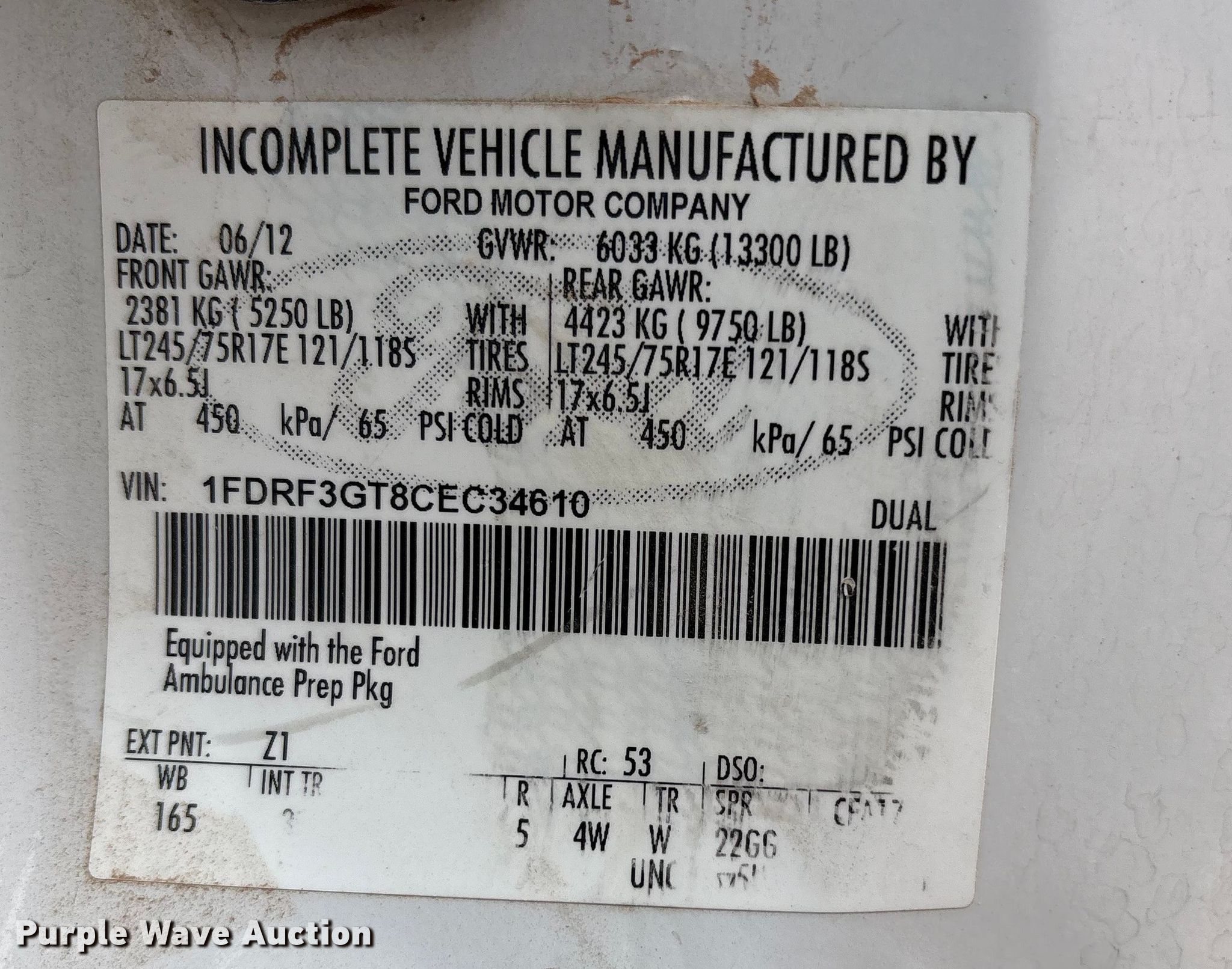 Purple Wave is selling a used Fire Truck or Emergency Vehicle in Texas. This item is a 2012 Ford F350 Super Duty ambulance with the following: Miles: 209,598 on odometer, VIN: 1FDRF3GT8CEC34610
