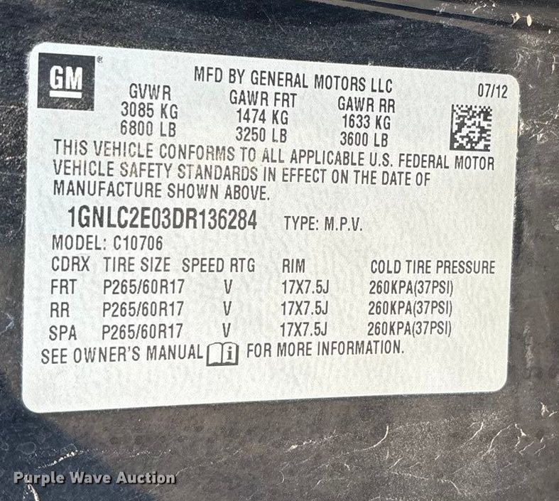 Purple Wave is selling a used Passenger Vehicle in Texas. This item is a 2013 Chevrolet Tahoe Police SUV with the following: Miles: 119,090 on odometer, VIN: 1GNLC2E03DR136284