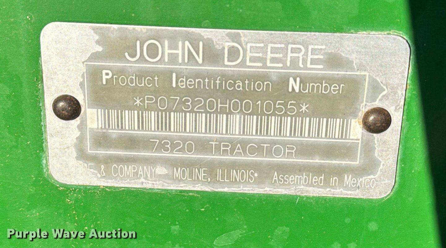 Purple Wave is selling a used Tractor in Kansas. This item is a 2003 John Deere 7320 tractor with the following: Hours: Unknown, Serial: P07320H001055