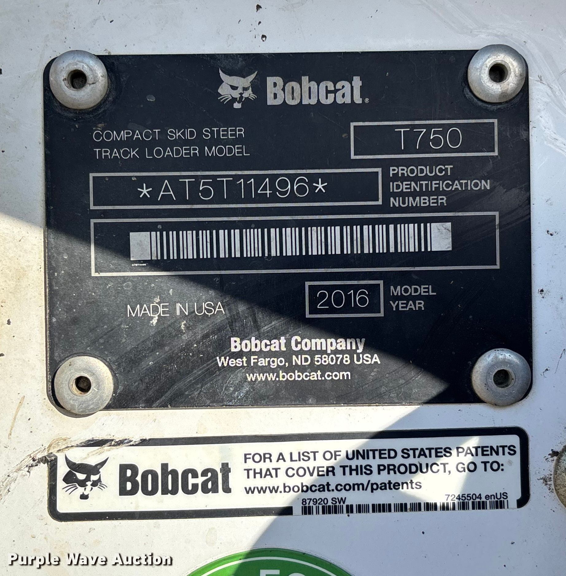 Purple Wave is selling a used Tracked Skid Steer Loader in Missouri. This item is a 2016 Bobcat T750 tracked skid steer loader with the following: Hours: 1,778 on meter, Miles or hours may vary, unit still in use, Serial: AT5T11496