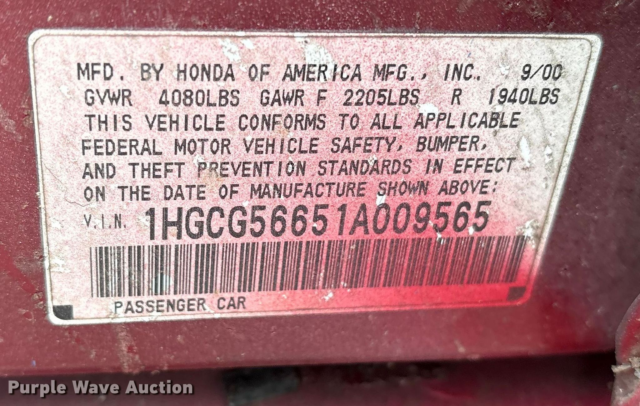 Purple Wave is selling a used Passenger Vehicle in Oklahoma. This item is a 2001 Honda Accord with the following: Miles: Unknown, VIN: 1HGCG56651A009565, Unit #: 217