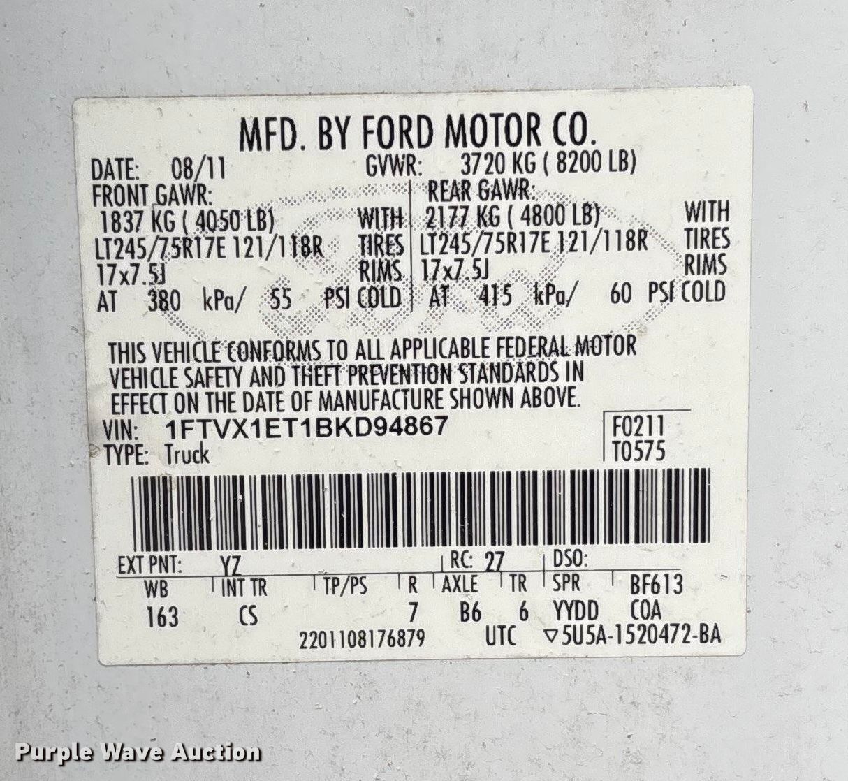 2011 Ford F150 XL Ext. Cab pickup truck. Miles: 278,864 on odometer, VIN: 1FTVX1ET1BKD94867. Engine Displacement: 3.5L, Cylinders: 6, Fuel type: Gas. Transmission Automatic, Four wheel drive. Interior AC, Heat, Power windows, Power locks, Cruise control, Brake controller. Features Bed Length: 8'. Tires Size: 245/75R17. Notes Dash warning indicator: Check engine, Windshield chipped or cracked, Jump start required during on-site data collection. Virginia title. Seller is a government entity who will be assigning and distributing the title. Please contact the seller for distribution questions. Louisa County. Louisa, VA 23093