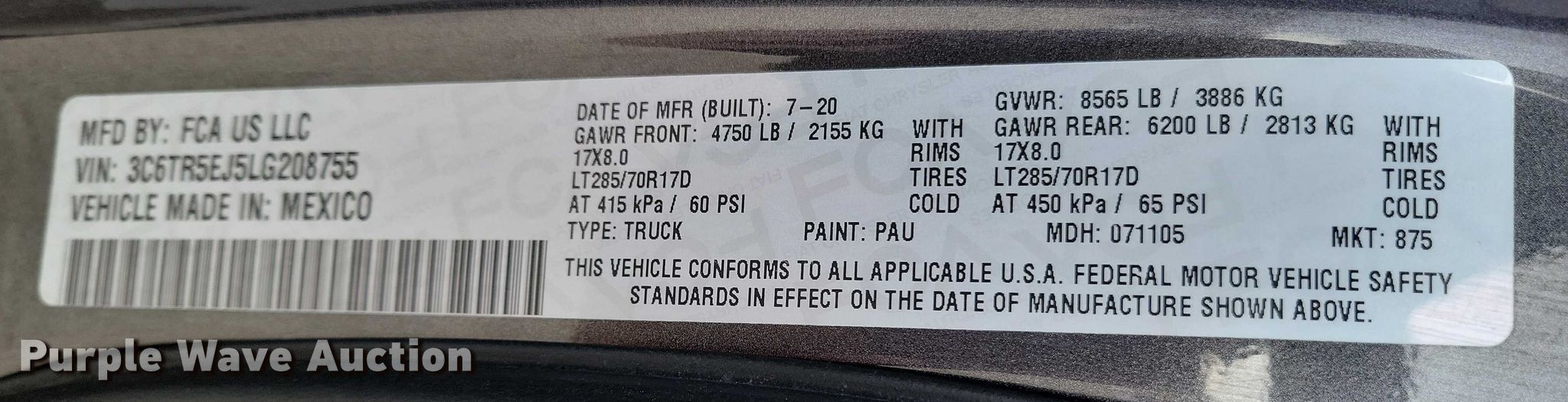 - VIN: 3C6TR5EJ5LG208755