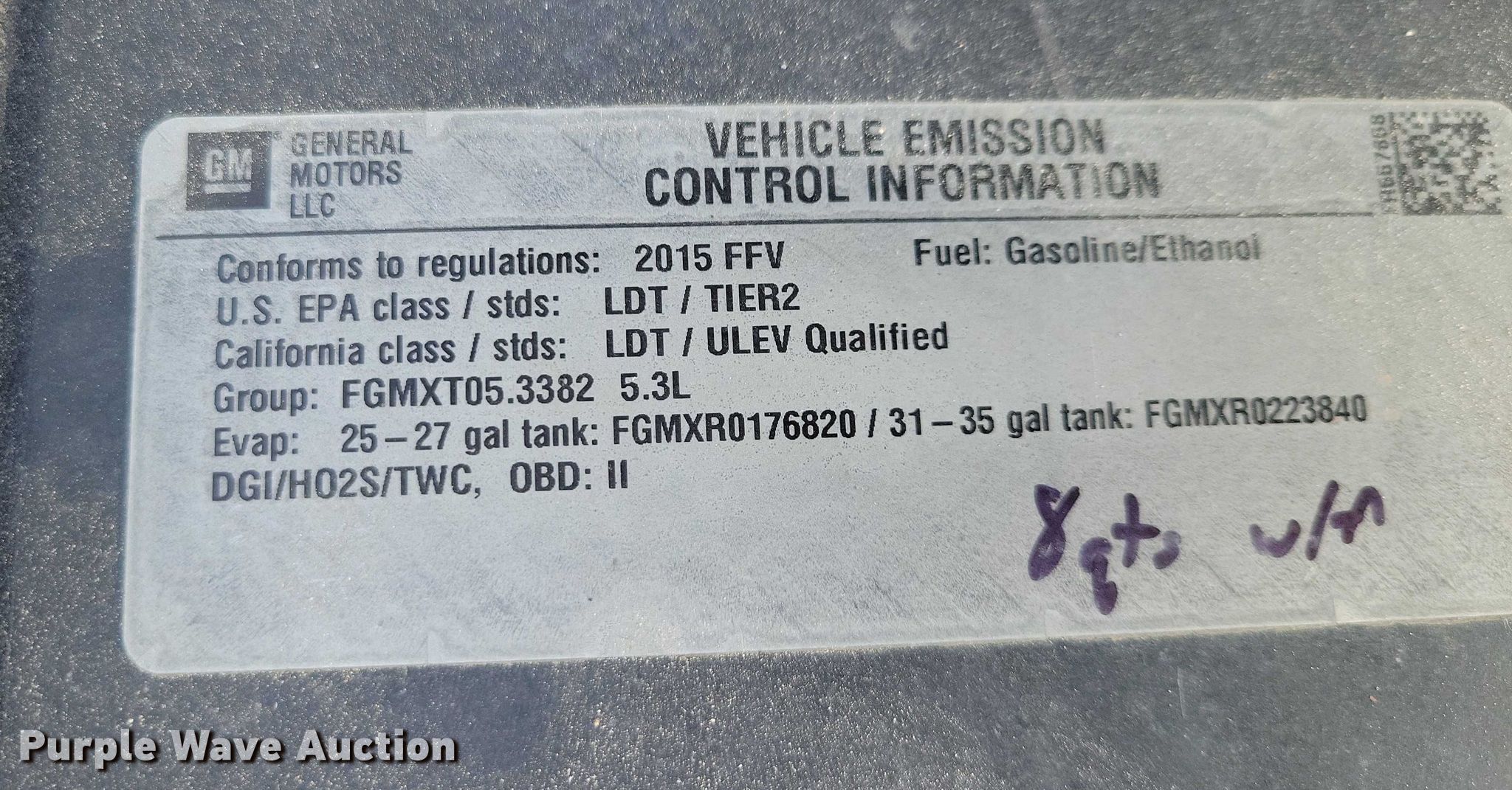 2015 Chevrolet Tahoe Police SUV. Miles: 107,759 on odometer, VIN: 1GNSK2EC3FR557658. Engine Displacement: 5.3L, Cylinders: 8, Fuel type: Gas. Transmission Automatic, Four wheel drive. Interior AC, Heat, Seat: Power driver, Power passenger, Power windows, Power locks, Cruise control, Backup camera. Tires Size: 265/60R17. Notes Windshield chipped or cracked. Iowa title. Seller is a government entity who will be assigning and distributing the title. Please contact the seller for distribution questions. Title distribution may be delayed up to 14 days from verification of funds. Guthrie County Sheriff's Office. Guthrie Center, IA 50115