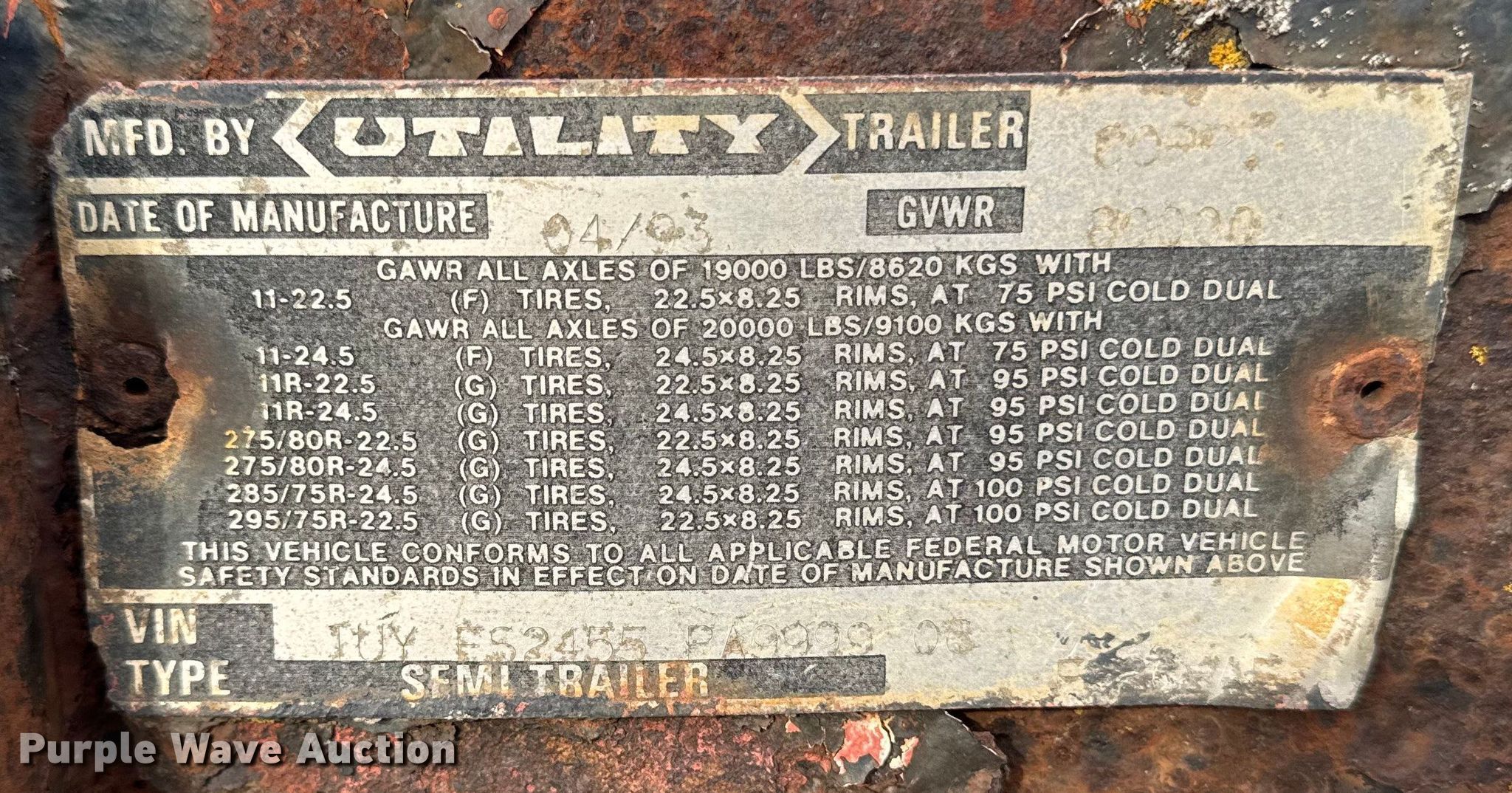 1993 Utility Trailer Manufacturer flatbed trailer. VIN: 1UYFS2455PA999906. Dimensions Overall Length: 45', Width: 96". Features Deck type: Aluminum, Wood. Chassis Landing gear: Dual, Suspension: Air, Brakes: Air, Axles: Spread, GVWR: 80,000 lbs. Tires Steel wheels, Size: 285/75R24.5. Missouri title. Seller is a government entity who will be assigning and distributing the title. Please contact the seller for distribution questions. Putnam County. Unionville, MO 63565