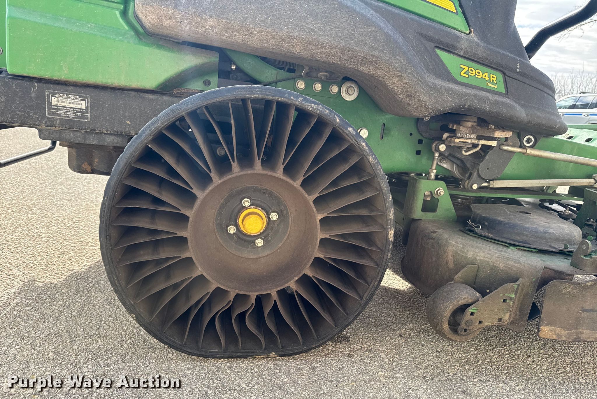 2018 John Deere Z994R ZTR lawn mower. Hours: 1,653 on meter, Cutting width: 60", Serial: 1TC994RHTJT010040. Engine Yanmar 4WNCXAJ, Displacement: 1.267L, Cylinders: 3, Fuel type: Diesel. Transmission Hydrostatic. Operators station OROPS. Tires Front: 13x6.5-6, Rear: 24x12-12. Scott County Conservation. Eldridge, IA 52748