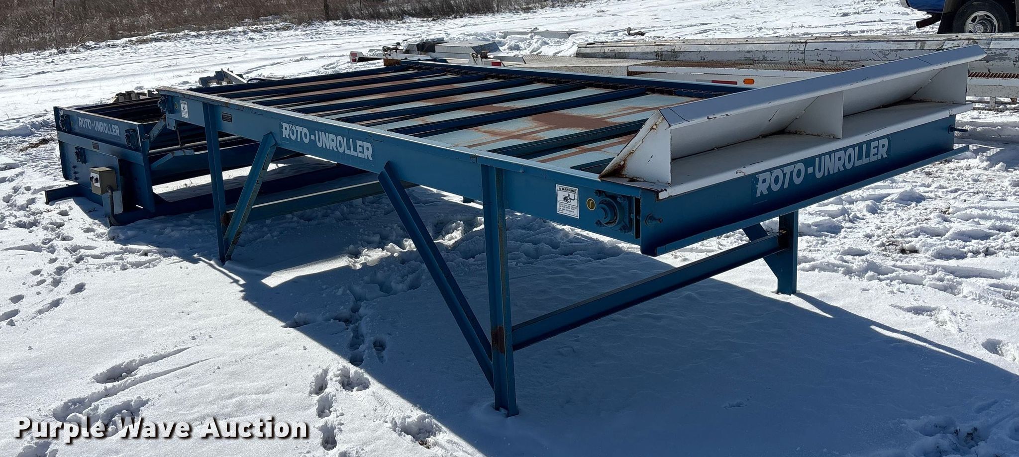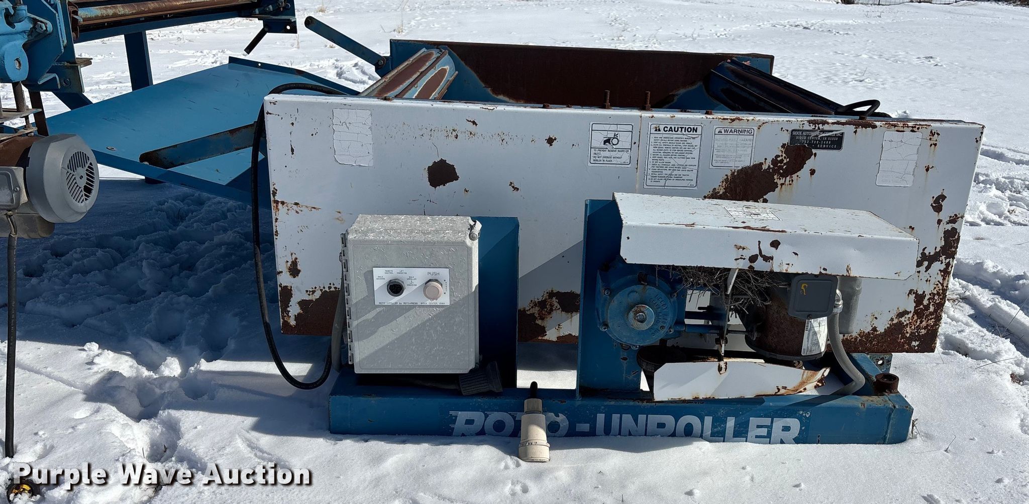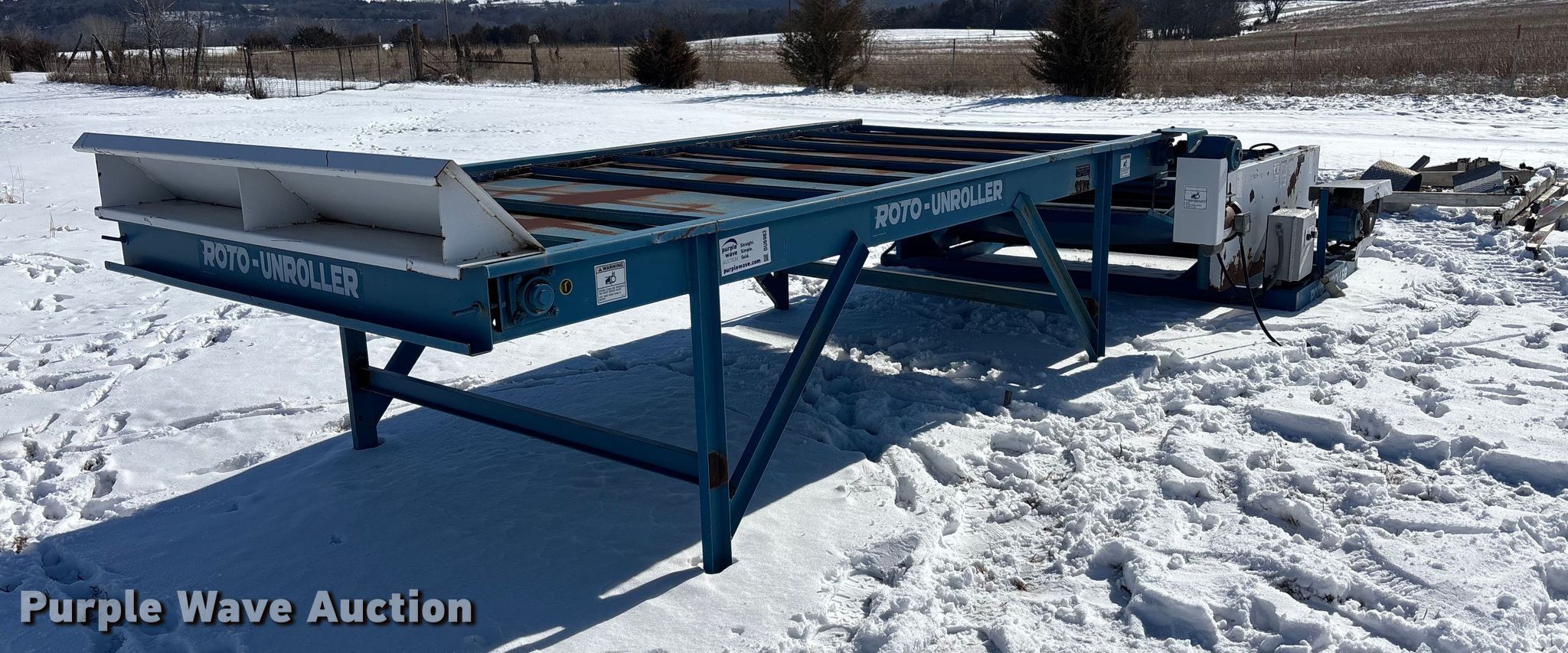 Purple Wave is selling a used Hay Equip. Attach. in Kansas. This item is a Roto round baler unroller with the following: Length: 12', Width: 64", Forward Reverse, Speed: 1, Volts: 220, Phase: Single