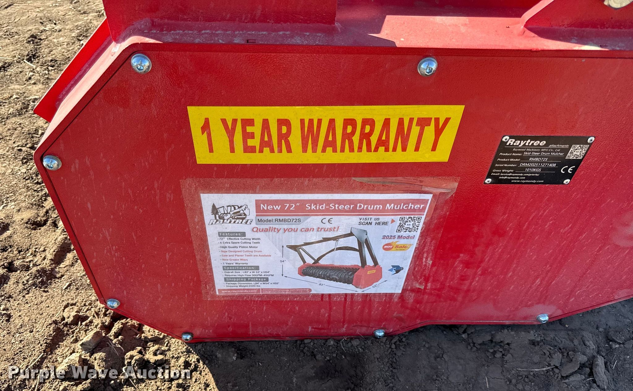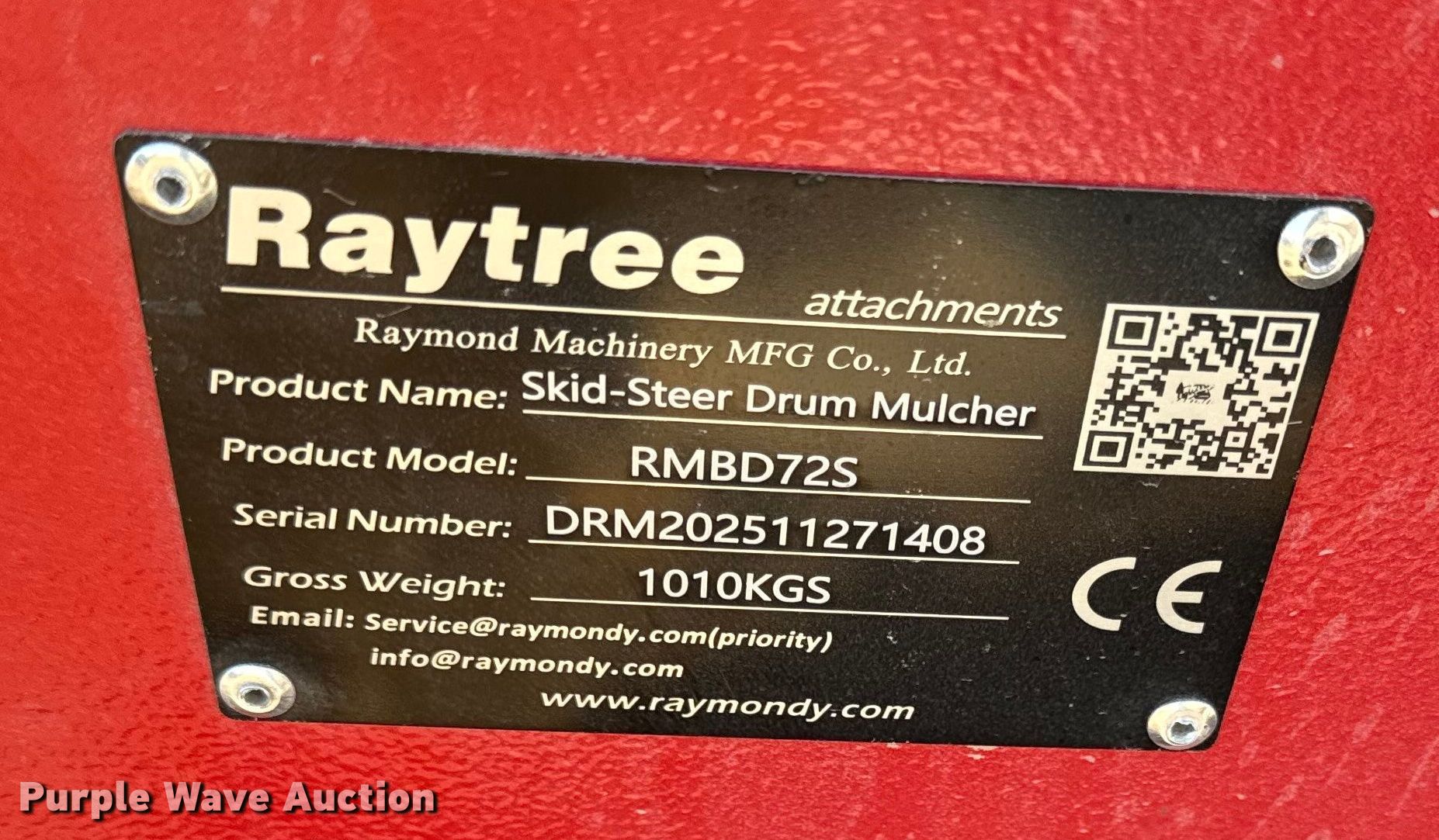 Purple Wave is selling a used Skid Steer Attach. in Kansas. This item is a 2025 Raytree RMBD72S skid steer mulcher with the following: Serial: DRM202511271408, Width: 72"