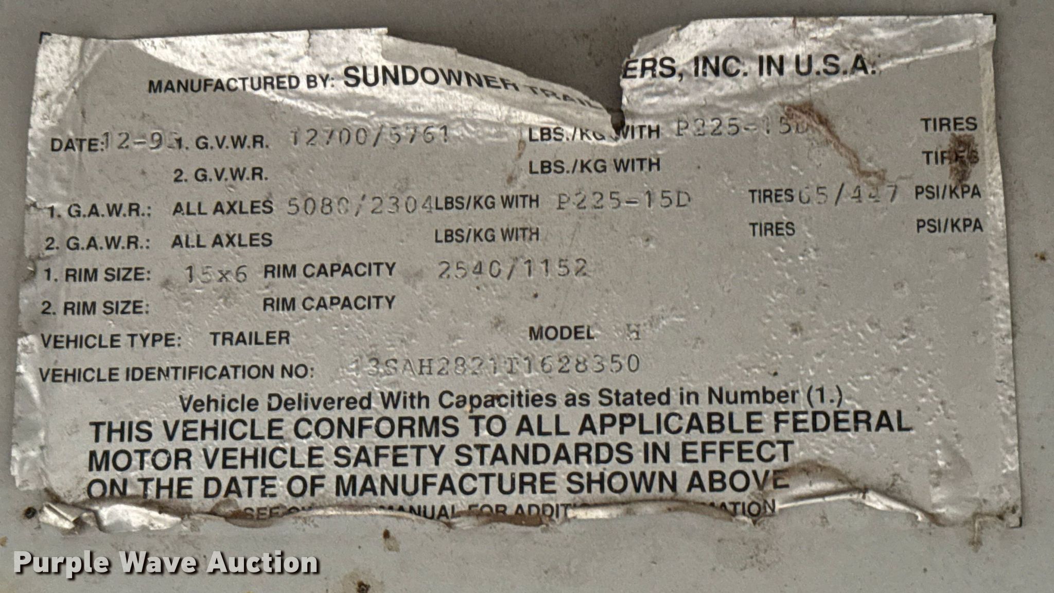 Purple Wave is selling a used Livestock Trailer in Oklahoma. This item is a 1996 Sundowner SunLite H horse trailer with the following: VIN: 13SAH2821T1628350, Insurance salvage unit claim #: 5-817189