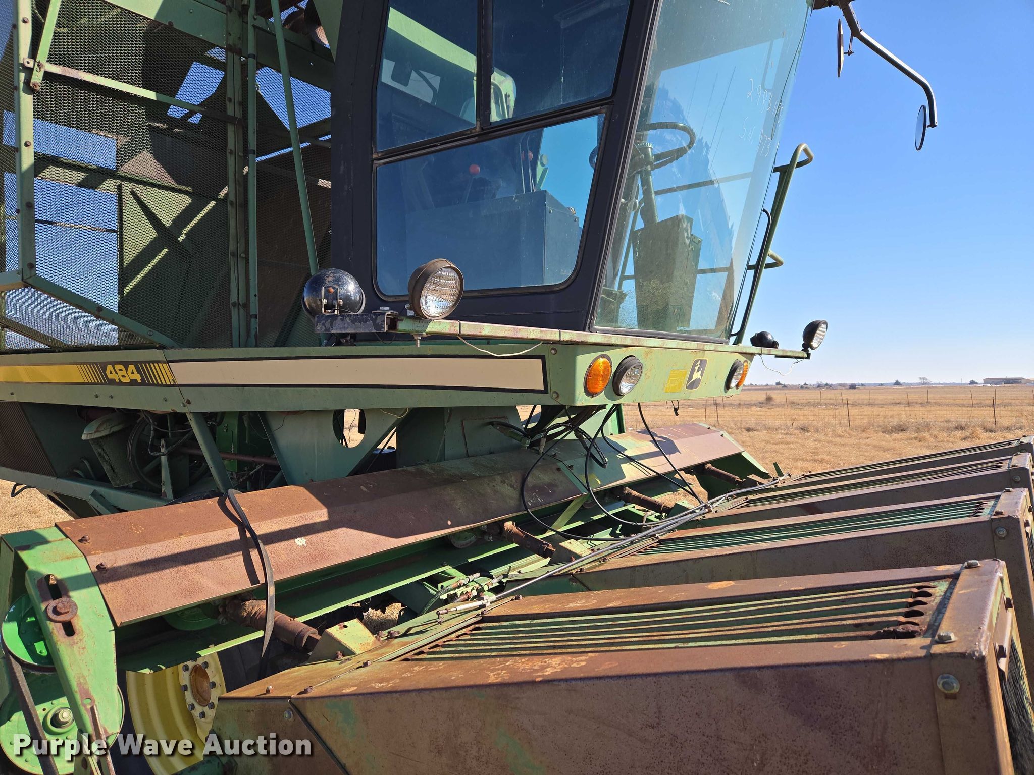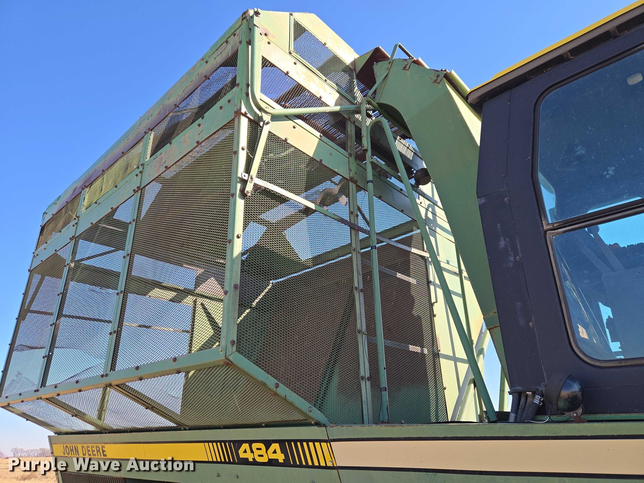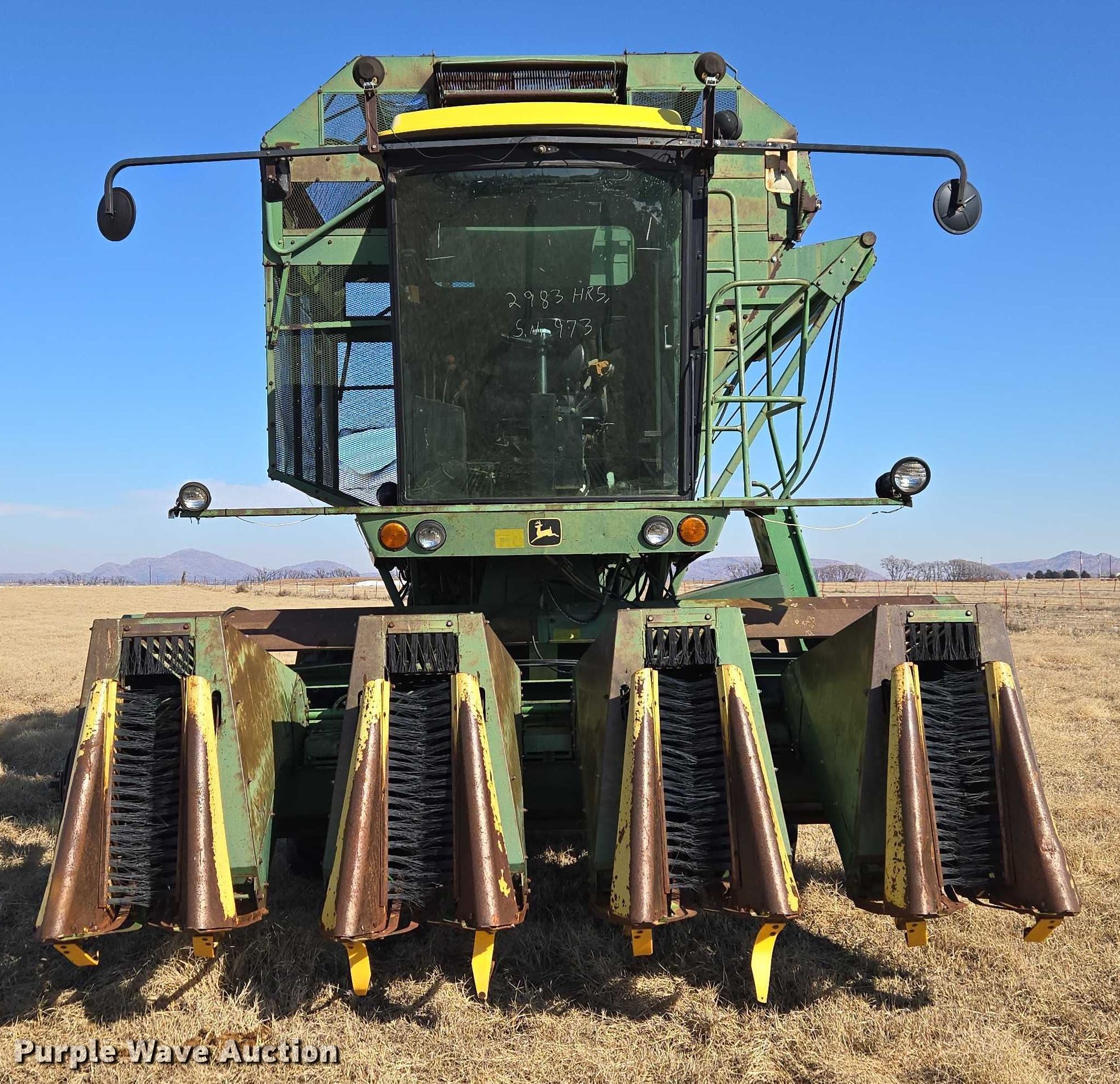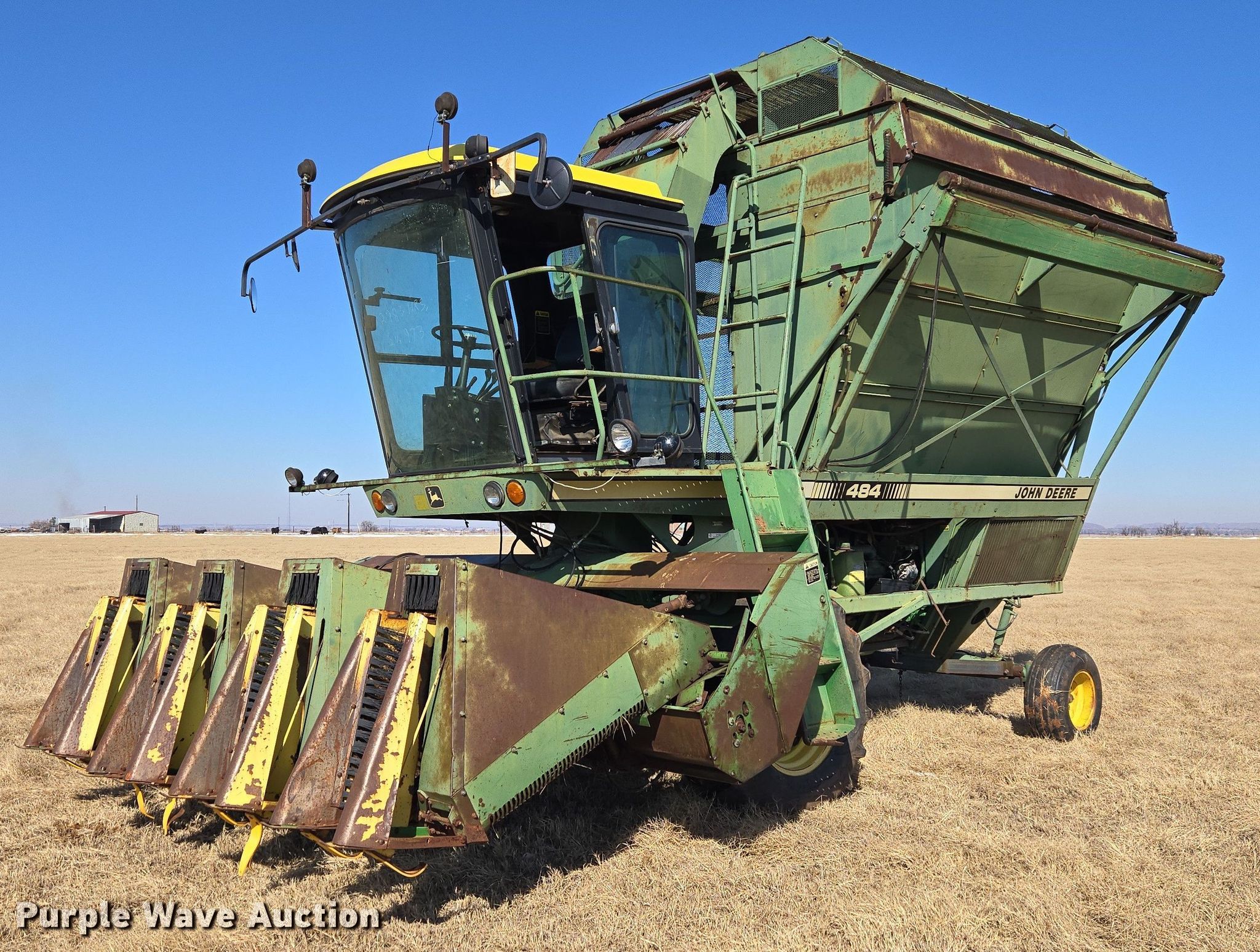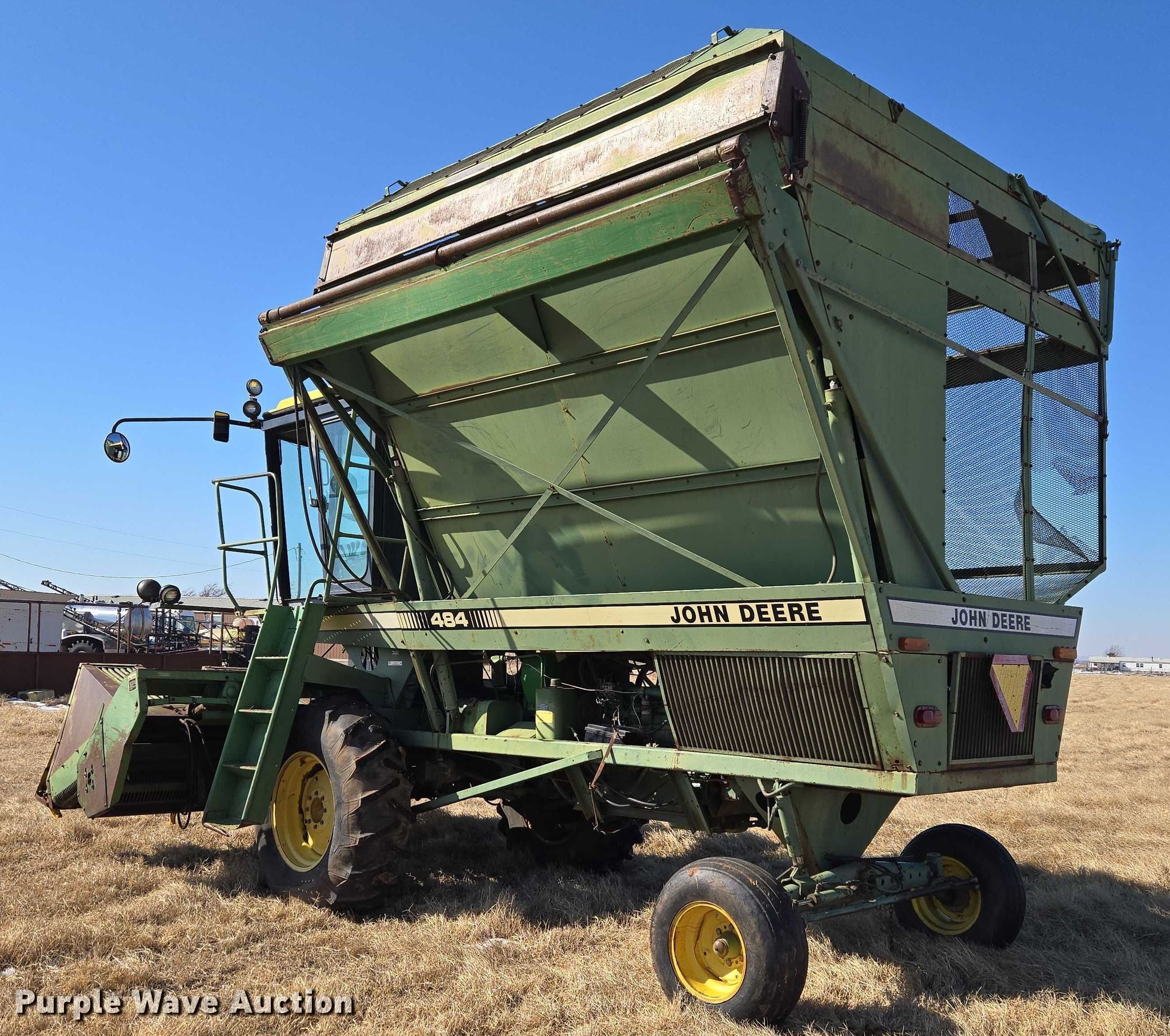 Purple Wave is selling a used Cotton Harvester Equip. in Oklahoma. This item is a John Deere 484 cotton stripper with the following: Engine hours: 2,987 on meter, Serial: 000973N