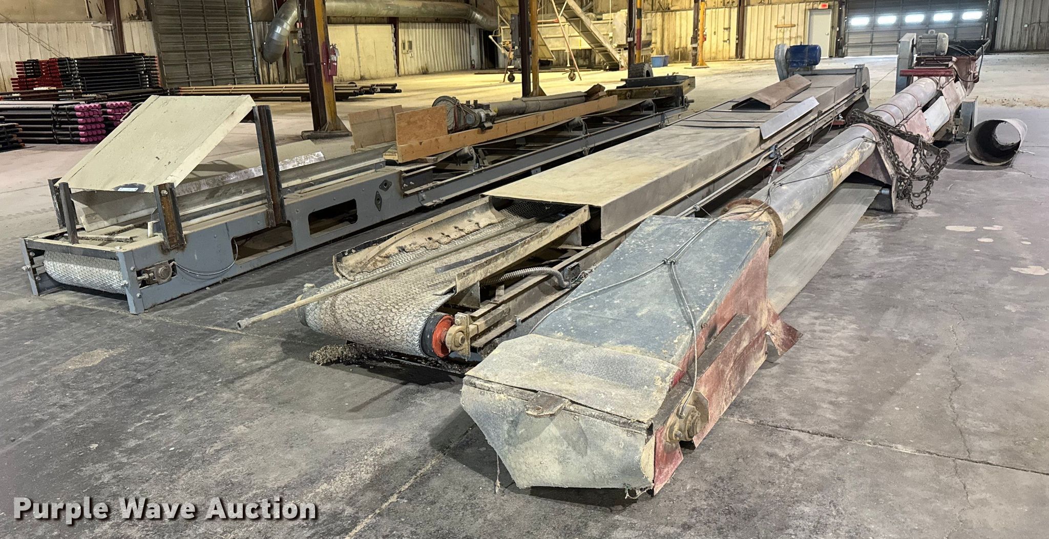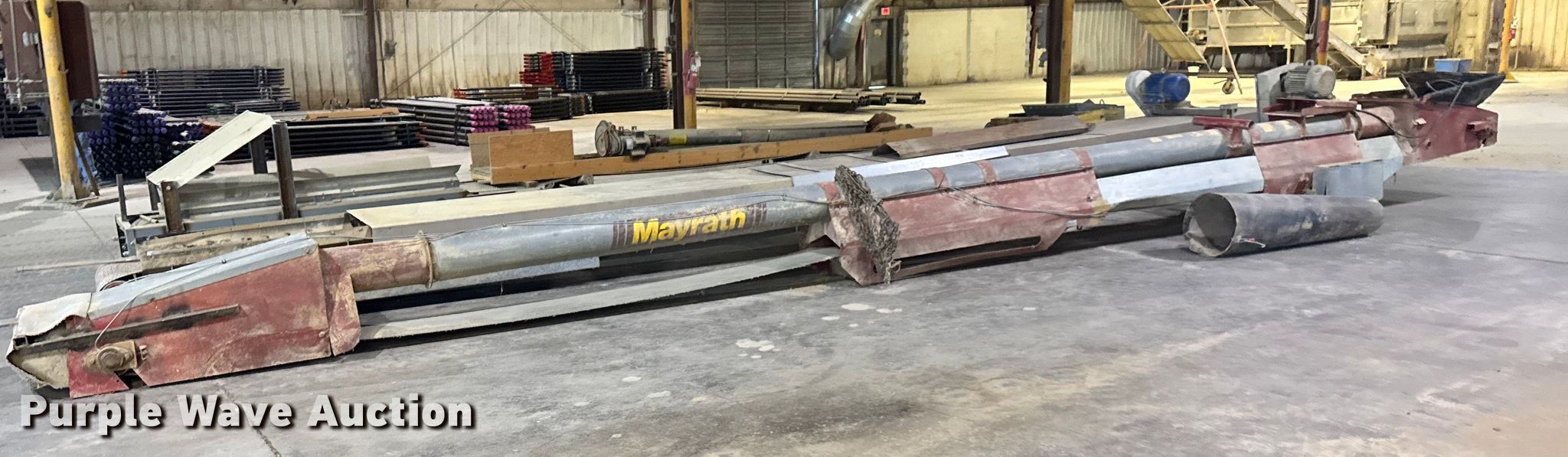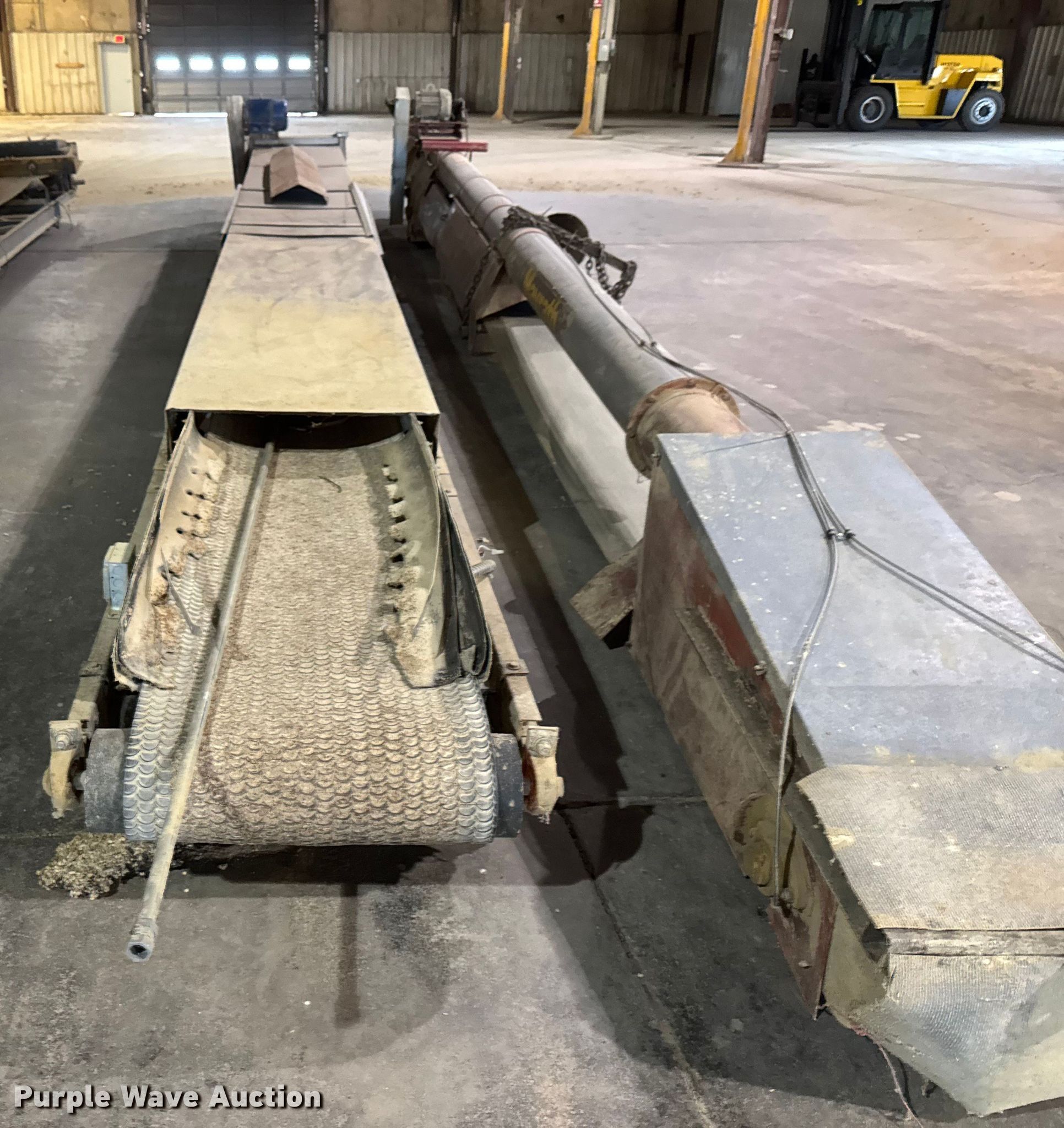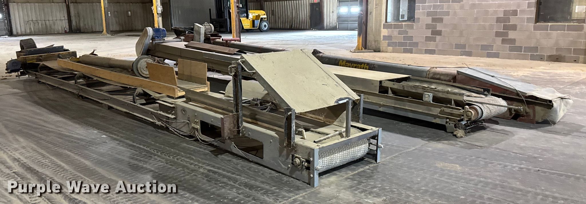Purple Wave is selling a used Auger or Conveyor in Kansas. This item is a (3) conveyors and (2) augers with the following: Conveyor with I-beam and trolley, 36'L x 30" W, Motor, Model: Hyundai PKP184PR235B, Phase: 3,, Conveyor, 32' 6" L x 24" W, Motor, Torque Master, Phase: 3,, Conveyor, 33' 8" L x 30" W, Motor, Phase: 3,, Mayrath belt auger, 37'L x 9" diameter, Motor, Lincoln, Phase: 3, HP: 7.5,, Auger, 10'L x 6" diameter, Motor, World Wide, Phase: Single,