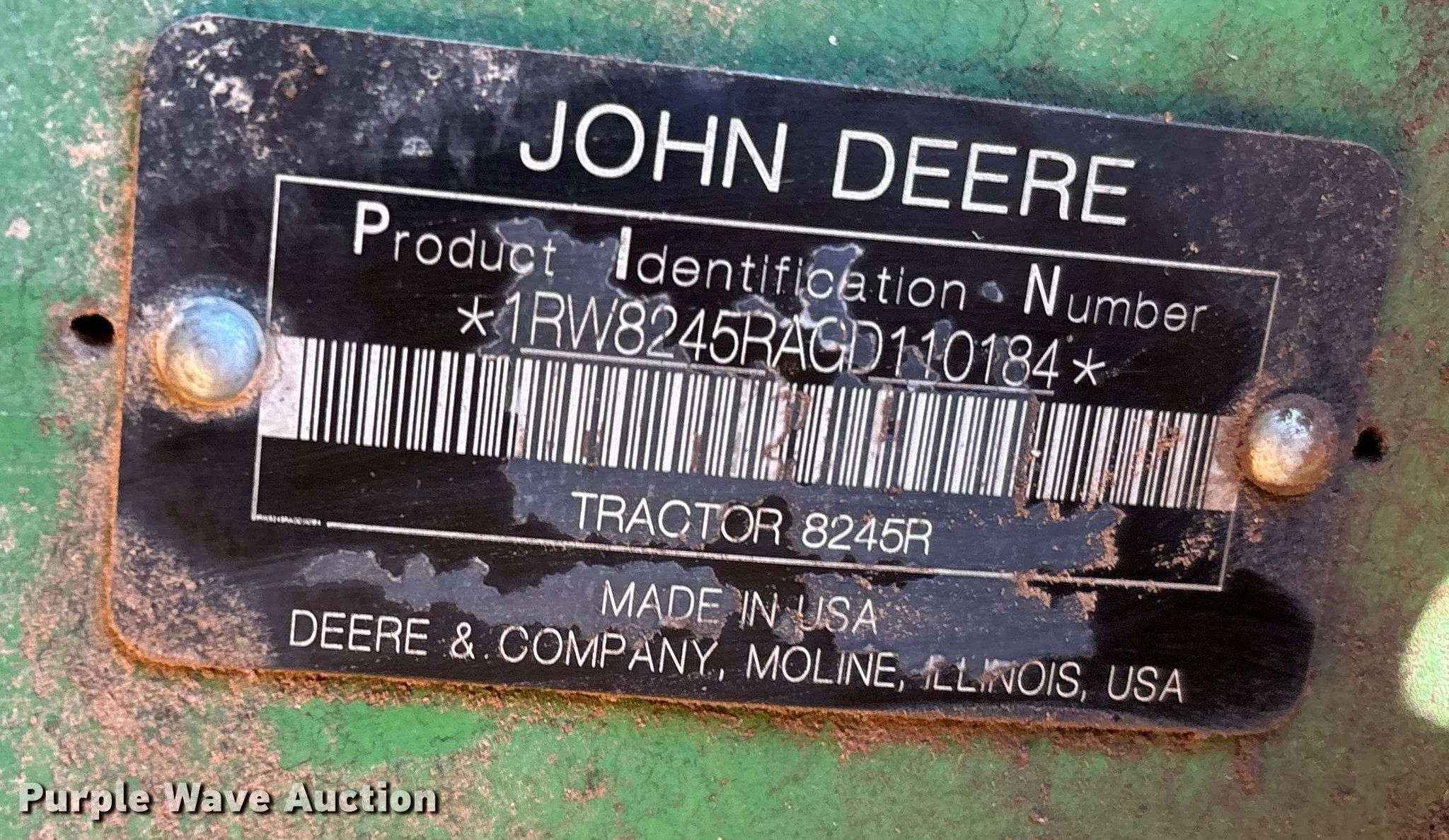 Purple Wave is selling a used Tractor in Texas. This item is a 2016 John Deere 8245R MFWD tractor with the following: Hours: Unknown, Serial: 1RW8245RAGD110184, Unit #: 3