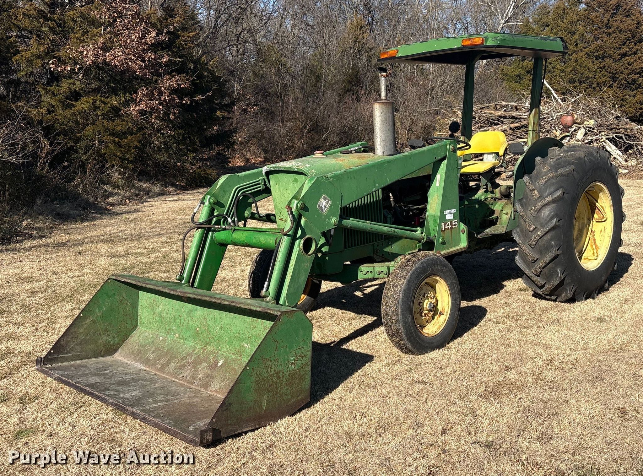 John Deere 2030A tractor. Hours: 2,409 on meter, Serial: 225312T. Engine John Deere 4219 DR 10, Serial: 337670T, Cylinders: 4, Fuel type: Diesel. Transmission Manual, 8F - 4R. Features PTO: 540, Three point, Hydraulic remote sets Rear: 1, Loader John Deere 145, Controls: Two-lever, Bucket Width: 74".. Tires Front: 9.5L-15, Rear: 16.9/14-28. Elk City, KS 67344