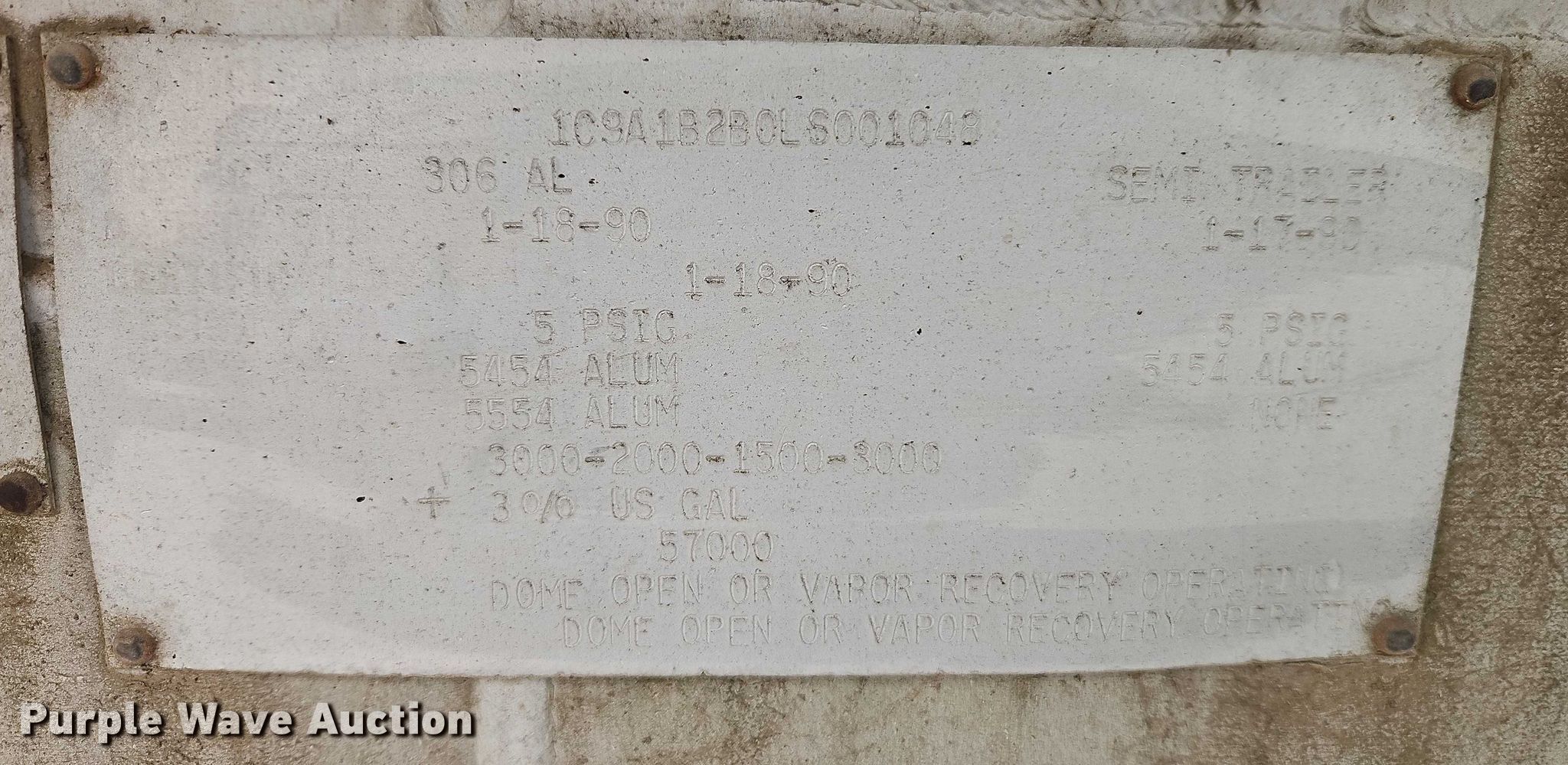 1990 CUST tank trailer. VIN: 1C9A1B2B0LS001048. Dimensions Overall Length: 43', Width: 96". Features Tank type: Aluminum Capacity: 57,000 gallons, Compartments: 4, Baffles: 3, Outlet valves: 4 Size: 2", No. of manways/manholes: 4, Pump Pacer Pumps SE2PLE550, Outlet size: 2". Chassis Landing gear: Dual, Suspension: Air, Brakes: Air, Axles: Tandem, GVWR: 68,000 lbs, GAWR: 20,000 lbs. Tires Aluminum wheels, Size: 425/65R22.5. Missouri title. Title distribution may be delayed up to 14 days from verification of funds. Rich Hill, MO 64779
