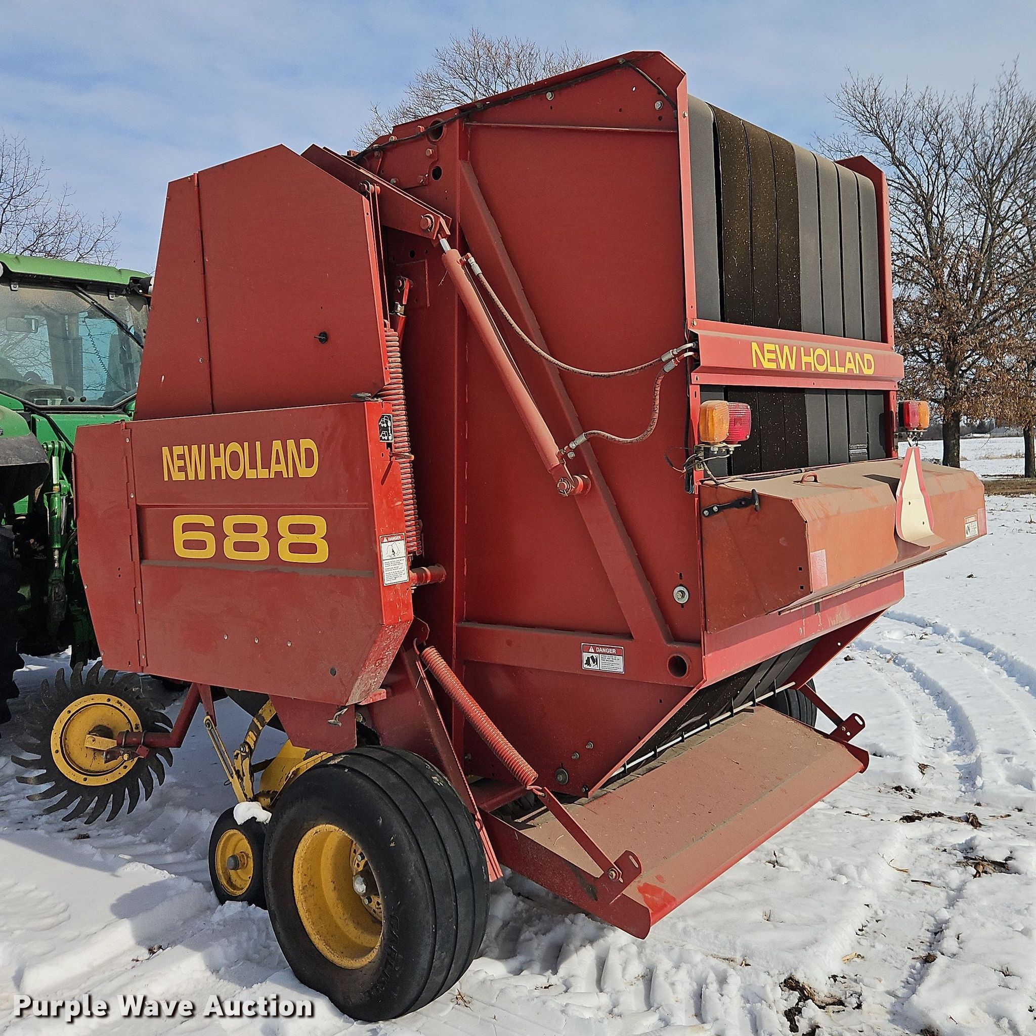 Purple Wave is selling a used Round Baler in Missouri. This item is a New Holland 688 round baler with the following: Bale count: 17,801, Serial: 555