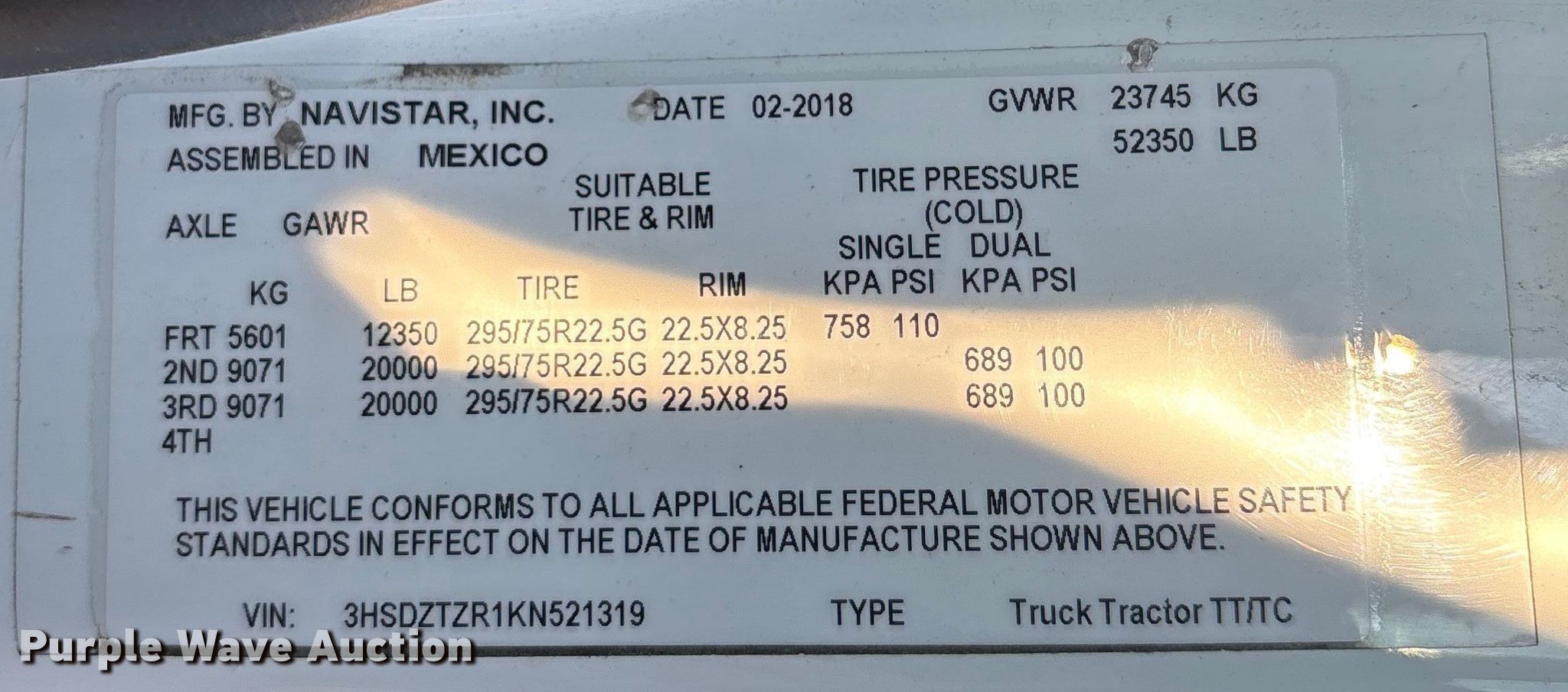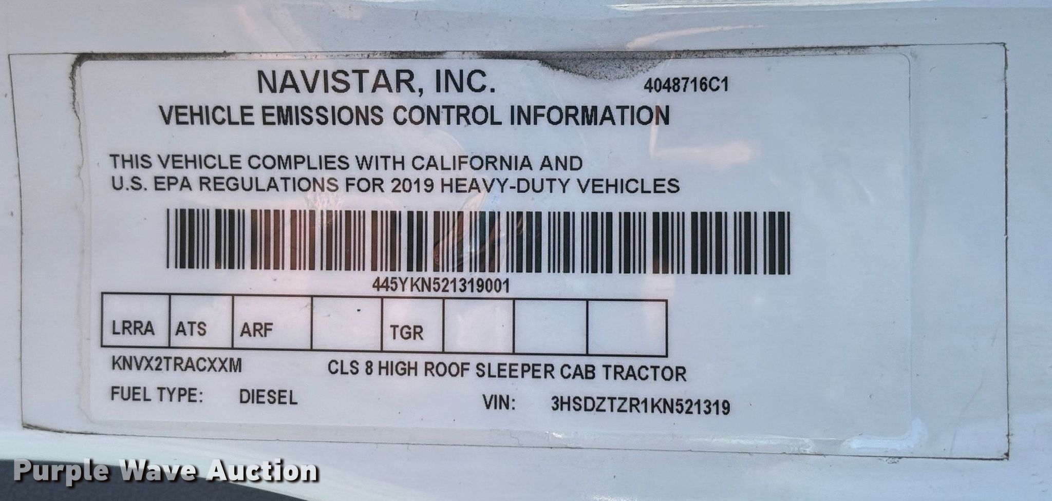 2019 International LT625 semi truck. Miles: 323,571 on odometer, Hours: 3,550 on meter, VIN: 3HSDZTZR1KN521319. Engine International, Displacement: 12.4L, Cylinders: 6, Fuel type: Diesel, Engine brake. Transmission Automated manual. Chassis Axles: Single, Differential lock: Inter-axle, Suspension: Air Dump valves, Brakes: Air, GVWR: 52,350 lbs FAWR: 13,200 lbs, IAWR: 19,000 lbs, RAWR: 19,000 lbs. Interior AC, Heat, Heated mirrors, Power windows, Power locks, Cruise control, Air ride cab, Sleeper Sleeper length: 52", Beds: Single, Rear climate control. Features Deck plate: Aluminum, Fifth wheel type: Air operated, Sliding, Fuel tank: Dual. Tires Size: 295/75R22.5. Notes Dash warning indicator: DPF. Pennsylvania title. Title distribution may be delayed up to 30 days from verification of funds. Oasis Logistics. York, SC 29745