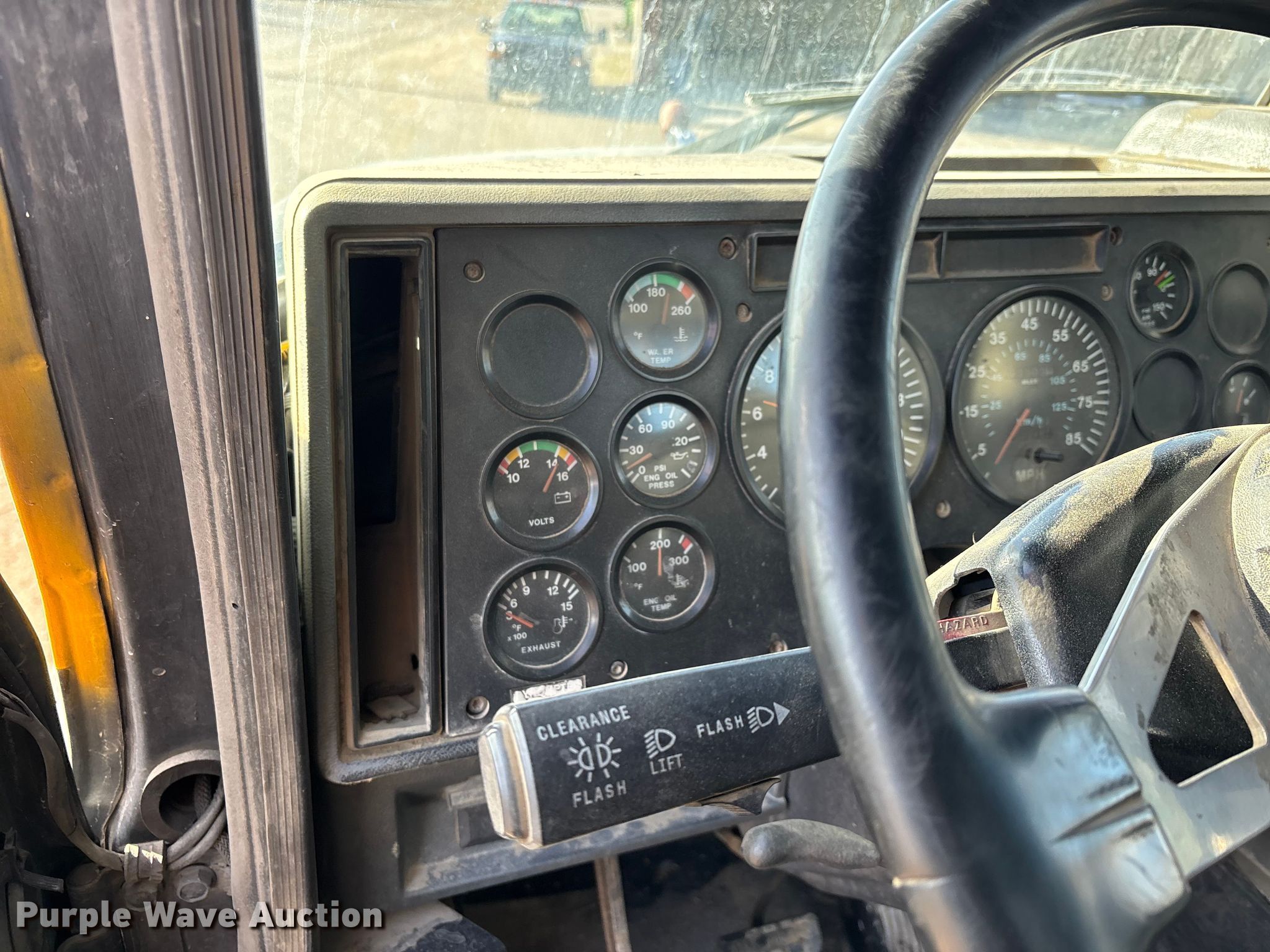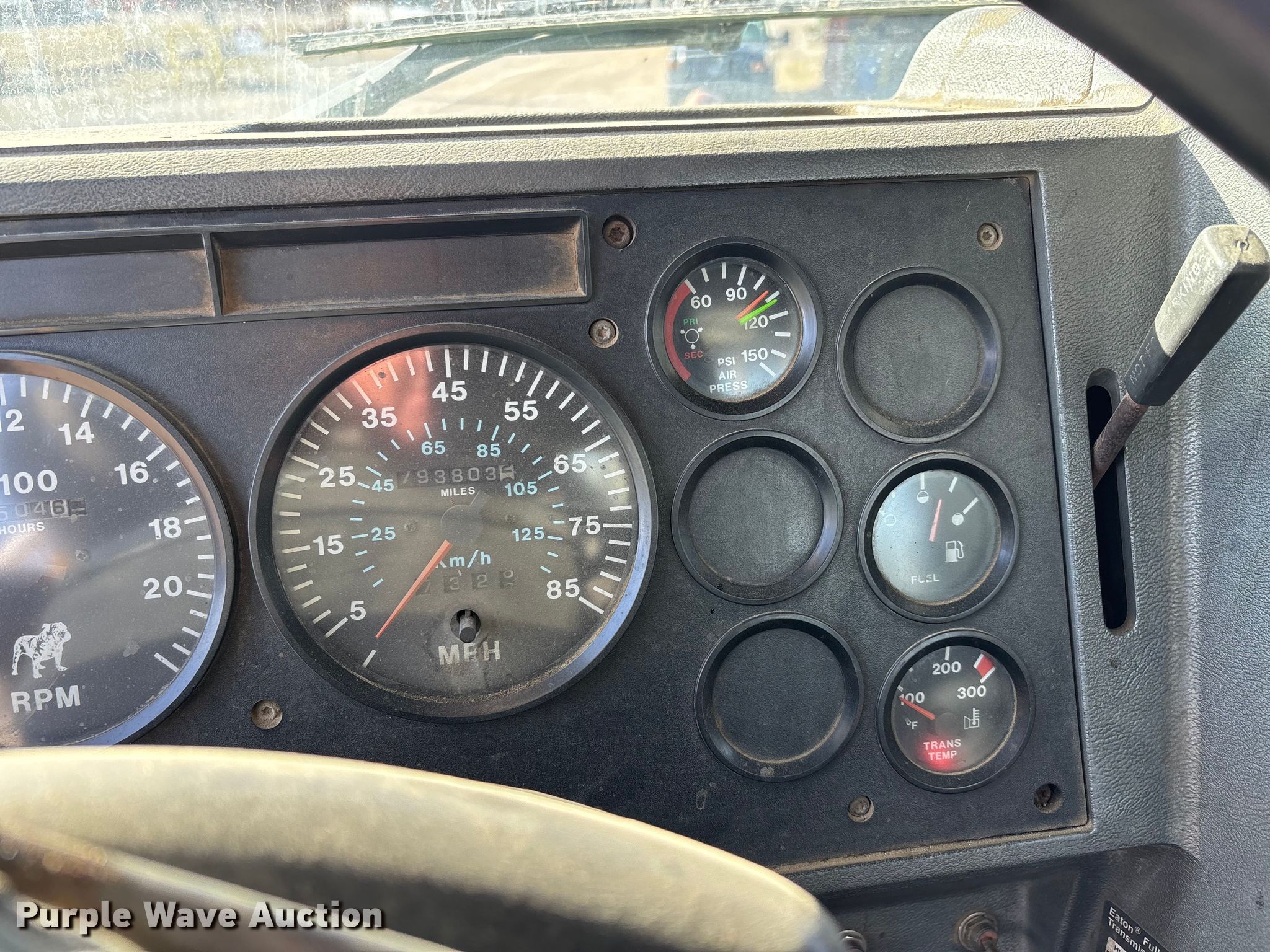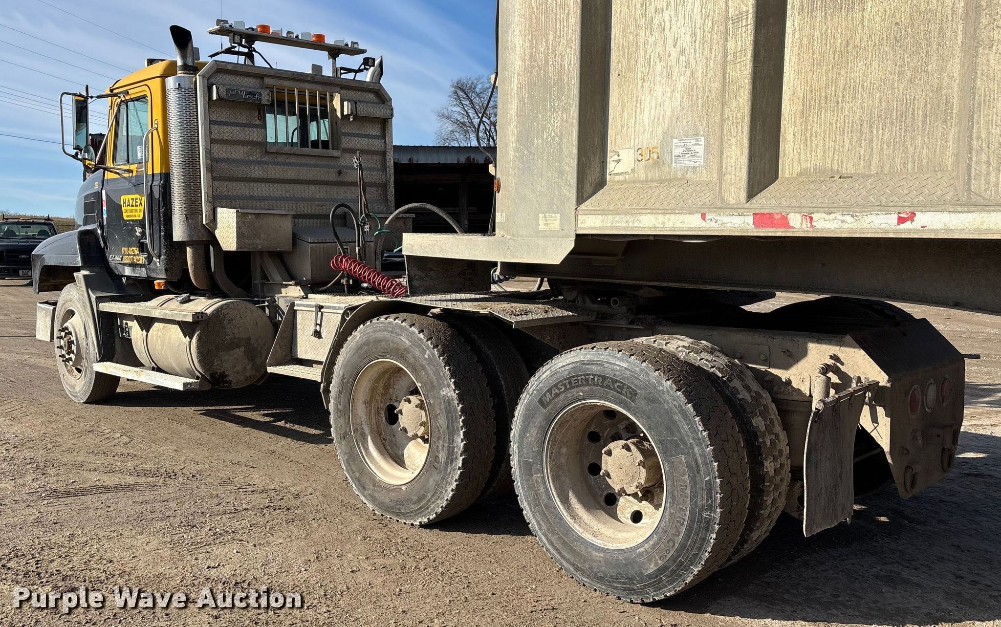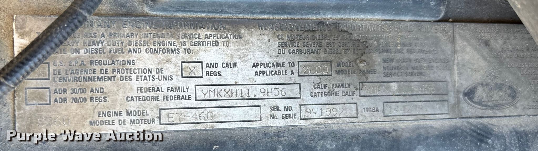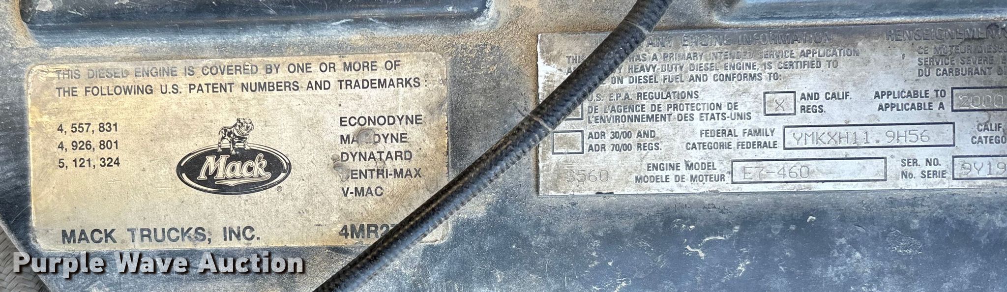 2000 Mack CH613 semi truck. Miles: 793,803 on odometer, Hours: 31,505 on meter, VIN: 1M2AA18Y4YW130885, Unit #: 222. Engine Mack E7-640, Serial: 9Y1992, Displacement: 12.0L, Cylinders: 6, Fuel type: Diesel, HP: 427. Transmission Eaton Fuller, Manual, Speed: 13. Chassis Axles: Tandem, Differential lock: Inter-axle, Suspension: Air Dump valves, Brakes: Air, PTO, Wet kit. Interior Heat, Air ride cab. Features Deck plate: Aluminum, Fifth wheel type: Air operated, Sliding, Fuel tank: Dual. Tires Size 11R24.5, 11R22.5. Notes Trailer not included, Frame damaged, cracked. Kentucky title. Title has a lien that will be released following the close of the auction. Title distribution may be delayed up to 30 days from verification of funds. HAZEX CONST CO. Henderson, KY 42420