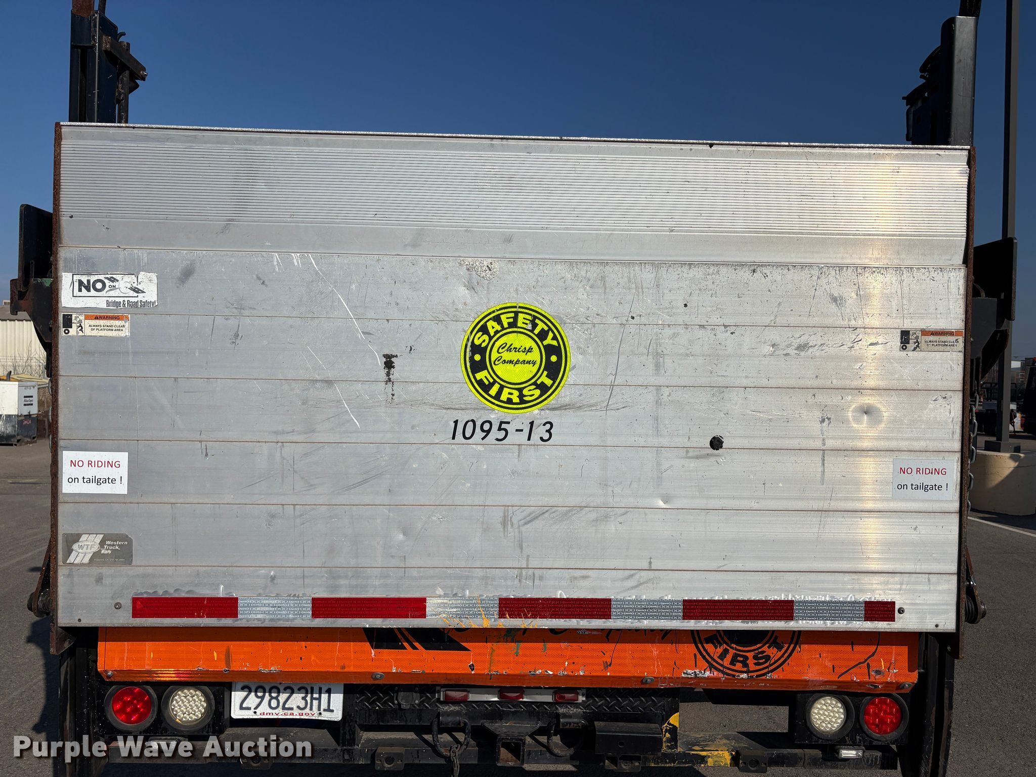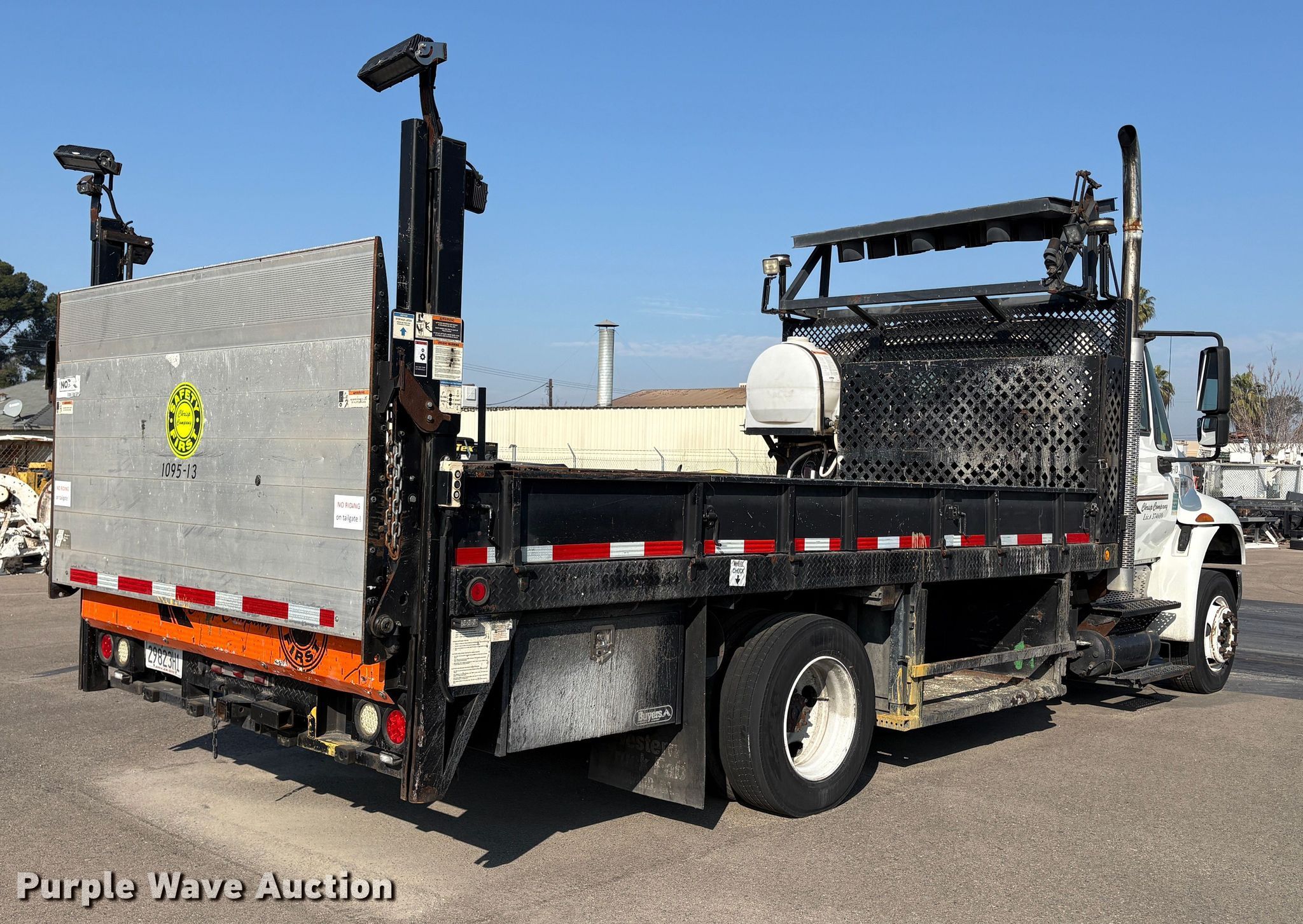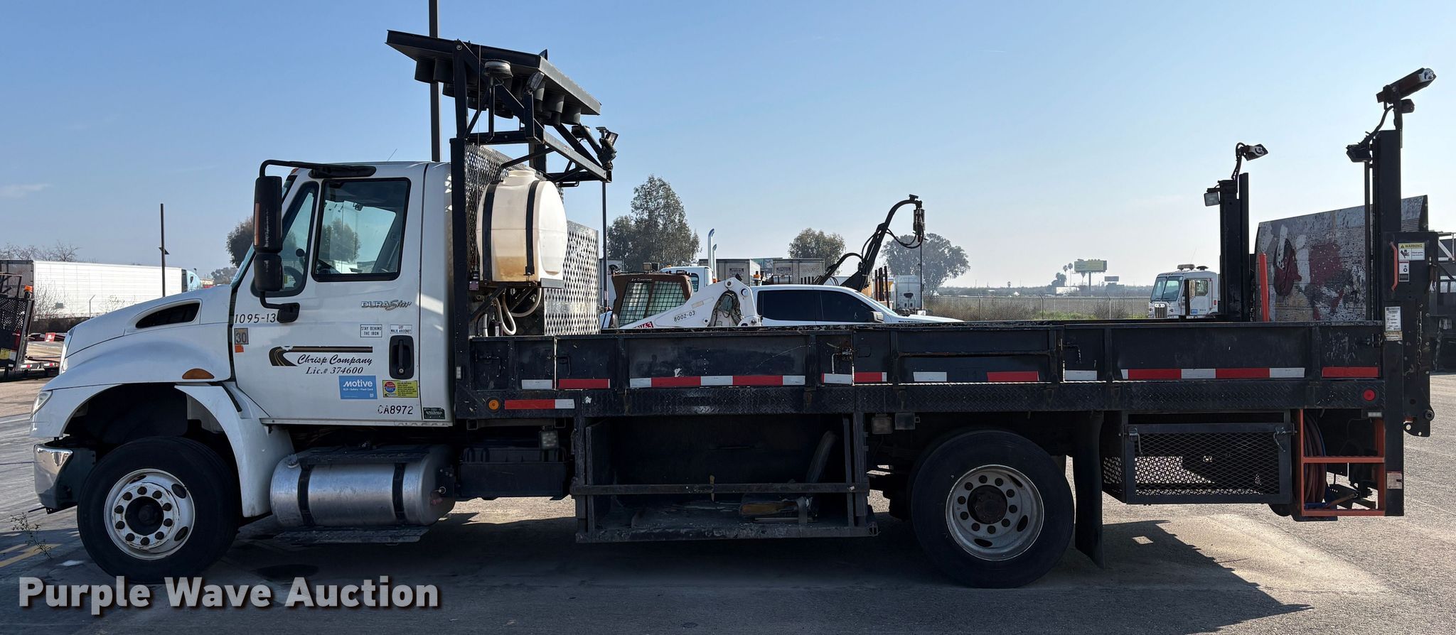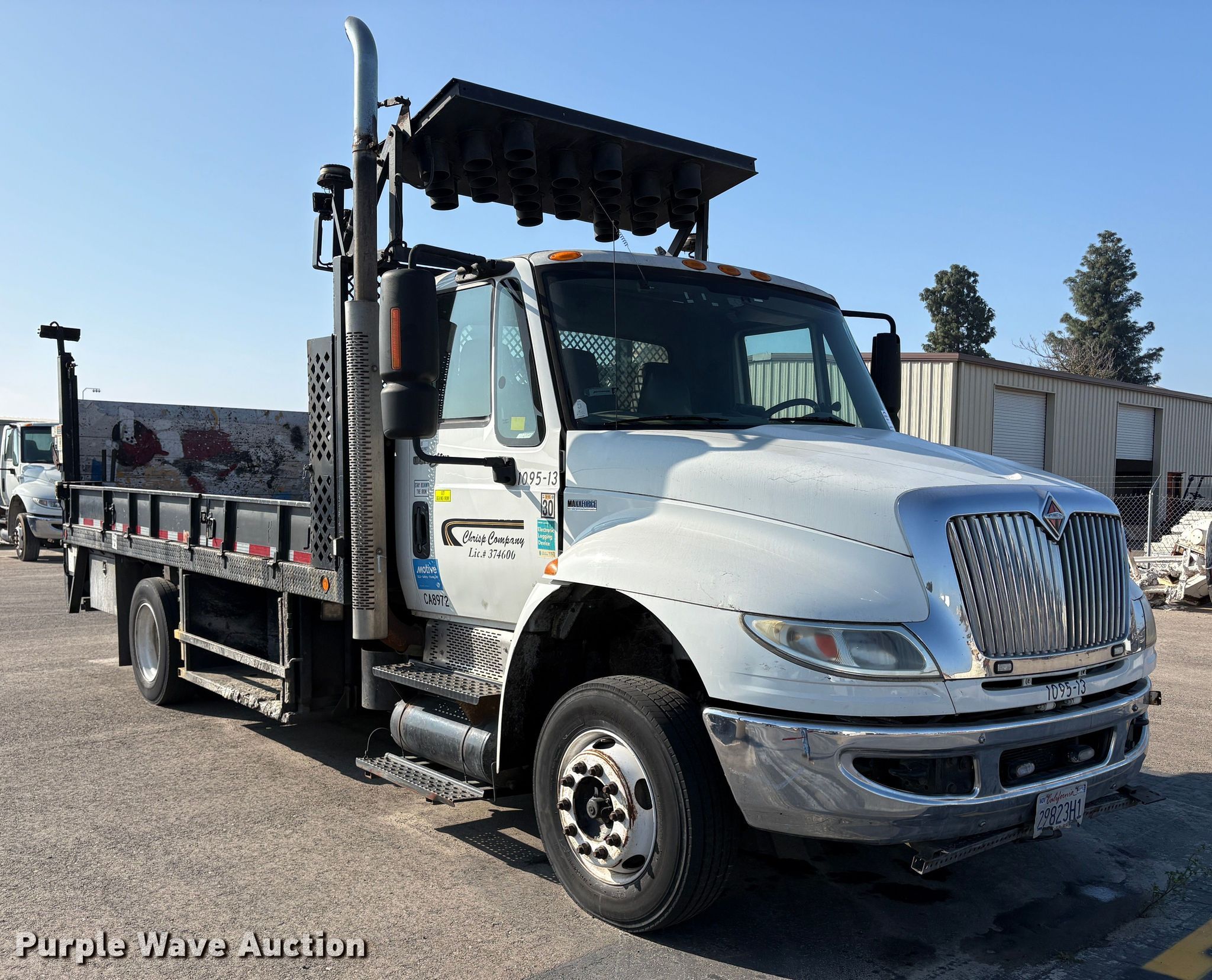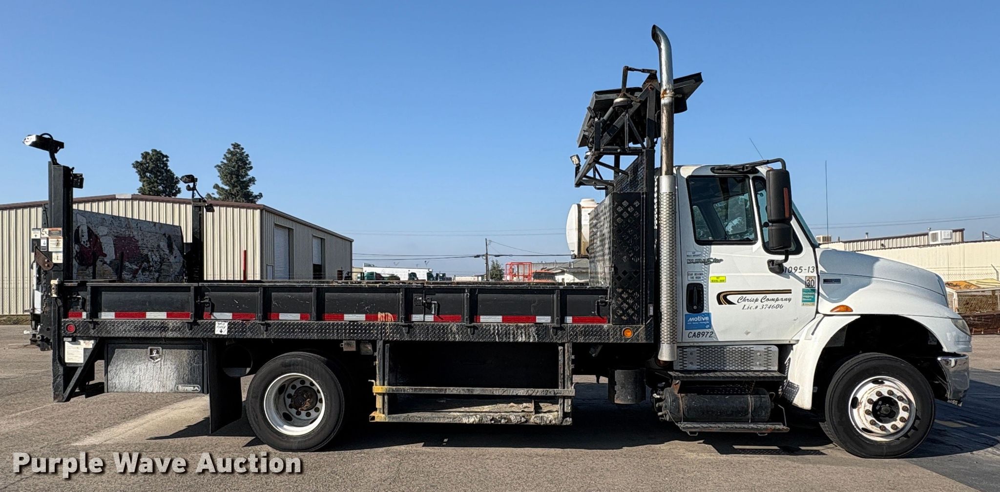 2013 International 4300 SBA flatbed truck. Miles: 179,433 on odometer, Hours: 13,733 on meter, VIN: 3HAMNAAL4DL303725. Engine Maxxforce DT, Displacement: 7.64L, Cylinders: 6, Fuel type: Diesel. Transmission Automatic. Chassis Axles: Single, Suspension: Spring, Brakes: Air, GVWR: 25,999 lbs. Interior AC, Heat, Power windows, Power locks, Auxiliary controls, Brake controller. Features Bed Flatbed, Length: 16', Width: 7' 6", End gate lift Palfinger ILM, Capacity: 1,600 lbs, Wanco arrow board. b]Tires Size: 265/70R19.5. Notes Dead battery, Non-operational engine, Non-operational unit. Buyer responsible for all aspects of state emissions compliance.. California title. Chrisp Company. Fresno, CA 93725