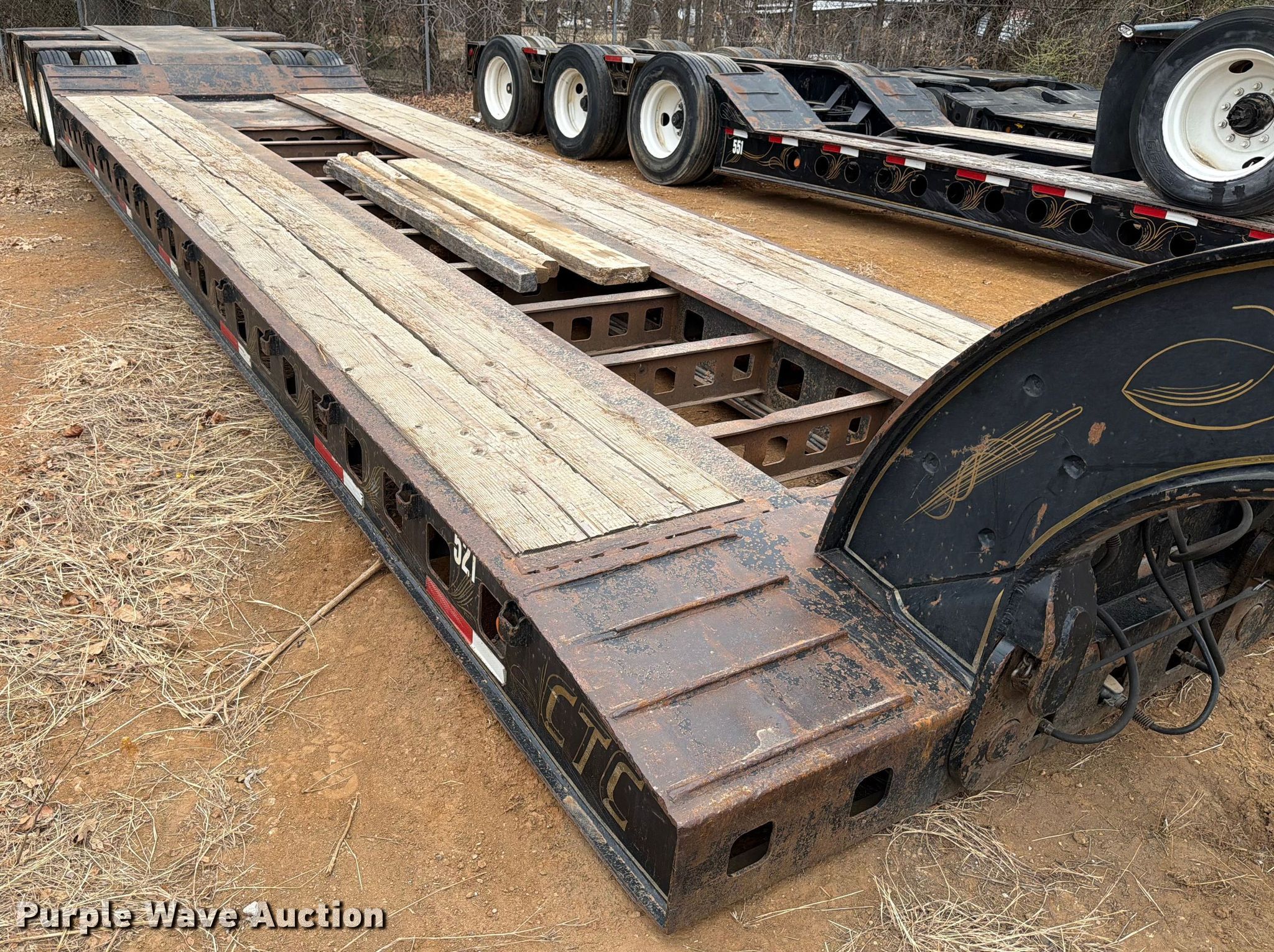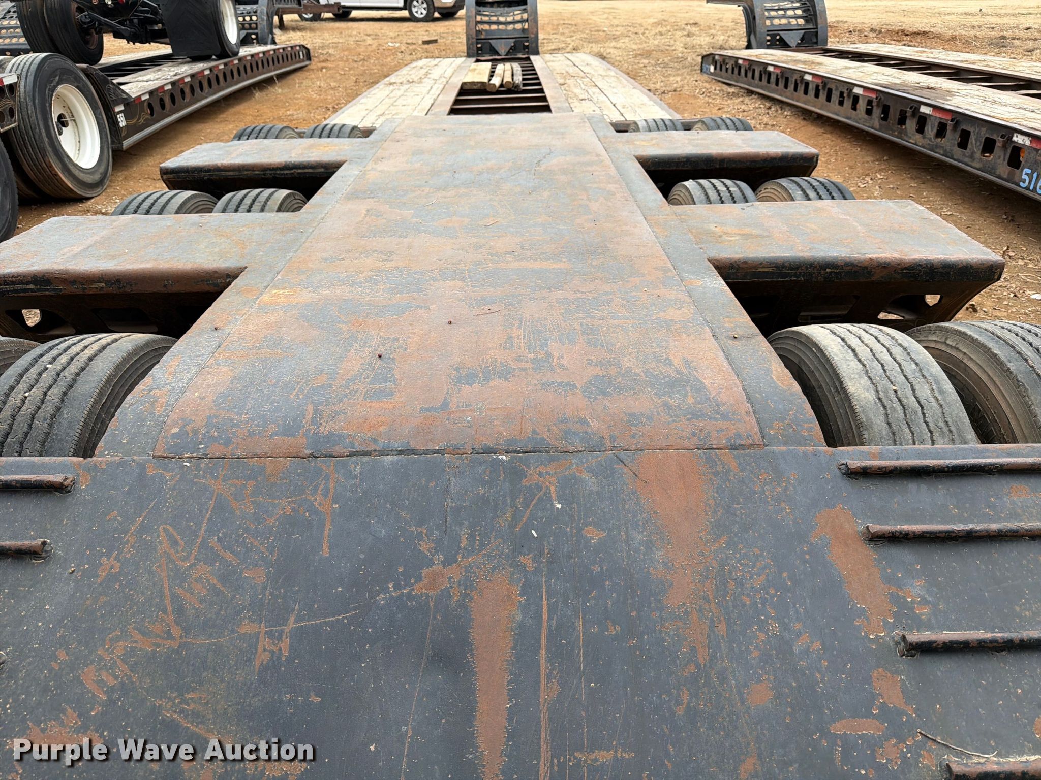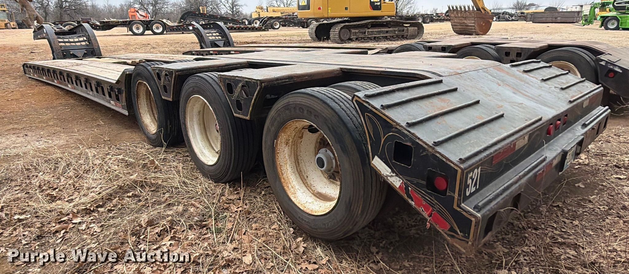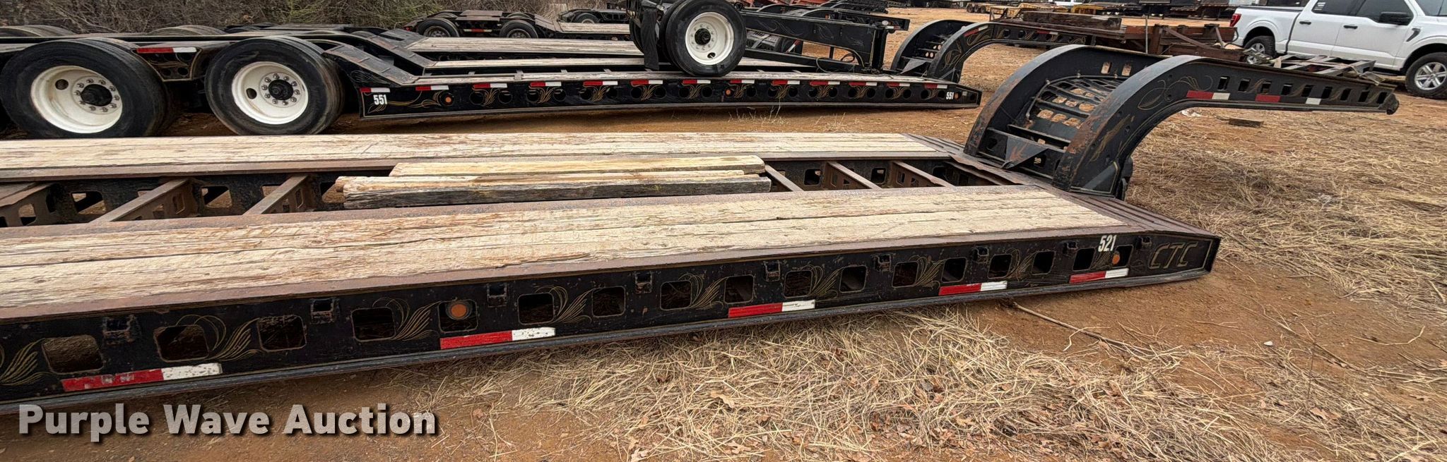 1986 Siebert lowboy equipment trailer. VIN: 1S9TH5234F1111137, Unit #: 521. Dimensions Overall Length: 52', Width: 102", Deck Length: 27', Width: 102", Rear deck length: 14' 9", Ramps: Manual, Lengths: 37", 30". Features Deck type: Steel, Wood, Neck type: Detachable. Chassis Suspension: Walking beam, Brakes: Air, Axles: Triple. Tires Steel wheels, Size: 255/70R22.5. Oklahoma title. Title distribution may be delayed up to 30 days from verification of funds. CTC Transportation. 3540 Euless South Main Street. Euless, TX 76040