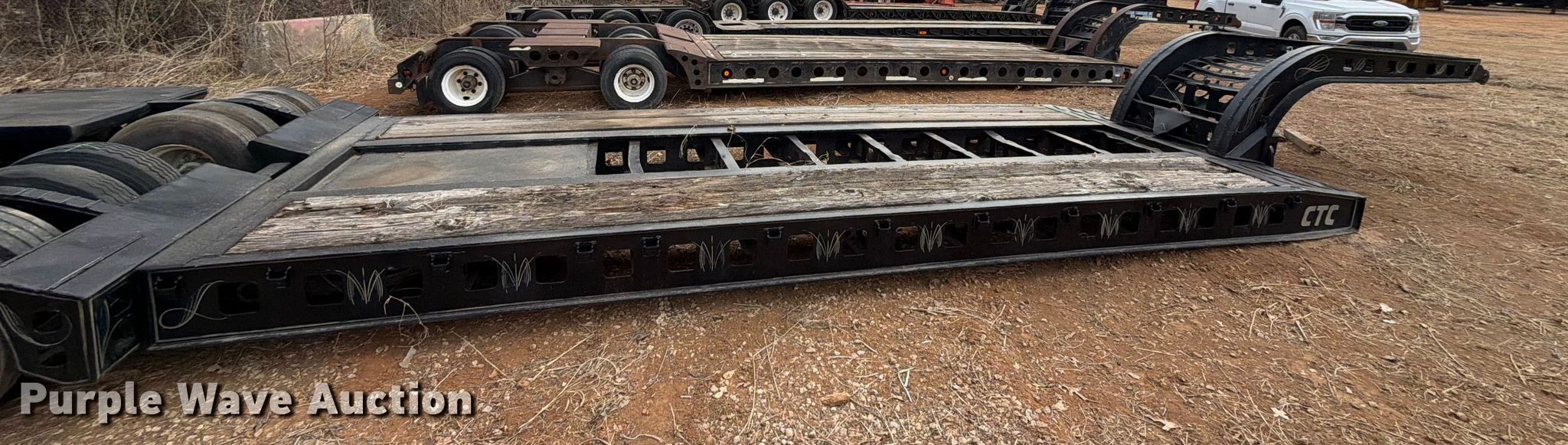 1984 Siebert lowboy equipment trailer. VIN: 1S9TH4220E1111507, Unit #: 537. Dimensions Overall Length: 42', Width: 120", Deck Length: 22' 6", Width: 102", Rear deck length: 11'. Features Deck type: Steel, Wood, Neck type: Detachable. Chassis Suspension: Walking beam, Brakes: Air, Axles: Tandem. Tires Steel wheels, Size: 245/70R17.5. Oklahoma title. Title distribution may be delayed up to 30 days from verification of funds. CTC Transportation. 3540 Euless South Main Street. Euless, TX 76040