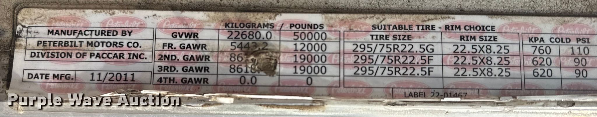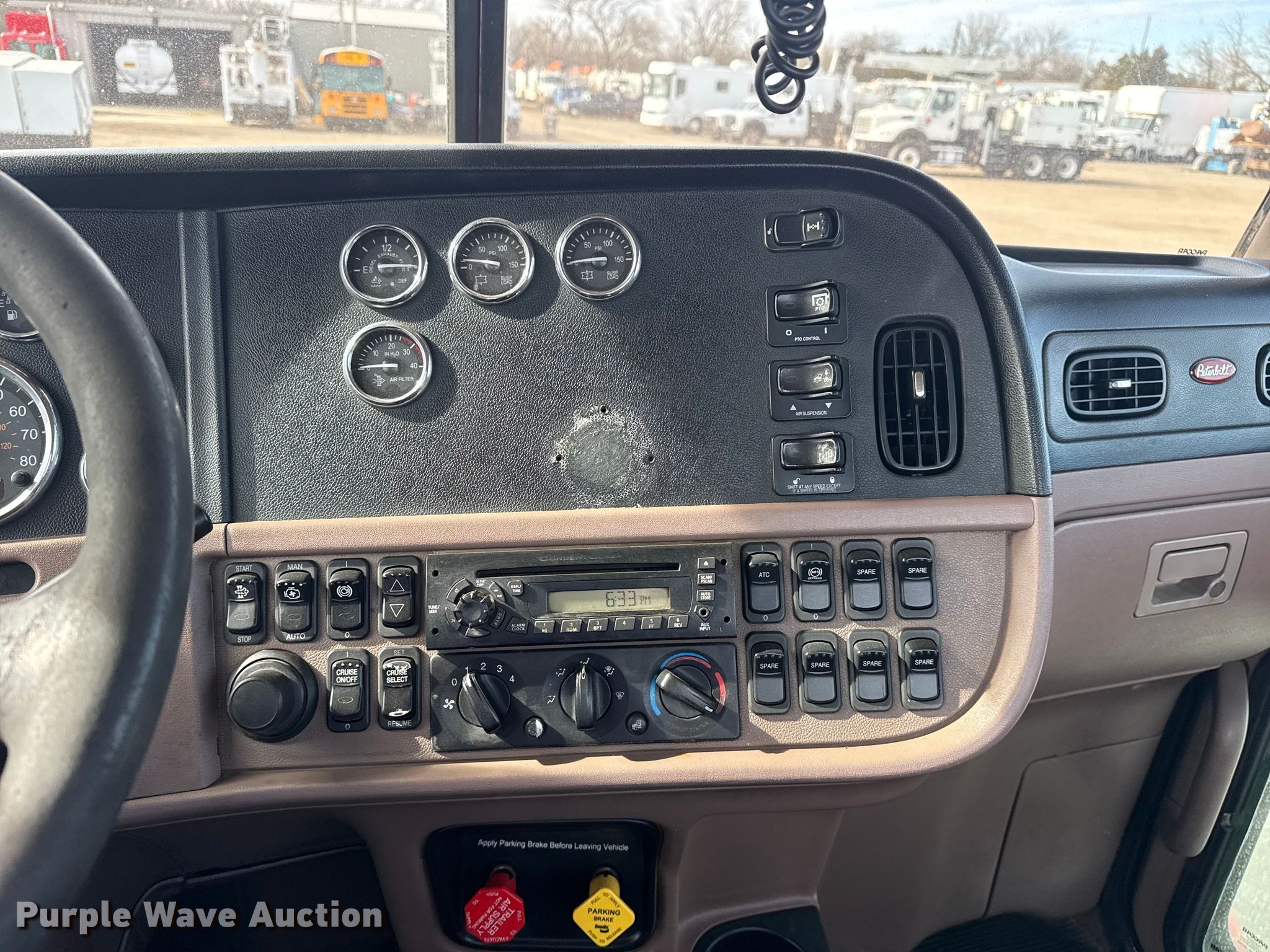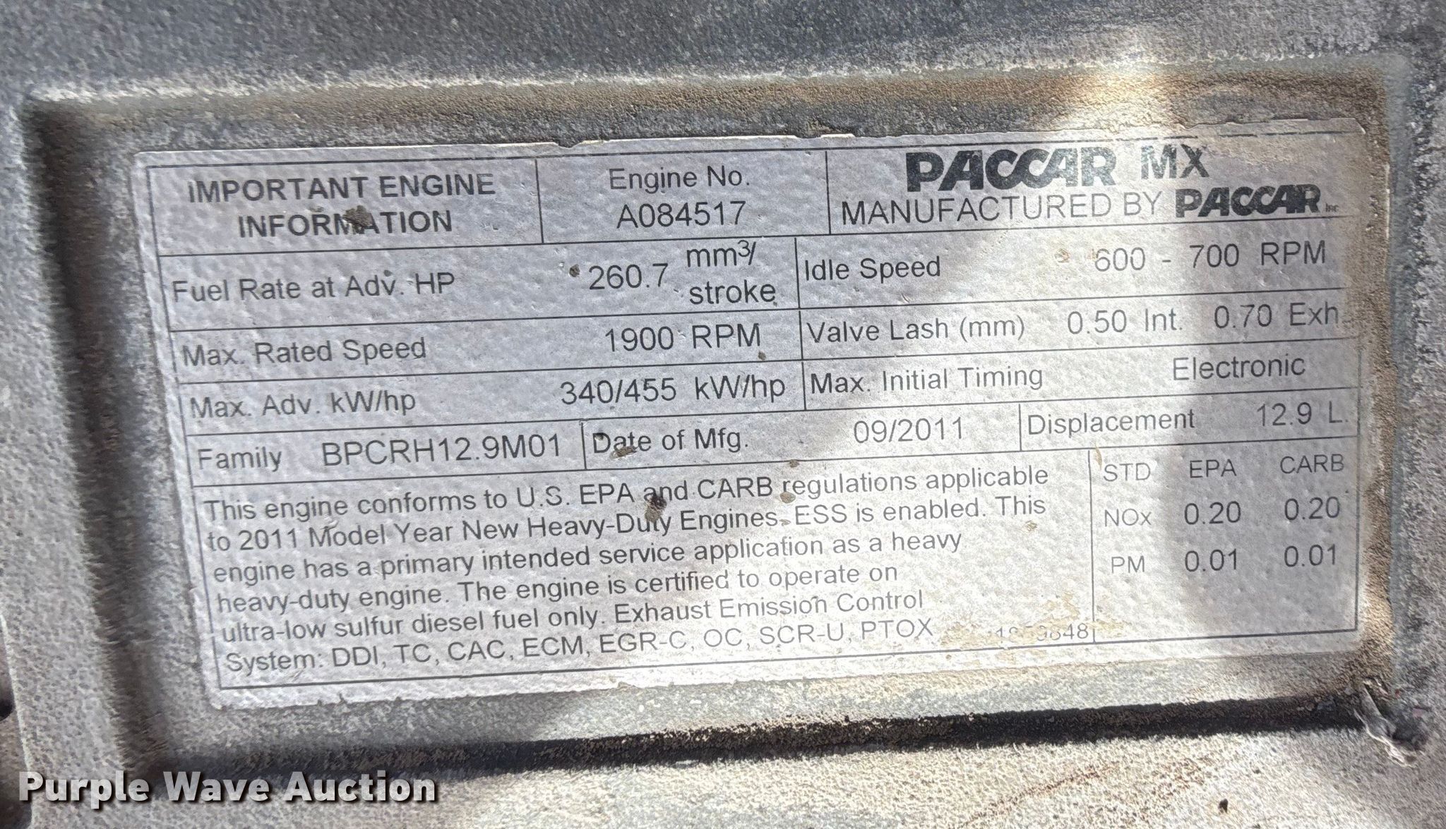 2012 Peterbilt 384 semi truck. Miles: 413,462 on odometer, Hours: 6,322 on meter, VIN: 1XPVDP9X4CD166004. Engine Paccar MX, Serial: A084517, Displacement: 12.9L, Cylinders: 6, Fuel type: Diesel, kW: 340. Transmission Eaton Fuller, Manual. Chassis Axles: Tandem, Differential lock: Inter-axle, Suspension: Air Dump valves, Brakes: Air, PTO, GVWR: 50,000 lbs FAWR: 12,000 lbs, IAWR: 19,000 lbs, RAWR: 19,000 lbs. Interior AC, Heat, Heated mirrors, Power windows, Power locks, Cruise control, Air ride cab. Features Fuel tank: Dual. Tires Size: 295/75R22.5. Notes Windshield chipped or cracked. Oklahoma title. Seller is an Oklahoma licensed motor vehicle dealer. Buyers may be required to provide identification to the licensed dealer to comply with state laws. Title will be assigned and distributed by the dealer. Please contact the seller for distribution questions. Title distribution may be delayed up to 30 days from verification of funds. Collinsville, OK 74021