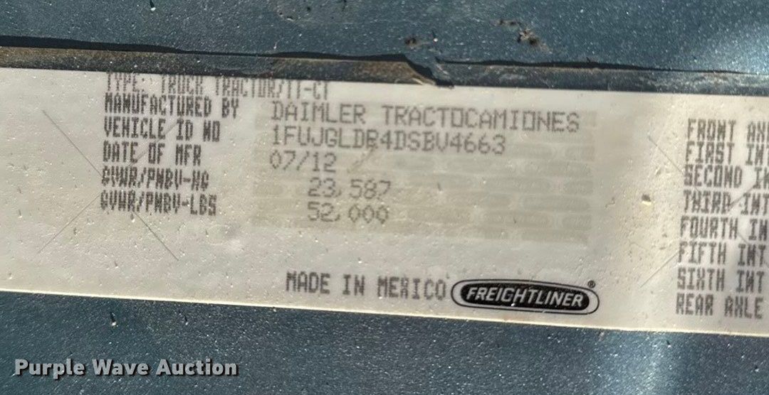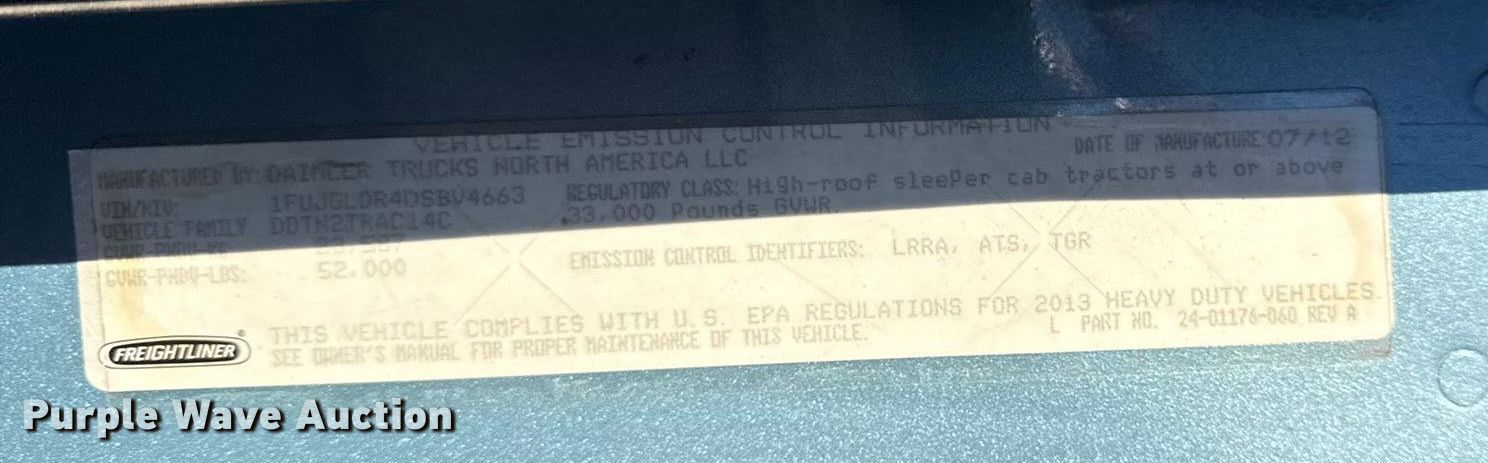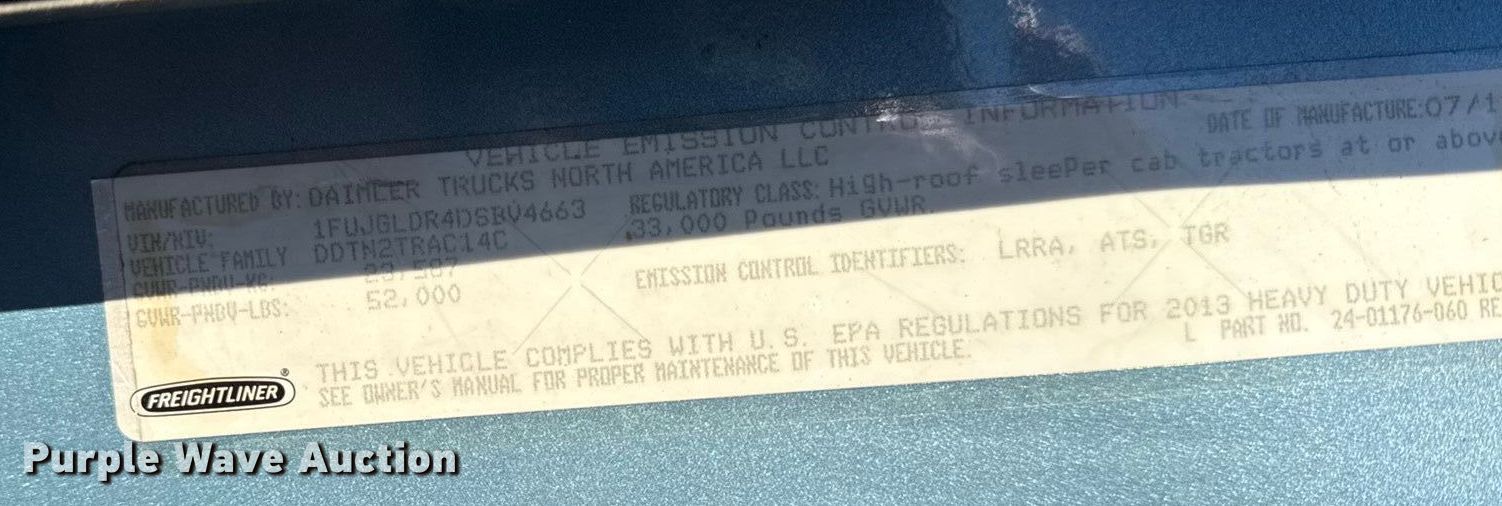 Purple Wave is selling a used Truck Tractor in Kansas. This item is a 2013 Freightliner Cascadia semi truck with the following: Miles: 1,015,224 on odometer, VIN: 1FUJGLDR4DSBV4663