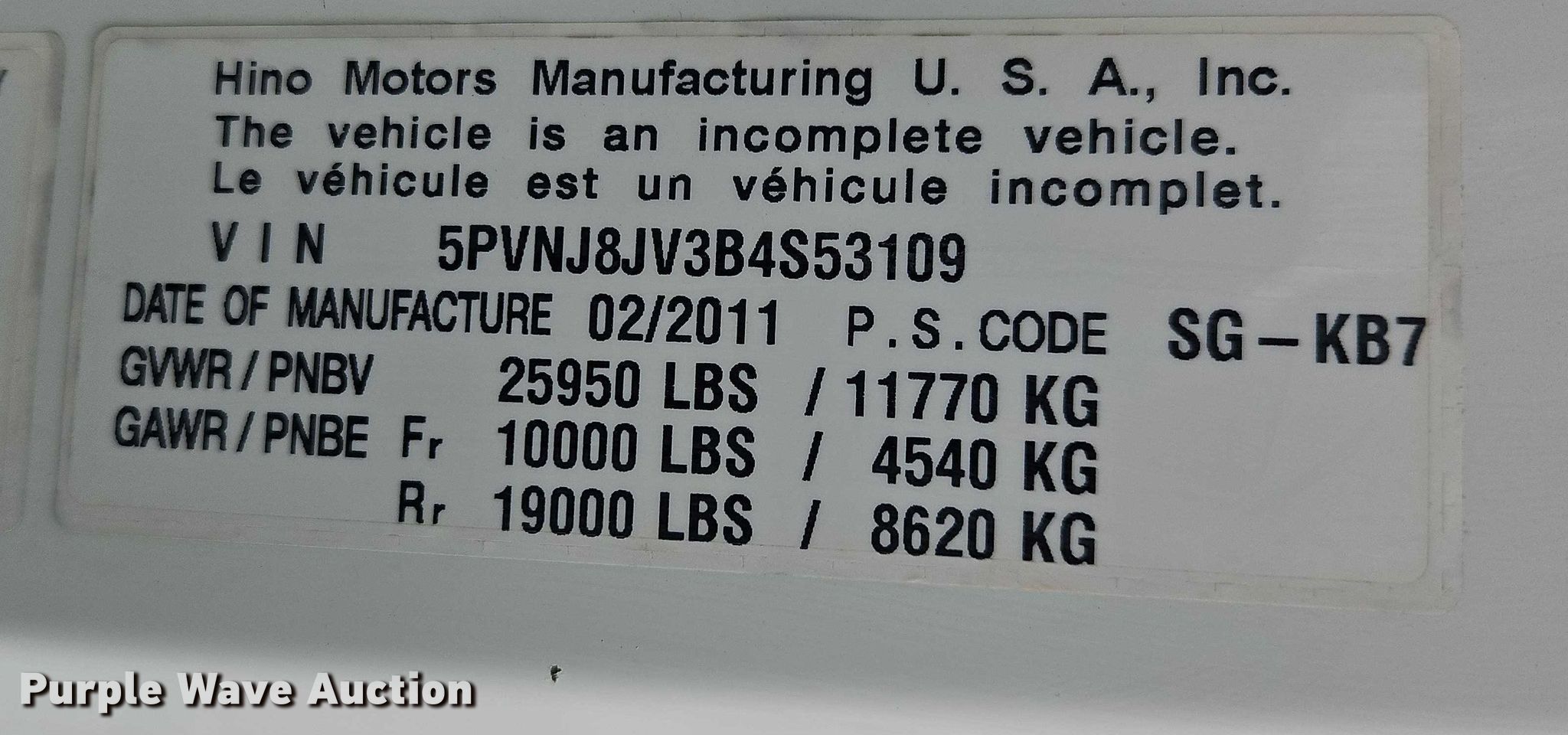 2011 Hino 268 box truck. Miles: 292,623 on odometer, VIN: 5PVNJ8JV3B4S53109. Engine Hino J08E-VC, Displacement: 7.6L, Fuel type: Diesel. Transmission Automatic. Chassis Axles: Single, Suspension: Air, Brakes: Air, GVWR: 25,950 lbs. Interior AC, Heat, Heated mirrors, Power windows, Cruise control. Features Bed Box bed, KT MV26102, Serial: TB11185, Length: 26', Width: 102", Height: 13', E-track rail system, Floor: Wood, Slider ramp 30". Tires Size: 255/70R19.5. Missouri title. Seller is a Missouri licensed motor vehicle dealer. The buyer may be required to pay sales tax and/or registration fees to the dealer prior to taking possession. Buyers may be required to provide identification to the licensed dealer to comply with state laws. Title will be assigned and distributed by the dealer. Please contact the seller for distribution questions. Title distribution may be delayed up to 30 days from verification of funds. Interstate 49 Truck Center. Grandview, MO 64030