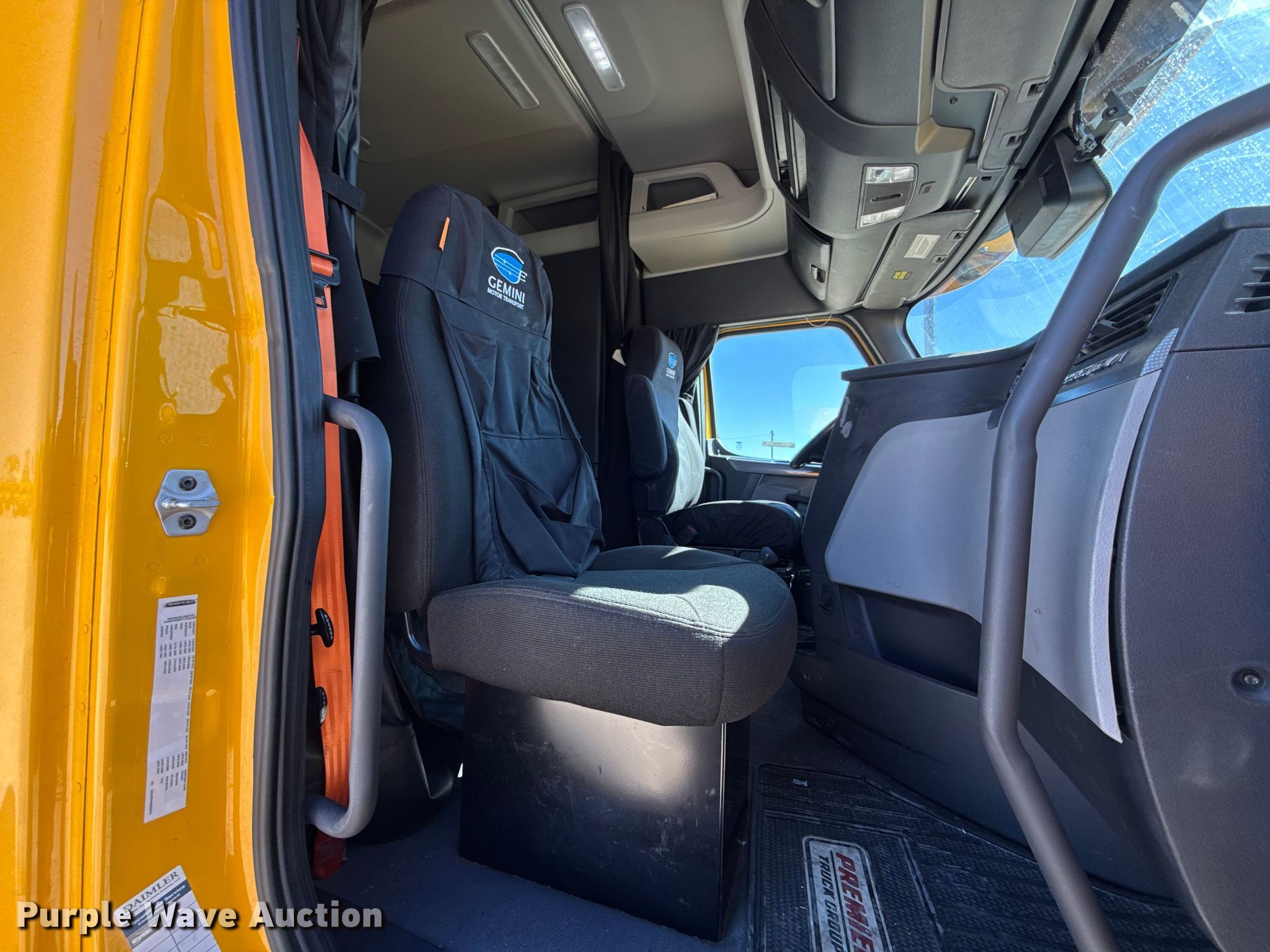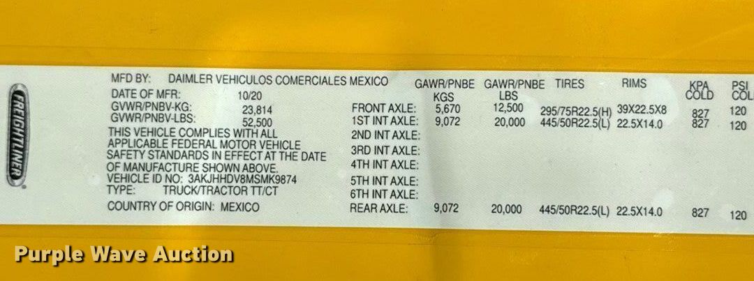 2021 Freightliner Cascadia 126 semi truck. Miles: 467,264 on odometer, Hours: 22,157 on meter, VIN: 3AKJHHDV8MSMK9874, Unit #: 21135. Engine Detroit Diesel DD13, Serial: 471928S0805646, Displacement: 12.8L, Cylinders: 6, Fuel type: Diesel, HP: 450, Engine brake. Transmission Automated manual. Chassis Axles: Tandem, Differential lock: Inter-axle, Suspension: Air Dump valves, Brakes: Air, GVWR: 52,500 lbs FAWR: 12,500 lbs, IAWR: 20,000 lbs, RAWR: 20,000 lbs, Wheelbase: 229". Interior AC, Heat, Heated mirrors, Power windows, Power locks, Cruise control, Air ride cab, Sleeper Sleeper length: 64", Beds: Single, Refrigerator, Rear climate control. Features Deck plate: Aluminum, Fifth wheel type: Fixed, Fuel tank: Dual. Tires Front: 295/75R25, Rear: 445/50R22.5. Notes Dash warning indicator: Traction control, Windshield chipped or cracked, Jump start required during on-site data collection. Oklahoma title. Title distribution may be delayed up to 30 days from verification of funds. Gemini Motor Transport. Oklahoma City, OK 73127