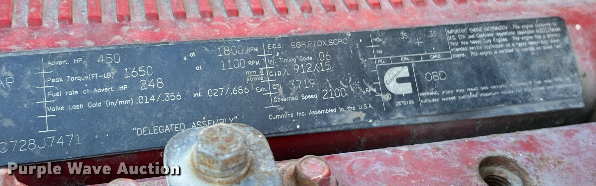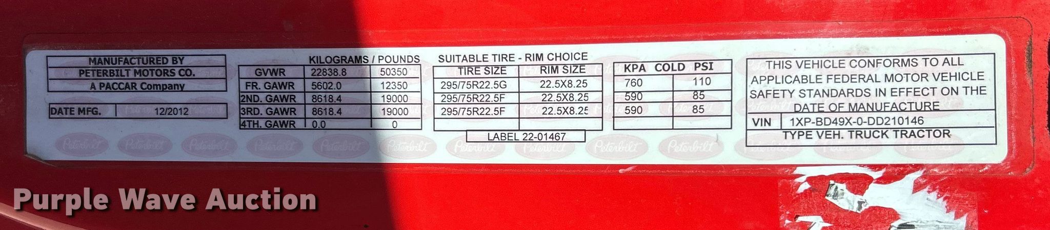 2013 Peterbilt 579 semi truck. Miles: 808,390 on odometer, Hours: 26,680 on meter, VIN: 1XPBD49X0DD210146. Engine Cummins ISX15 450, Displacement: 15.0L, Cylinders: 6, Fuel type: Diesel, Engine brake. Transmission Eaton Fuller, Manual, Speed: 13. Chassis Axles: Tandem, Differential lock: Inter-axle, Suspension: Air, Brakes: Air, GVWR: 50,350 lbs FAWR: 12,350 lbs, IAWR: 19,000 lbs, RAWR: 19,000 lbs. Interior AC, Heat, Heated mirrors, Power windows, Power locks, Cruise control, Air ride cab, Sleeper Sleeper length: 60", Beds: Single, Refrigerator, Rear climate control. Features Deck plate: Aluminum, Fifth wheel type: Air operated, Sliding, Fuel tank: Dual. Tires Size: 295/75R22.5. Notes Windshield chipped or cracked, Dead battery, Jump start required during on-site data collection, Possible secondary air issues, bleeds off, Non-operational passenger door, does not open. Missouri title. Title distribution may be delayed up to 14 days from verification of funds. Bourbon, MO 65441