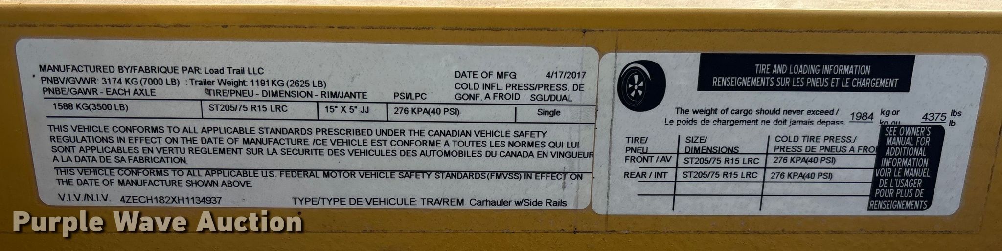 Purple Wave is selling a used Car or Utility Trailer in Missouri. This item is a 2017 Load Trail utility trailer with the following: VIN: 4ZECH182XH1134937