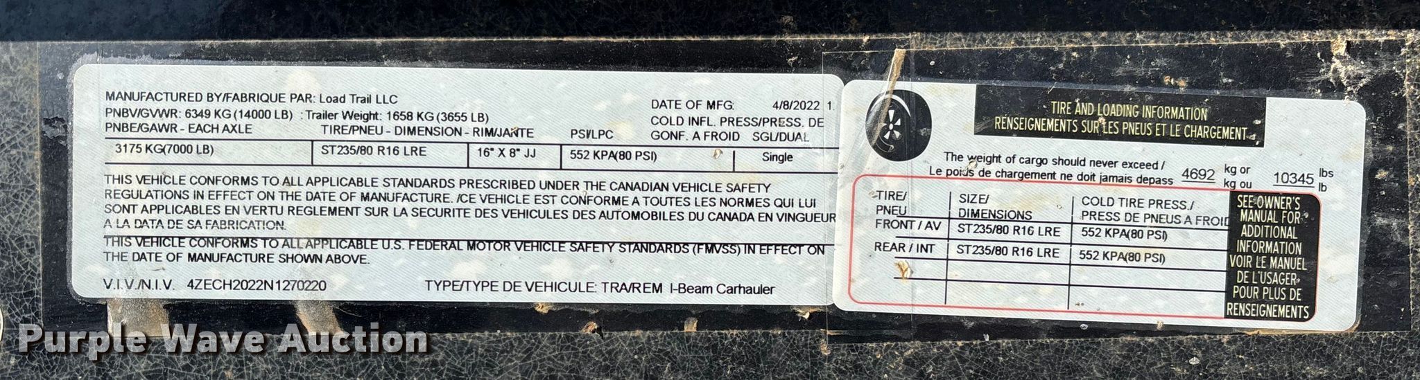 Purple Wave is selling a used Car or Utility Trailer in Missouri. This item is a 2022 Load Trail utility trailer with the following: VIN: 4ZECH2022N1270220