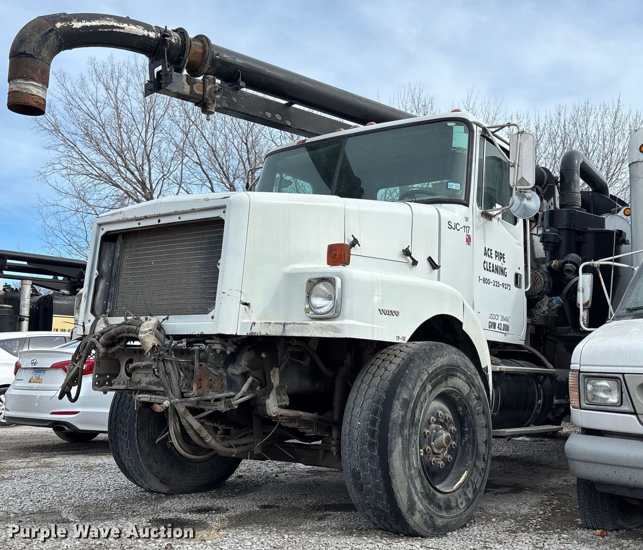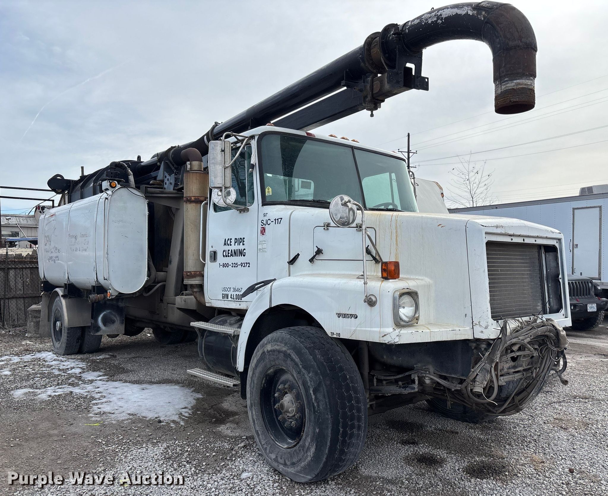 1997 Volvo WG vacuum truck. Miles: Unknown, VIN: 4VHJAKFE2VN859121. Engine Volvo, Displacement: 6.7L, Cylinders: 6, Fuel type: Diesel. Transmission Allison, Automatic. Chassis Axles: Single, Differential lock: Inter-axle, Suspension: Spring, Brakes: Air, GVWR: 43,000 lbs. Interior Heat. Features Bed Tank bed, Rear outlet: 6". Tires Front: 425/65R22.5, Rear: 11R22.5. Notes Dead battery, Parts missing, Non-operational unit, Unit must be towed or hauled. Missouri title. Mileage has not been verified. Exempt will be written in the odometer disclosure on the title. Title distribution may be delayed up to 14 days from verification of funds. Ace Pipe Cleaning, Inc.. Kansas City, MO 64120