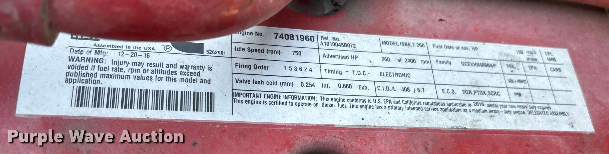2017 Autocar Xpert truck cab and chassis. Miles: 108,022 on odometer, VIN: 516M1DBDXHH223739. Engine Cummins ISB6.7 260, Displacement: 6.7L, Cylinders: 6, Fuel type: Diesel, Engine brake. Transmission Automated manual. Chassis Axles: Single, Gear ratio: 6.14, Suspension: Air Dump valves, Brakes: Air, Truck chassis: 20' 6", GVWR: 33,000 lbs FAWR: 12,000 lbs, RAWR: 21,000 lbs, Wheelbase: 183". Interior AC, Heat, Heated mirrors, Power windows, Cruise control, Auxiliary controls. Features Fuel tank: Single. Tires Size: 11R22.5. Notes Dash warning indicator: Check engine, ABS, Transmission. Buyer responsible for all aspects of state emissions compliance.. California title. Title distribution may be delayed up to 30 days from verification of funds. Chrisp Company. Bloomington, CA 92316