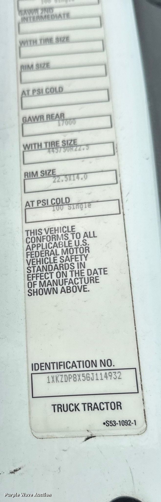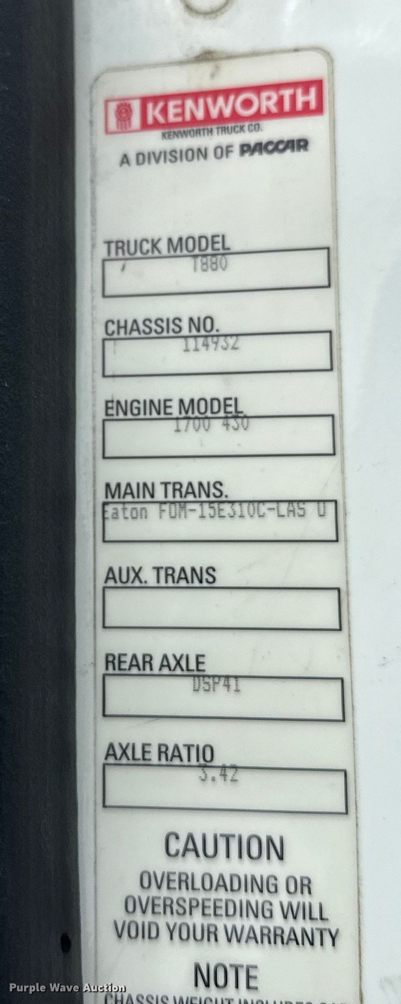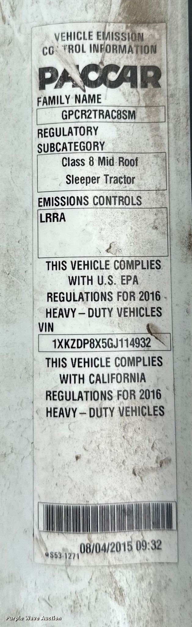 2016 Kenworth T880 semi truck. Miles: 851,802 on odometer, Hours: 18,838 on meter, VIN: 1XKZDP8X5GJ114932. Engine Paccar MX-13, Displacement: 12.9L, Cylinders: 6, Fuel type: Diesel, Engine brake. Transmission Eaton Fuller, Automatic. Chassis Axles: Tandem, Differential lock: Inter-axle, Suspension: Air Dump valves, Brakes: Air, GVWR: 46,000 lbs. Interior AC, Heat, Heated mirrors, Power windows, Power locks, Cruise control, Air ride cab, Sleeper Sleeper length: 44", Beds: Single, Rear climate control. Features Deck plate: Aluminum, Fifth wheel type: Air operated, Sliding, Fuel tank: Single. Tires Front: 11R22.5, Rear: 445/65R22.5. Notes Dash warning indicator: Check engine, Regen warning. Minnesota title. Title distribution may be delayed up to 30 days from verification of funds. CHS, Inc.. Rosemount, MN 55068